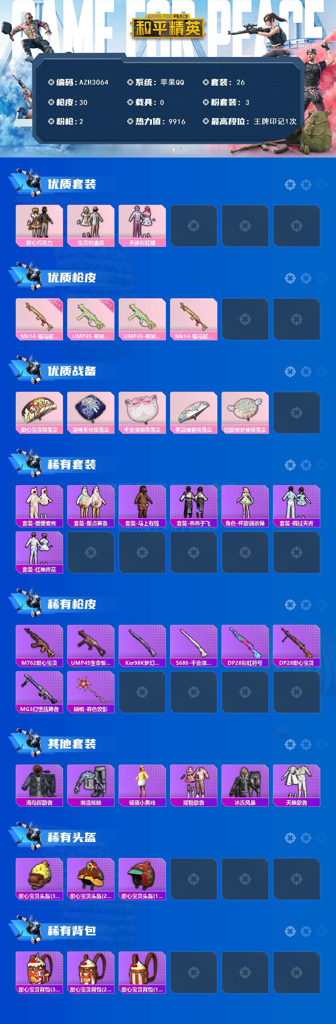 【AZH3064】苹果 手Q【巧克力三姐妹 暖暖麦兜】3粉装-2特效枪-0载具-0粉色飞行器-9916热力值-1王牌印记-26套装-30枪皮