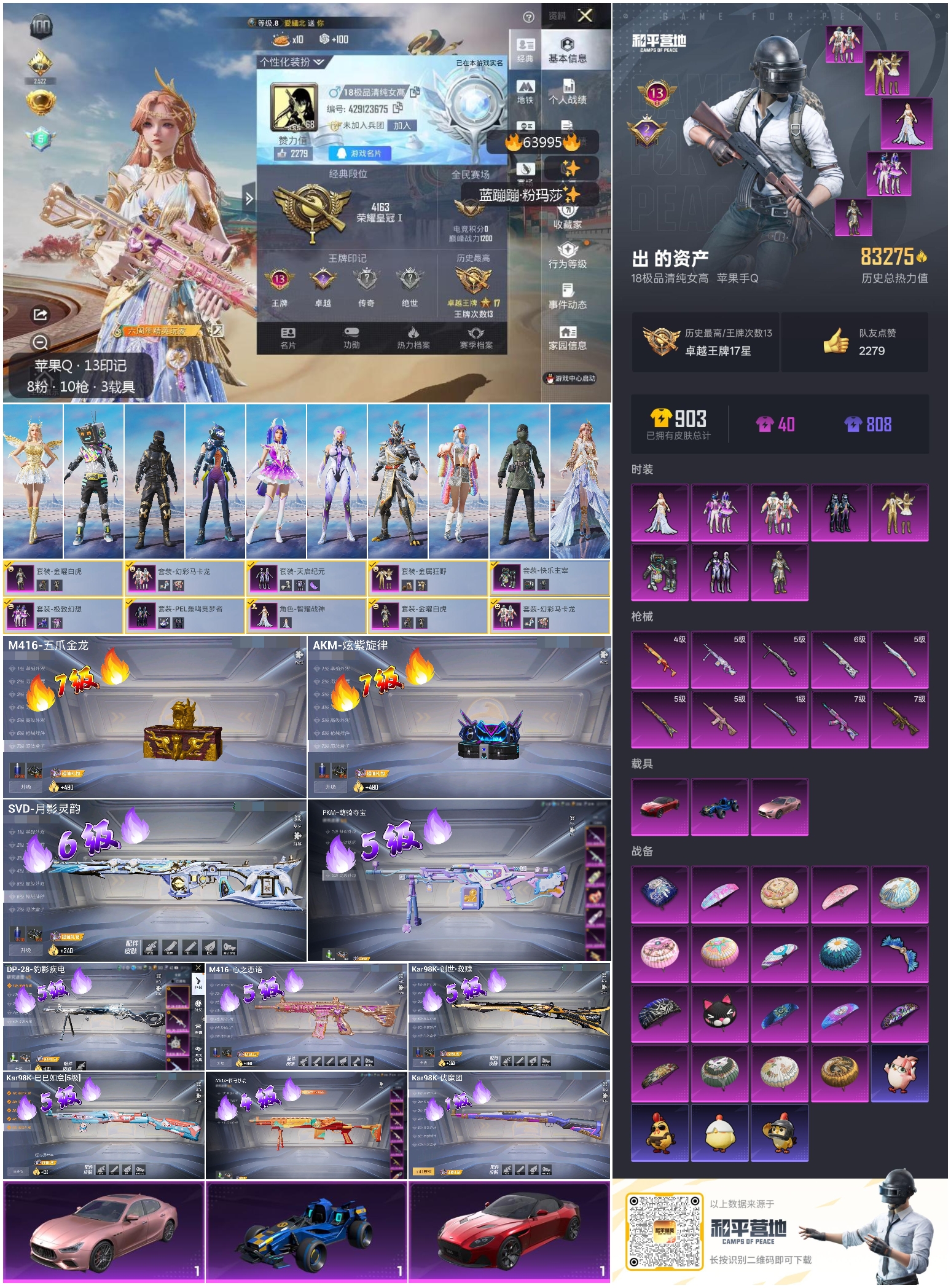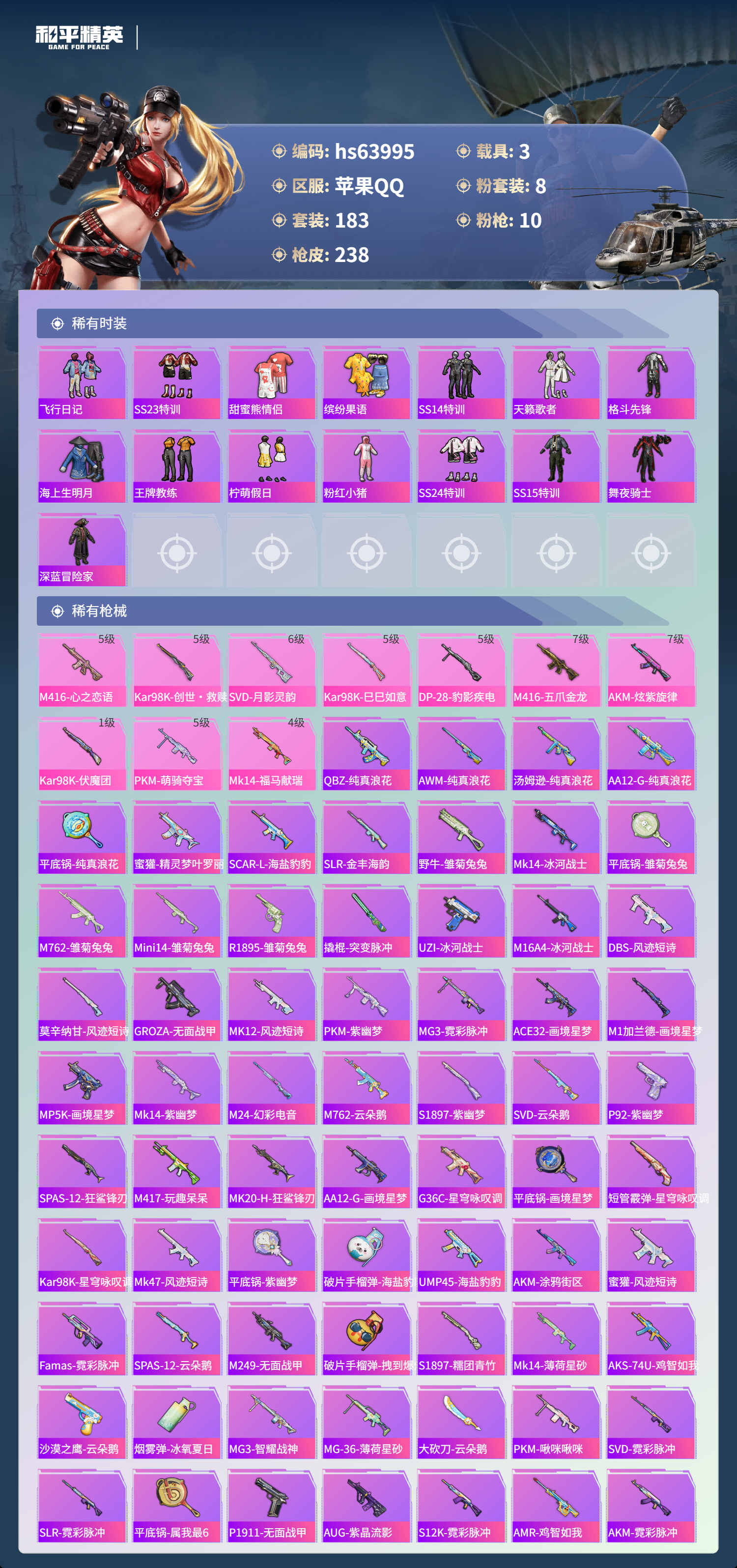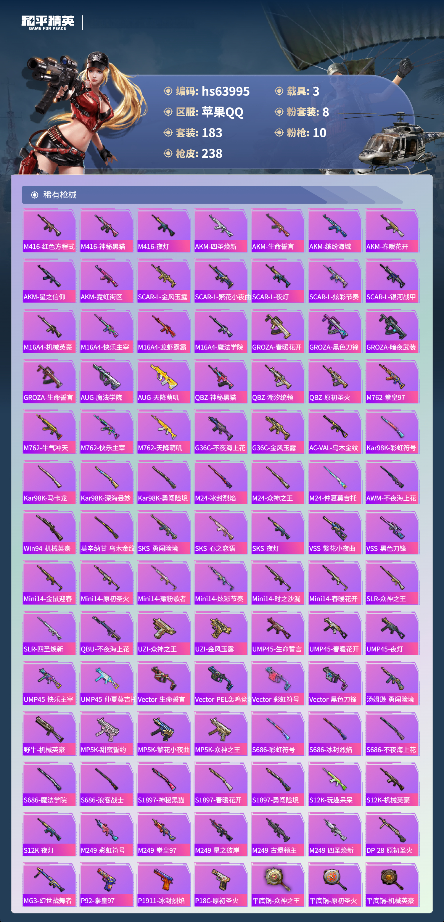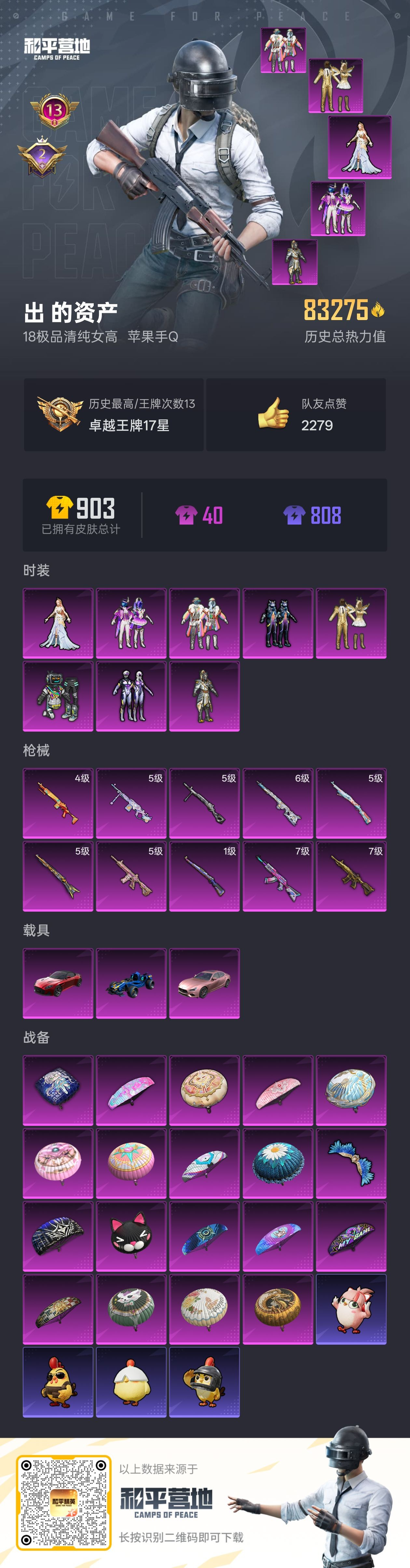 hs63995 苹果手Q-13王牌印记-8粉装-10特效枪-3载具-83275热力值-183套装-238枪皮-2卓越印记