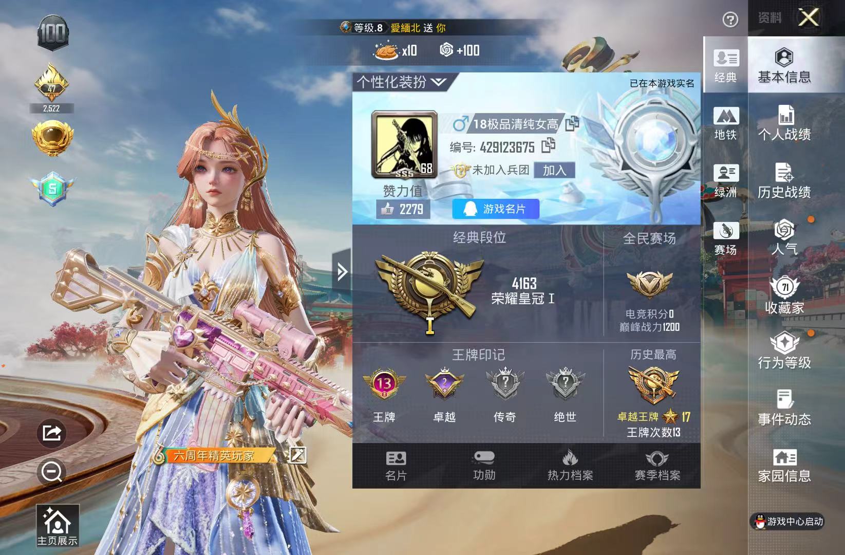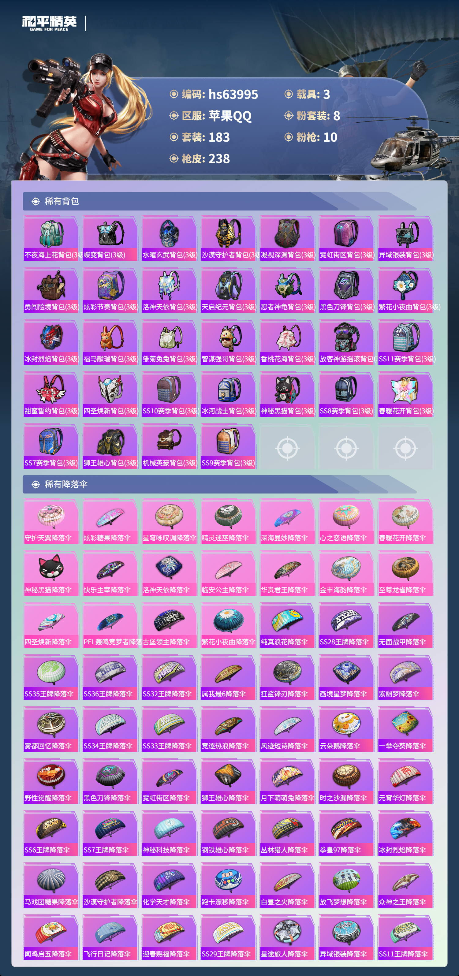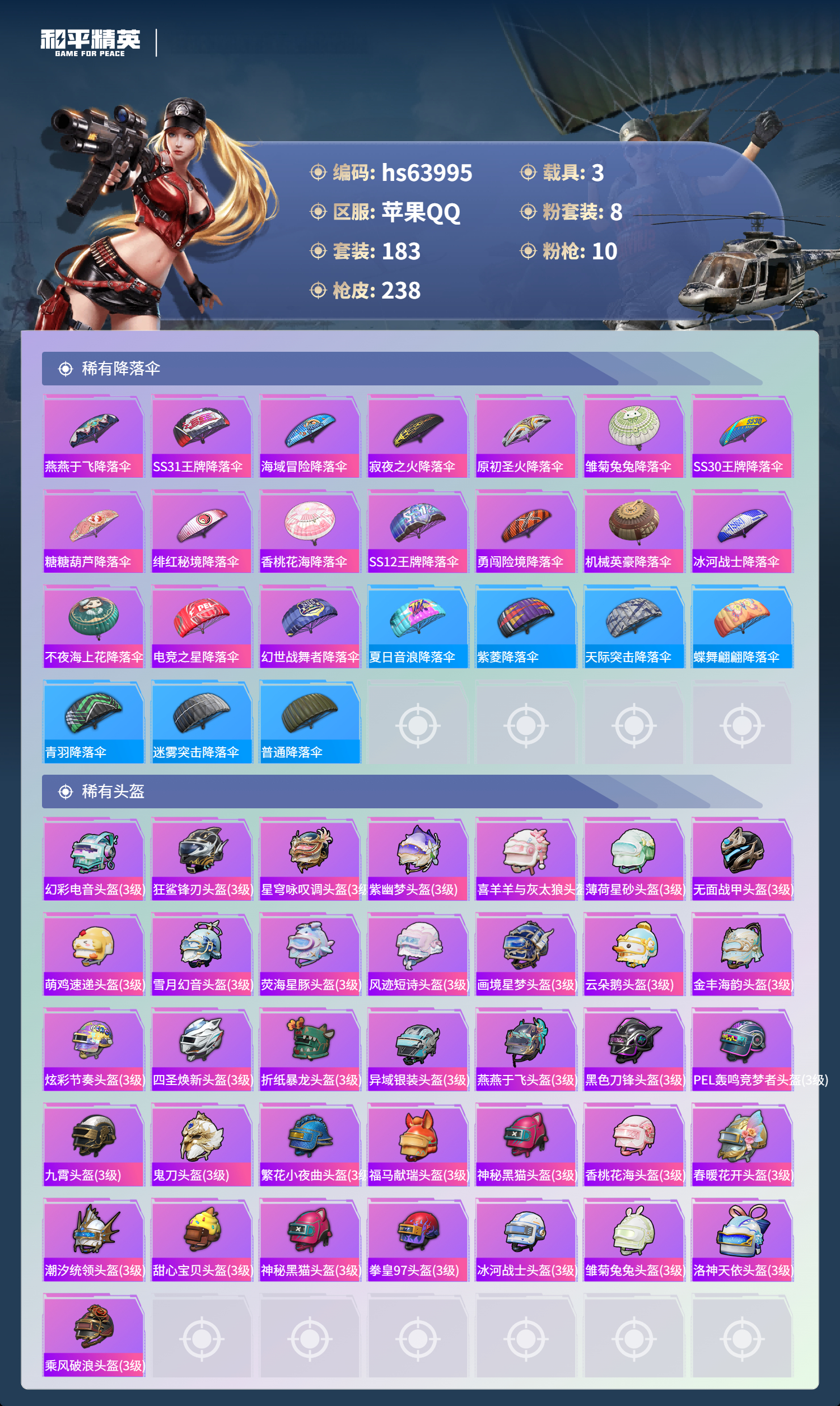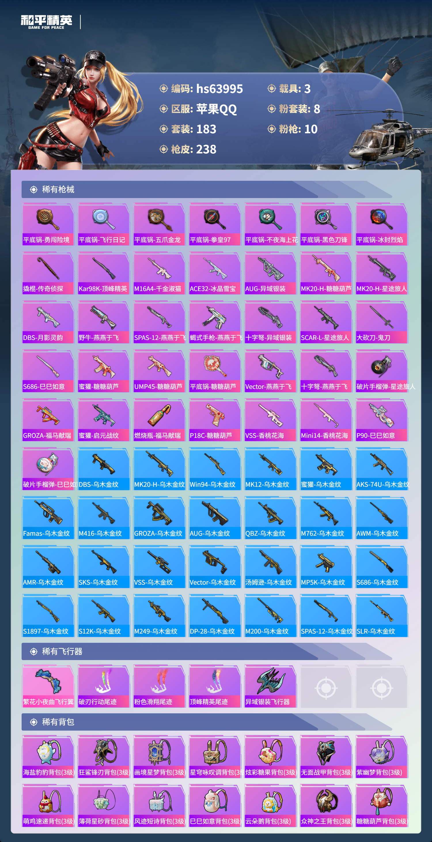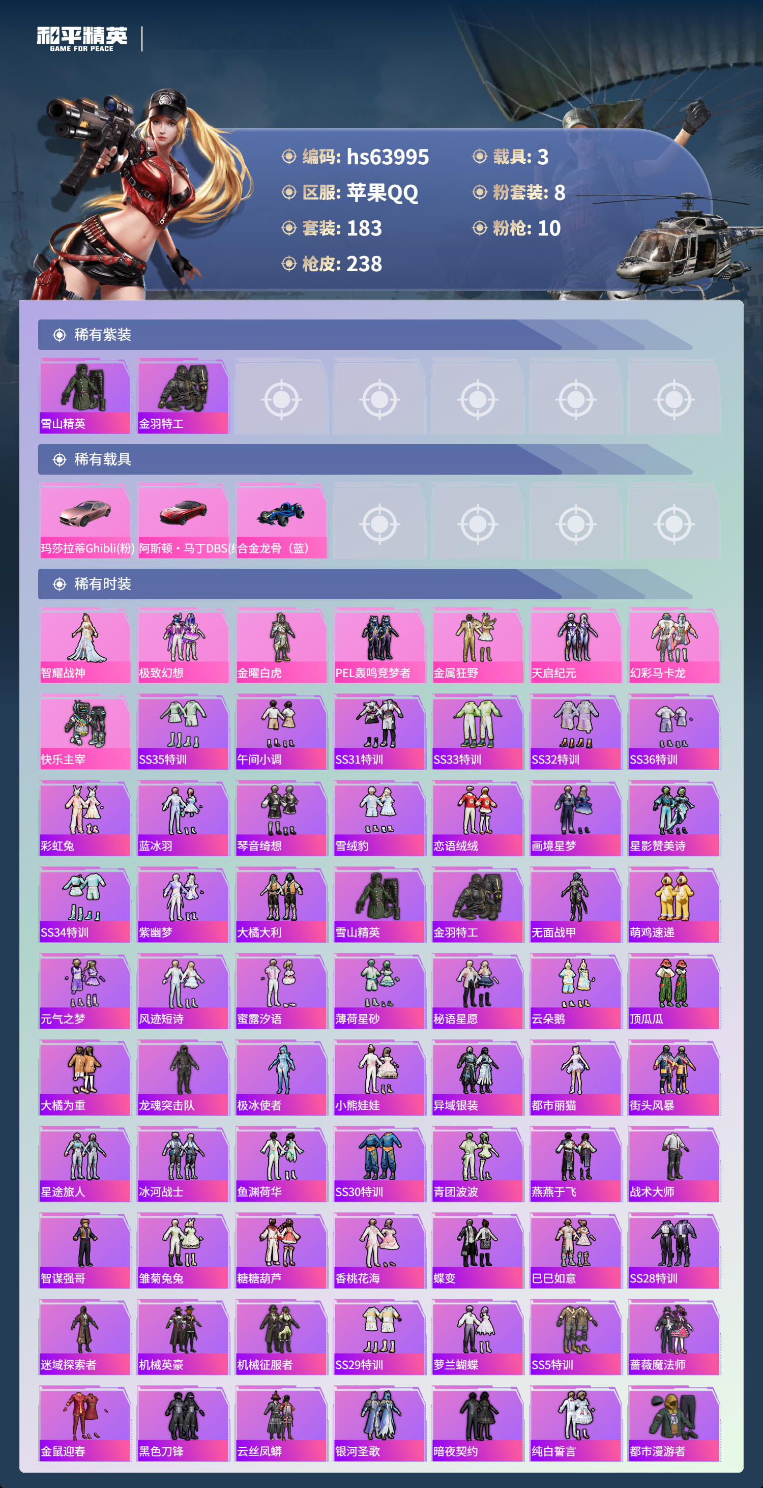 hs63995 苹果手Q-13王牌印记-8粉装-10特效枪-3载具-83275热力值-183套装-238枪皮-2卓越印记