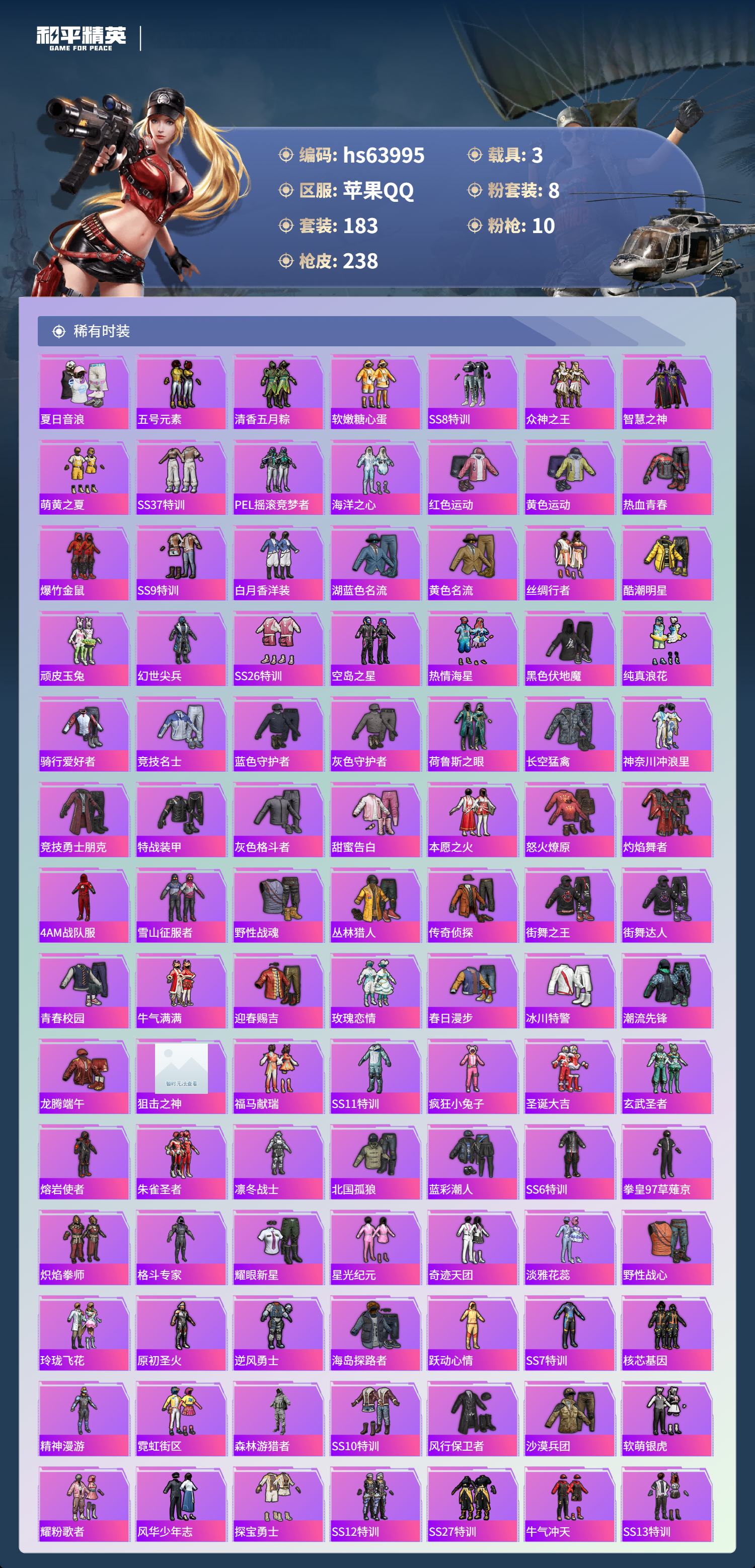 13王牌印记-8粉装-10特效枪-3载具-83275热力值-183套装-238枪皮-2卓越印记