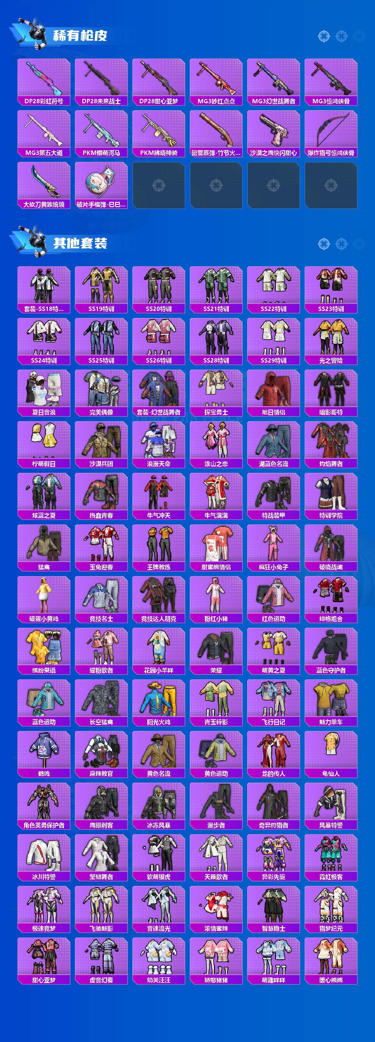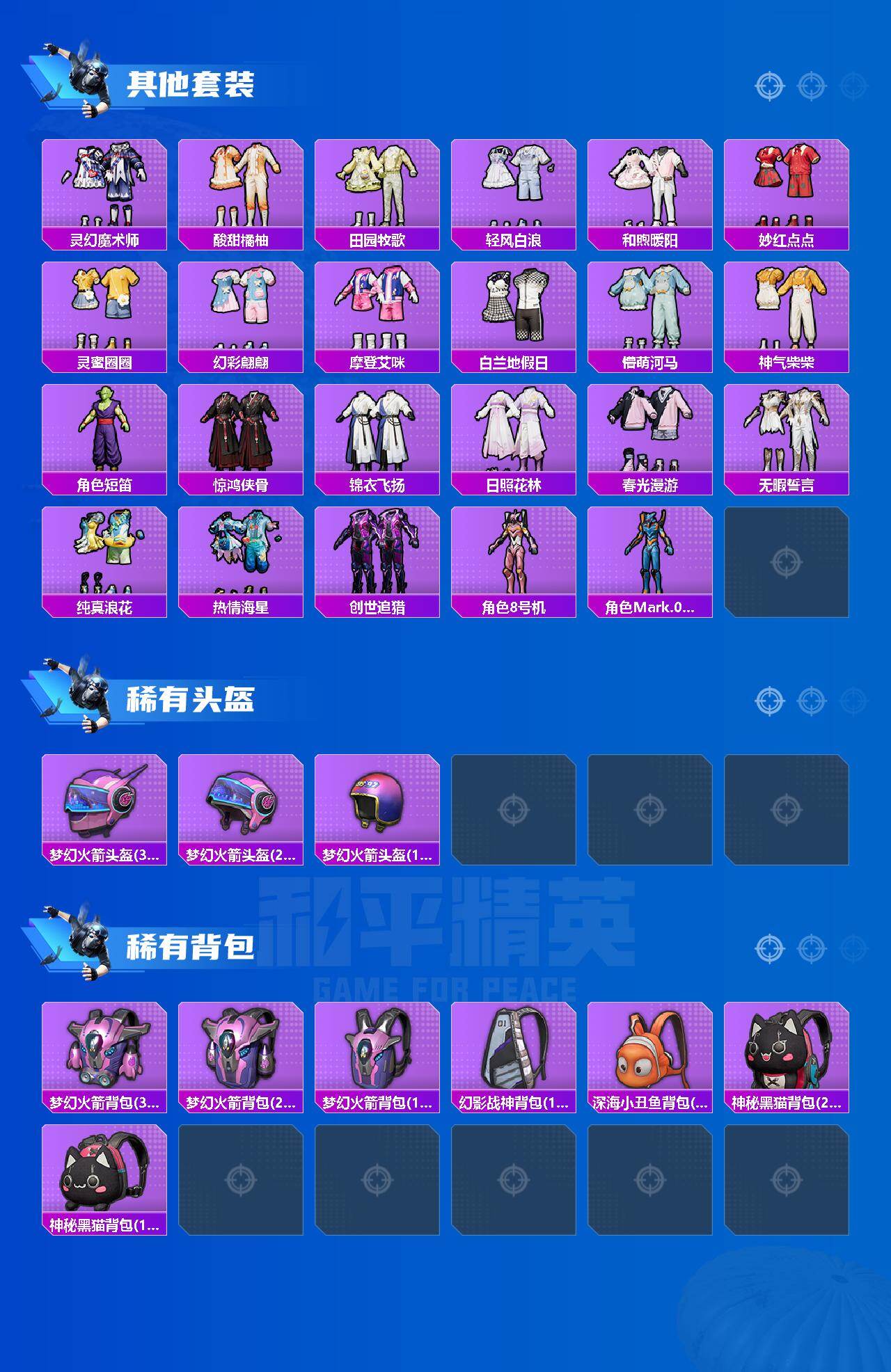 【热门品类】:粉装-梦幻火箭,套装-浪漫天命,套装-都市猎人,套装-派对舞王,套装-小丑鱼,套装-奇异狩猎者,套装-金羽特工,套装-星河浪客,套装-龟仙人,套装-暗影哥特,套装-粉红小猪,角色-8号机,角色-Mark.06