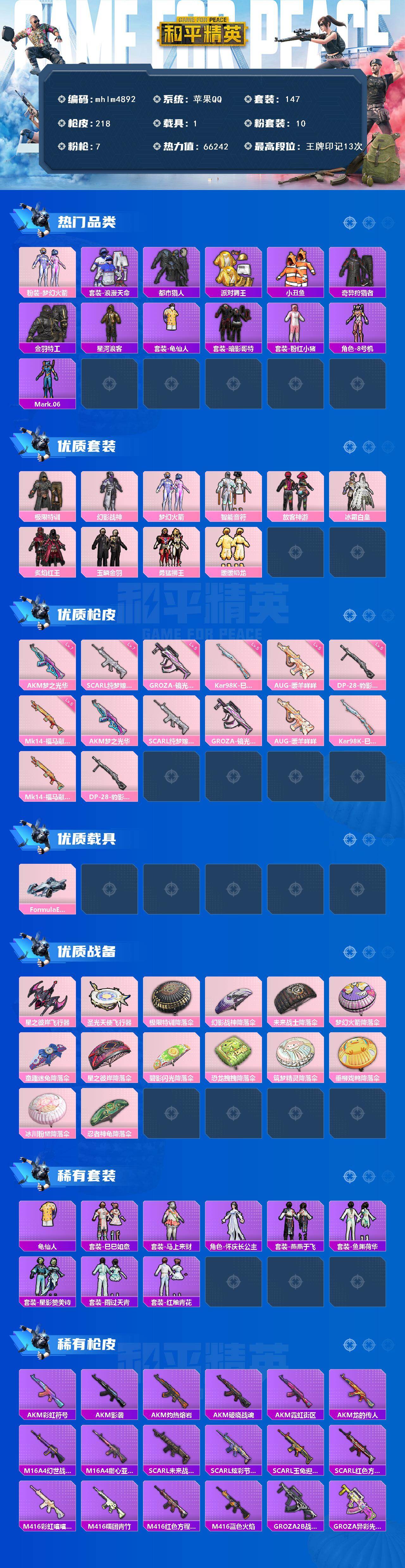 【mhlm4892】苹果 手Q-10粉装-7特效枪-1载具-2粉色飞行器-66242热力值-13王牌印记-147套装-218枪皮