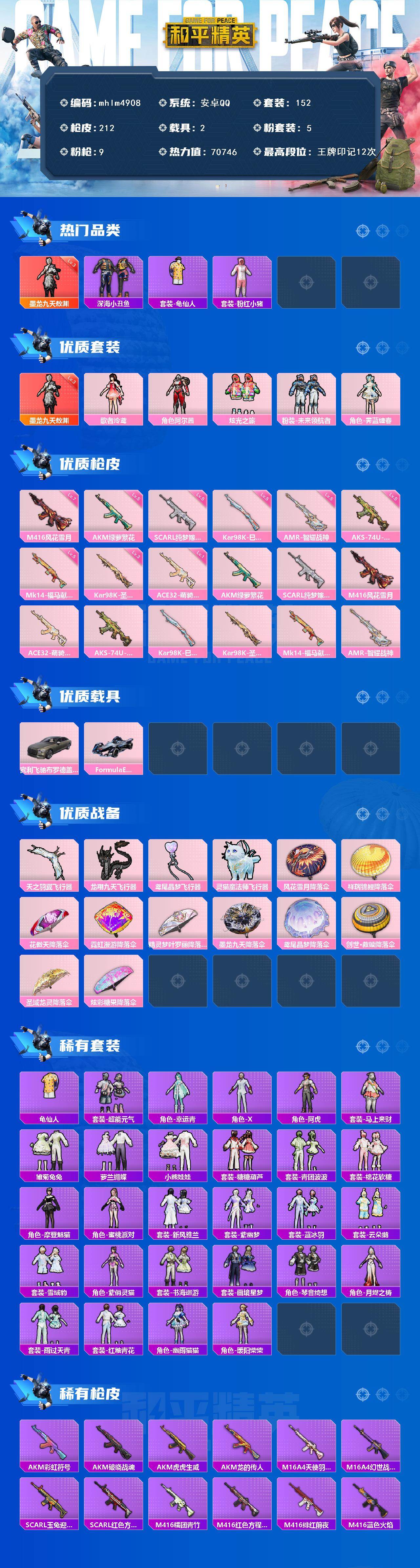 【mhlm4908】安卓 手Q-1神装-5粉装-9特效枪-2载具-6粉色飞行器-70746热力值-12王牌印记-152套装-212枪皮