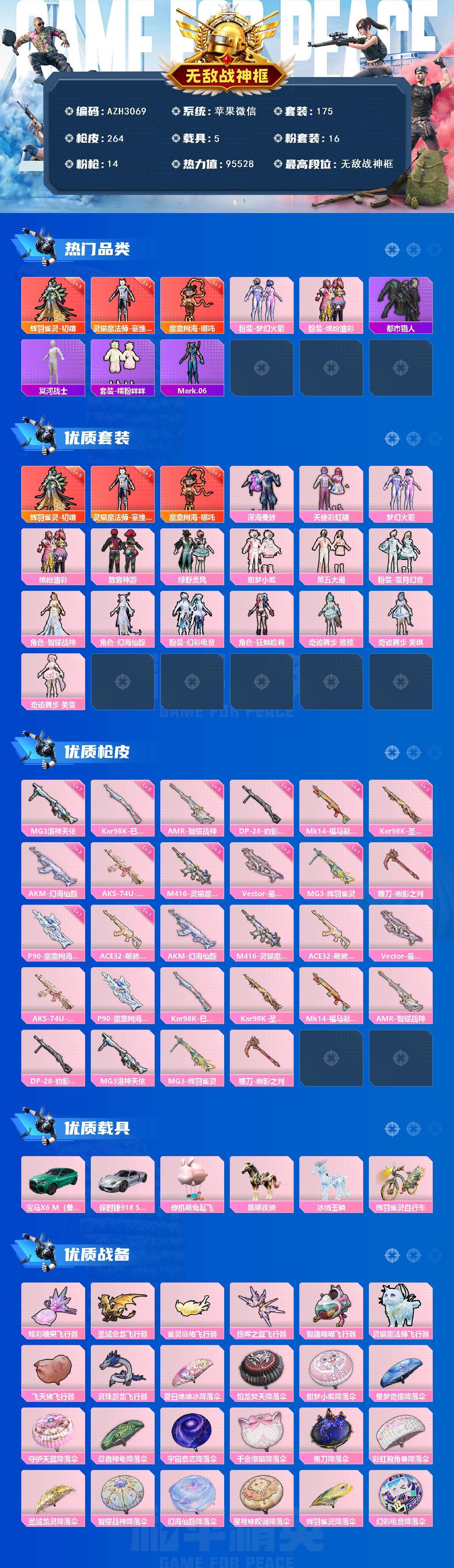 【AZH3069】苹果 微信【无敌战神框 五级初翊一级哪吒一级塞维尔 木乃伊都市梦幻火箭放客神游 猪脸甜梦小狐第五大道糯粉咩咩 满级洛神天依MG3 5载具1僚机】无敌战神框-3神装-16粉装-14特效枪-5载具-9粉色飞行器-95528热力值-9王牌印记-175套装-264枪皮