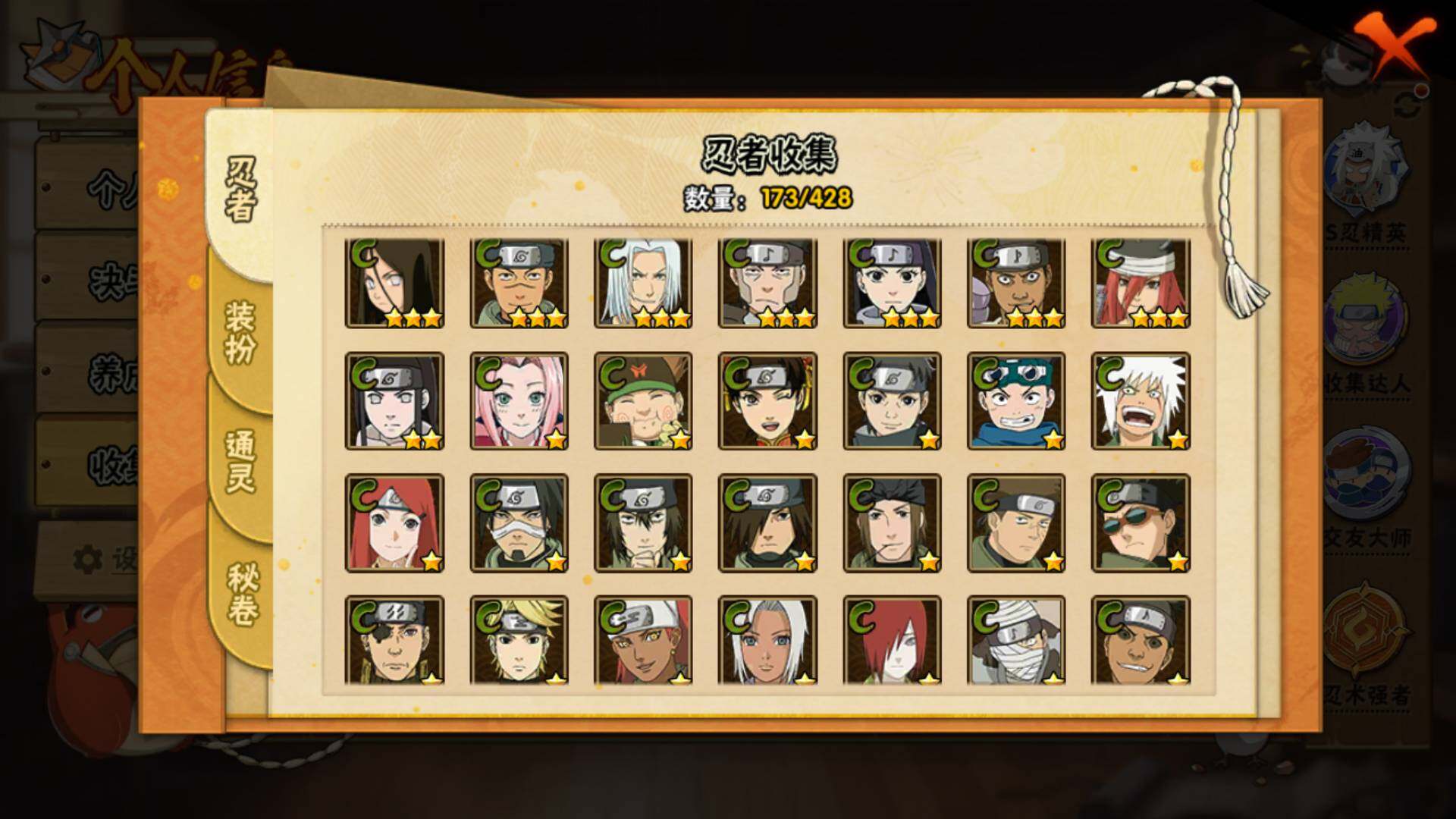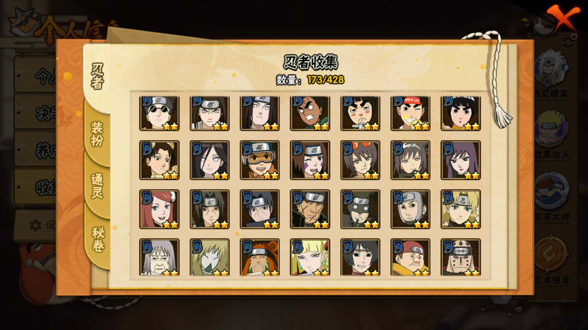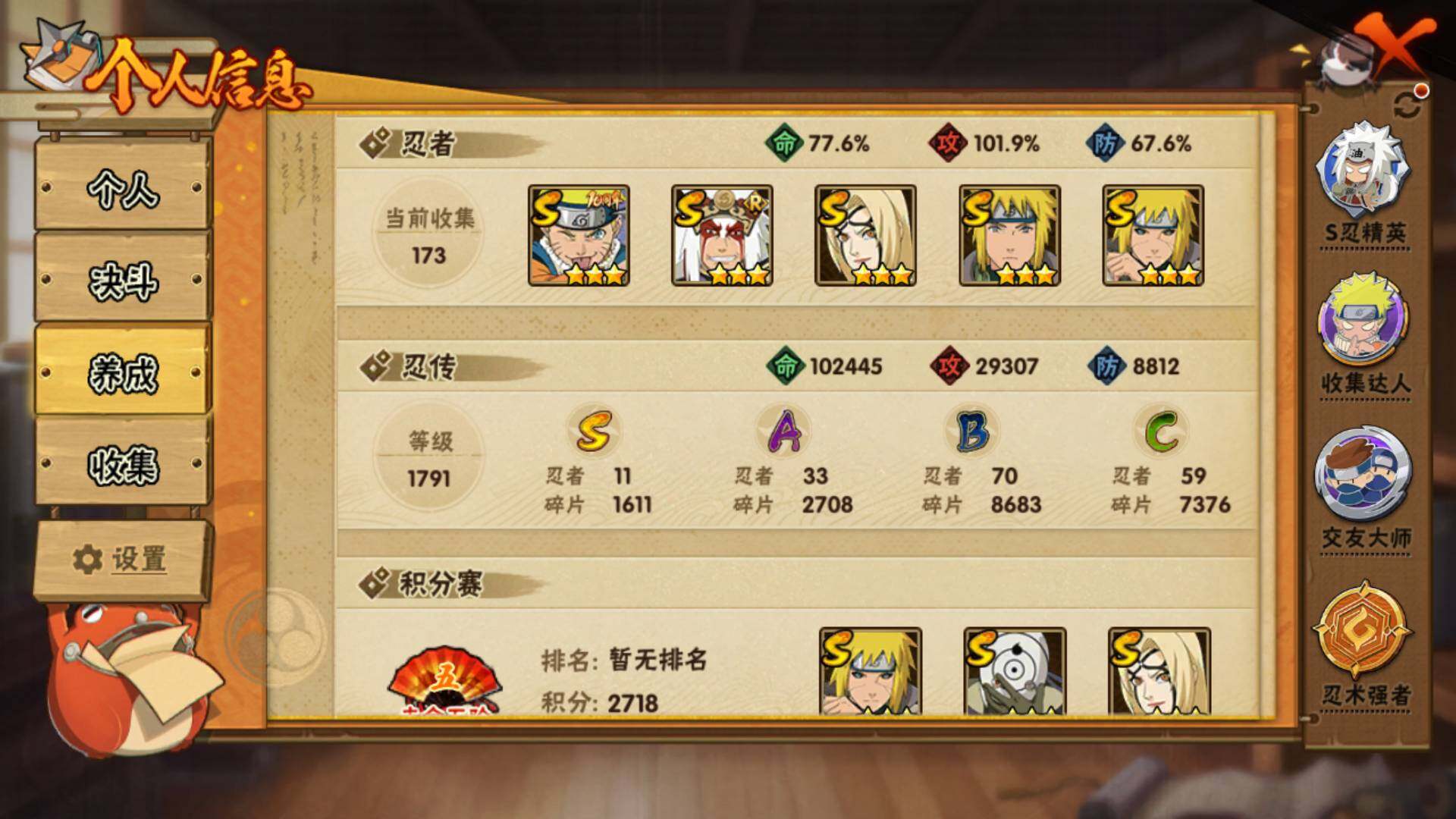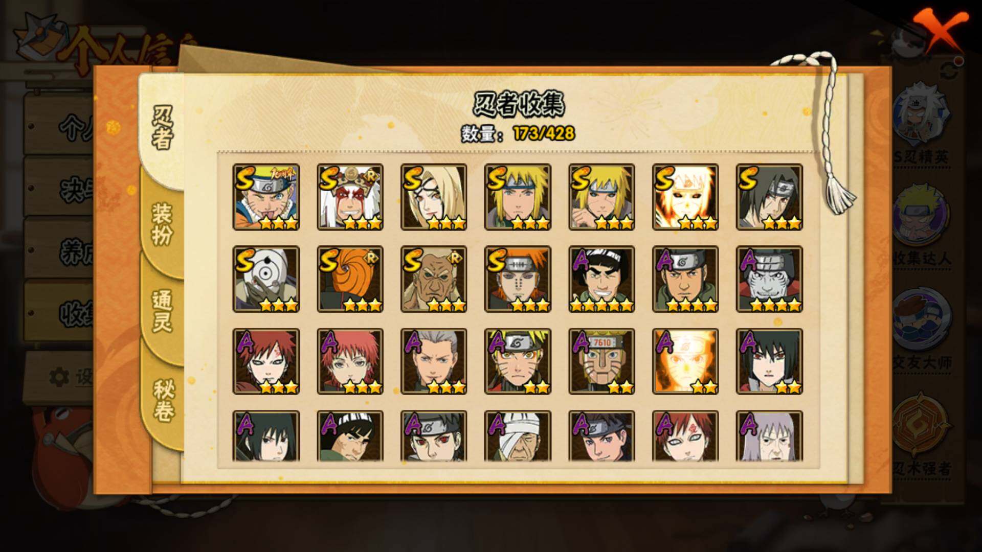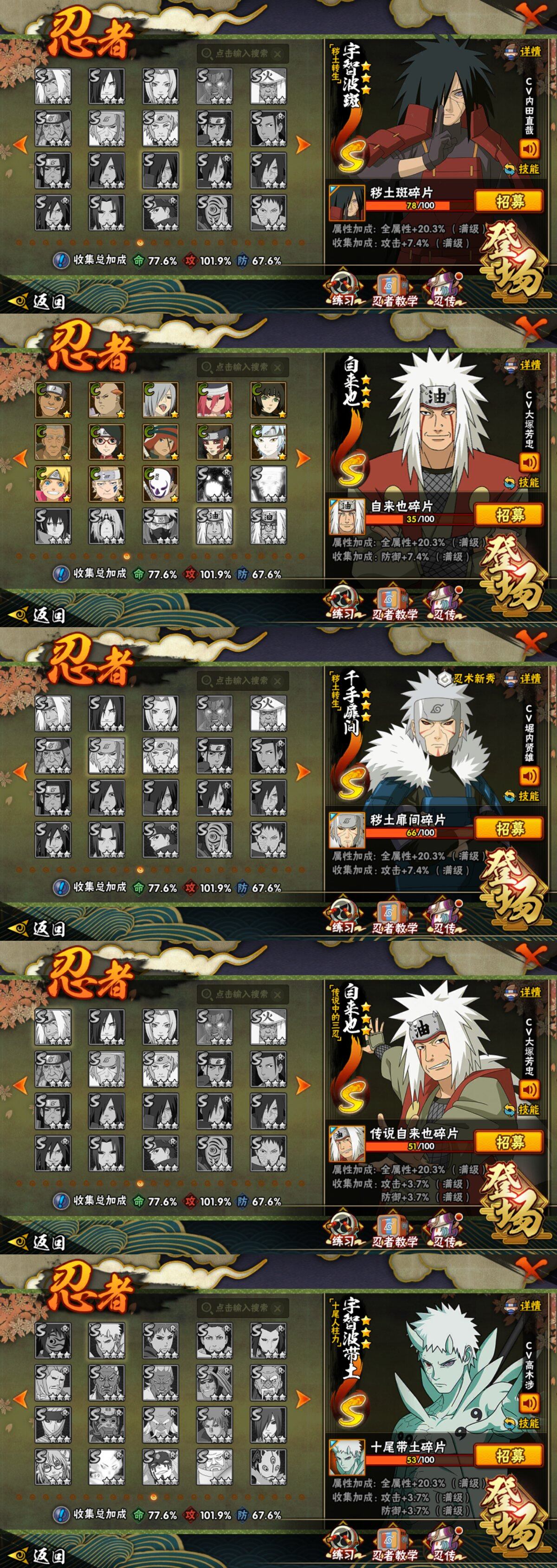 【S级忍者】:波风水门「秽土转生」(3星),宇智波鼬「须佐能乎」(3星),艾「三代目雷影」(3星),自来也「舞之豪杰」(3星),纲手「百豪」(3星),波风水门(3星),