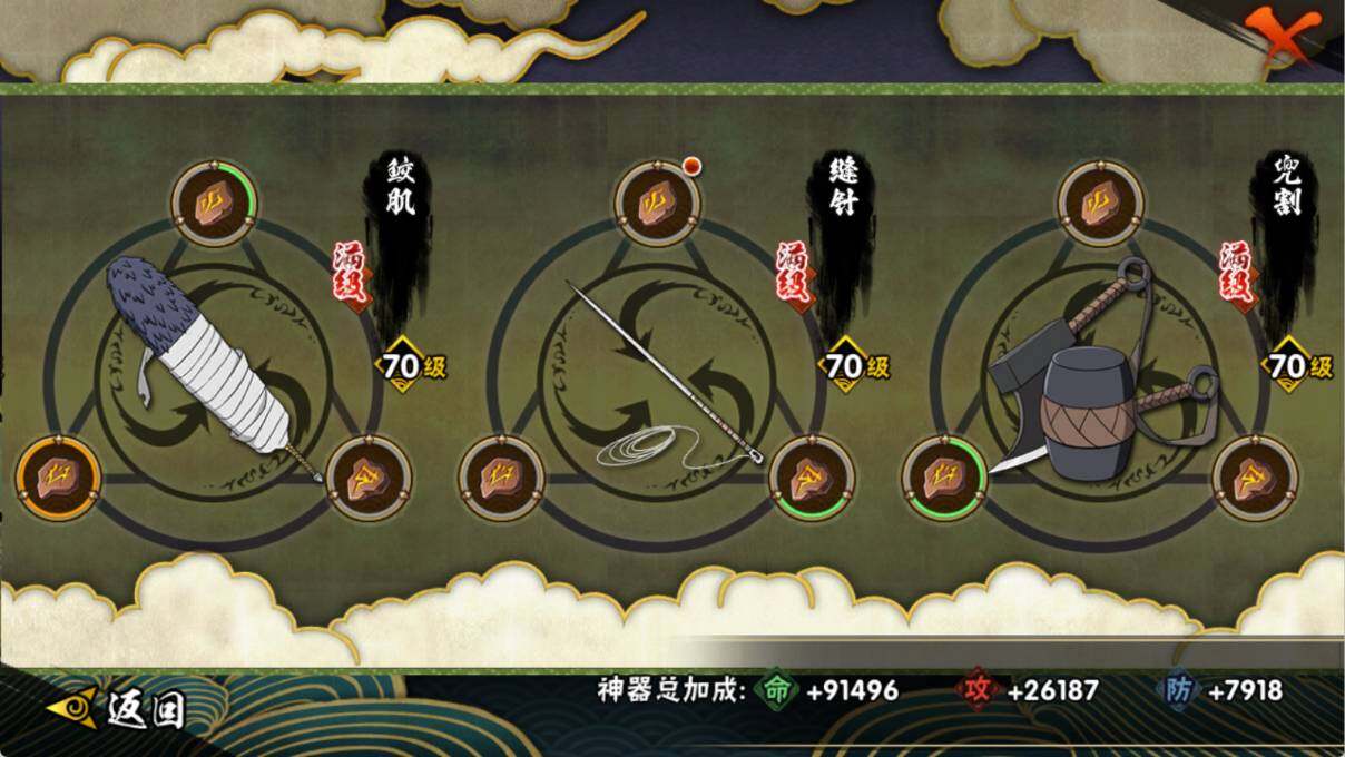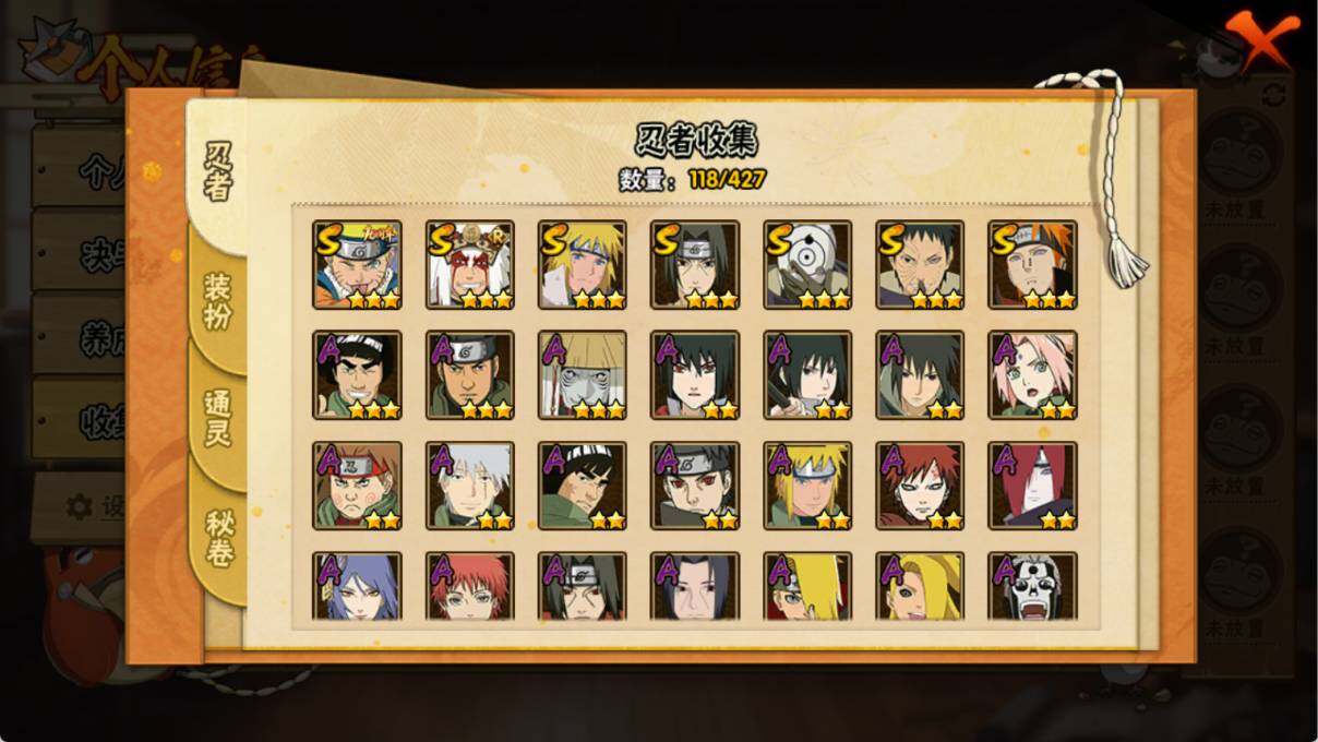 【S级忍者】:宇智波带土「忍界大战」(3星),宇智波鼬「须佐能乎」(3星),自来也「舞之豪杰」(3星),波风水门(3星),佩恩「天道」(3星),宇智波斑 「白面具」(3星宇智波斑「白面具」),漩涡鸣人·宇智波佐助(3星)