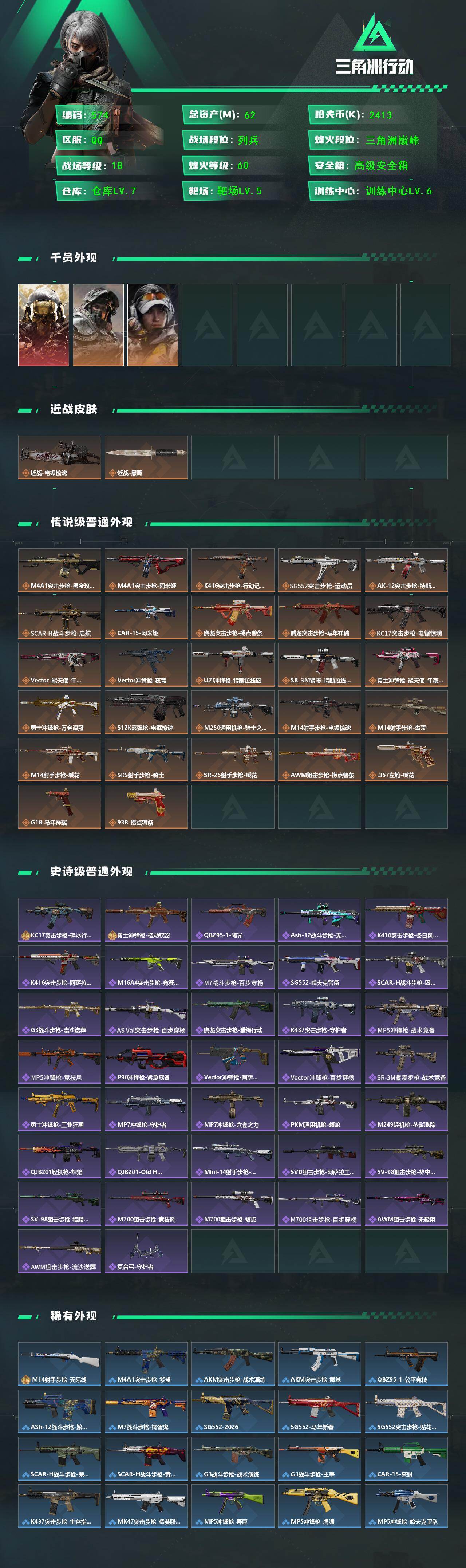62m总资产-2413k哈伏币-60烽火等级-三角洲巅峰-18战场等级-列兵