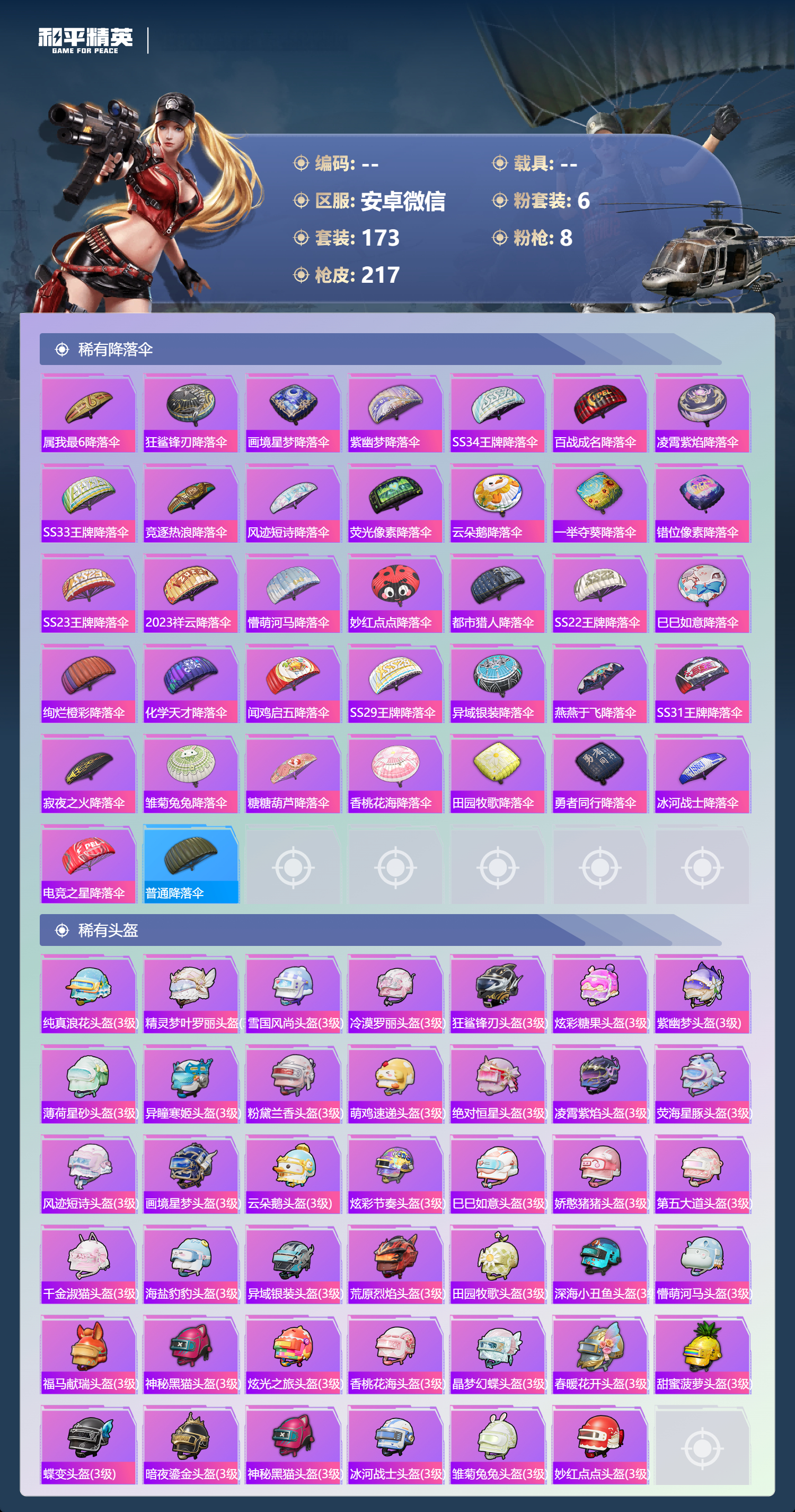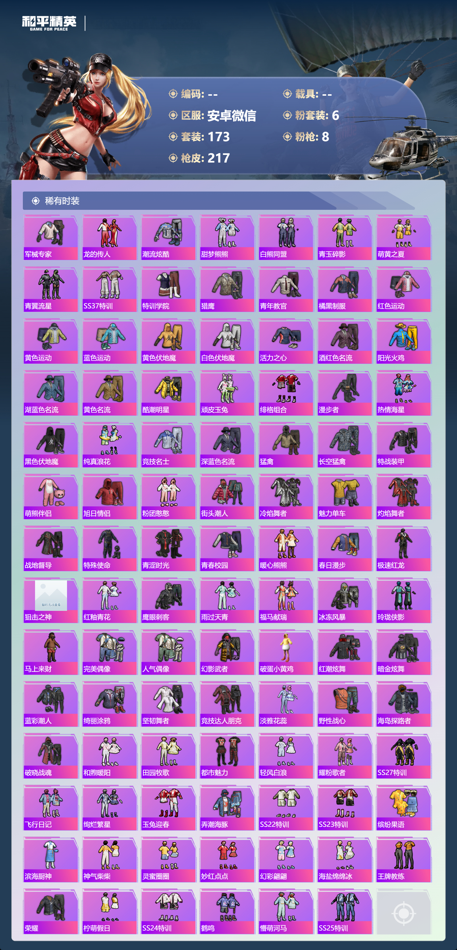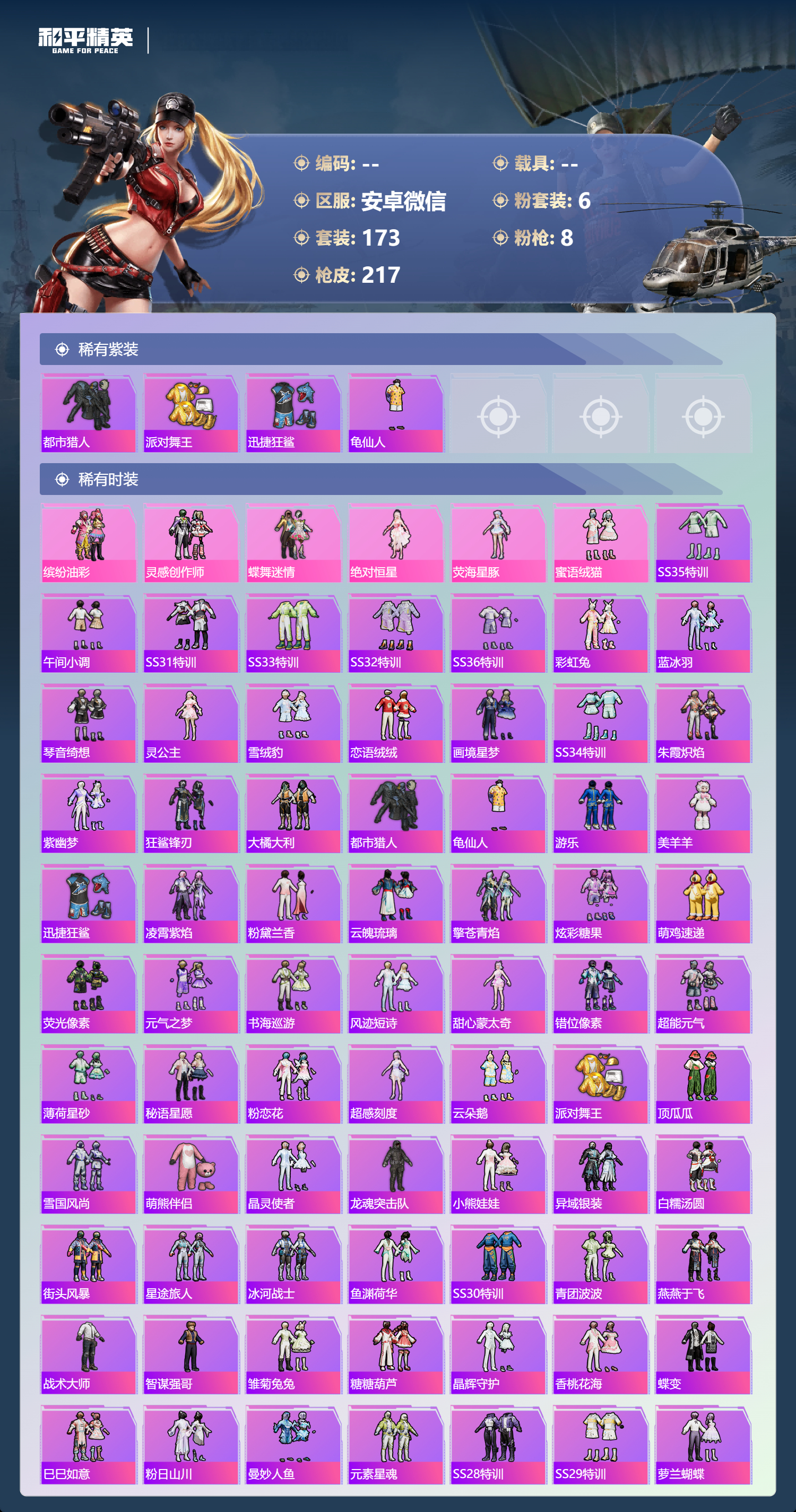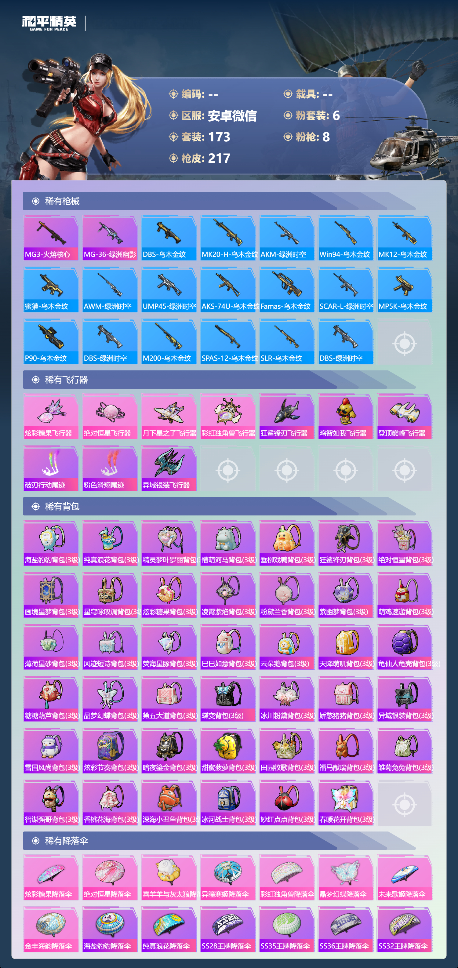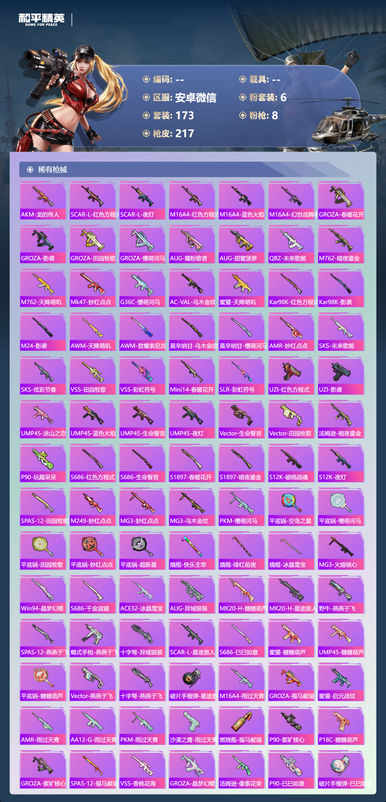 hs64590 安卓微信-12王牌印记-6粉装-8特效枪-62736热力值-173套装-217枪皮-4卓越印记-1传奇印记