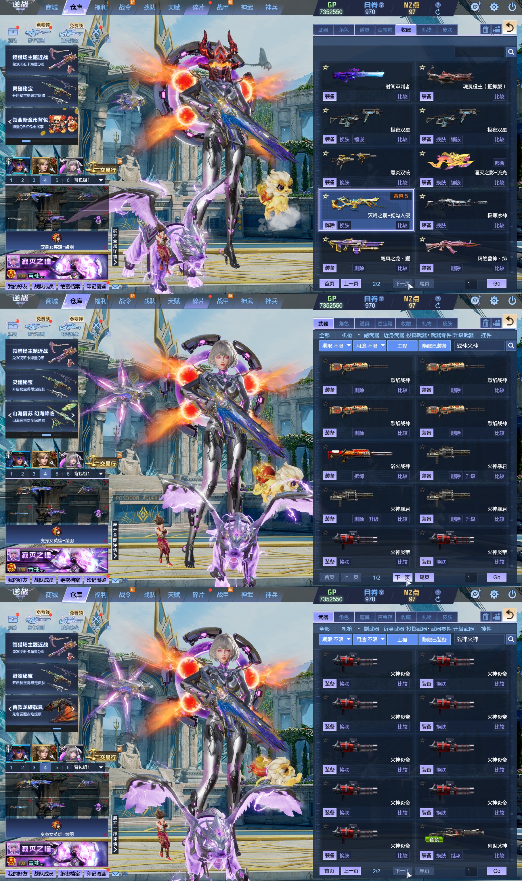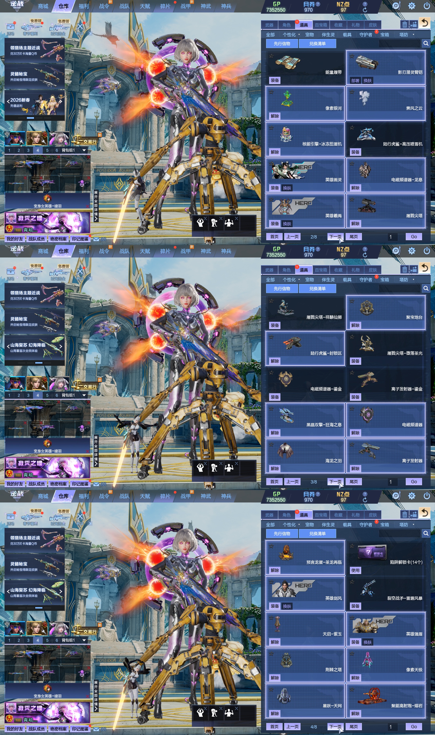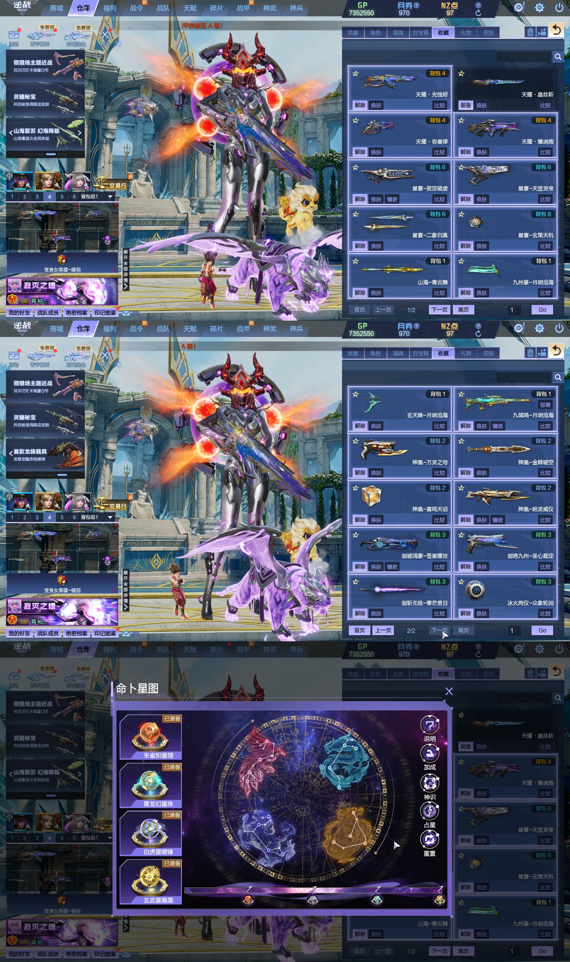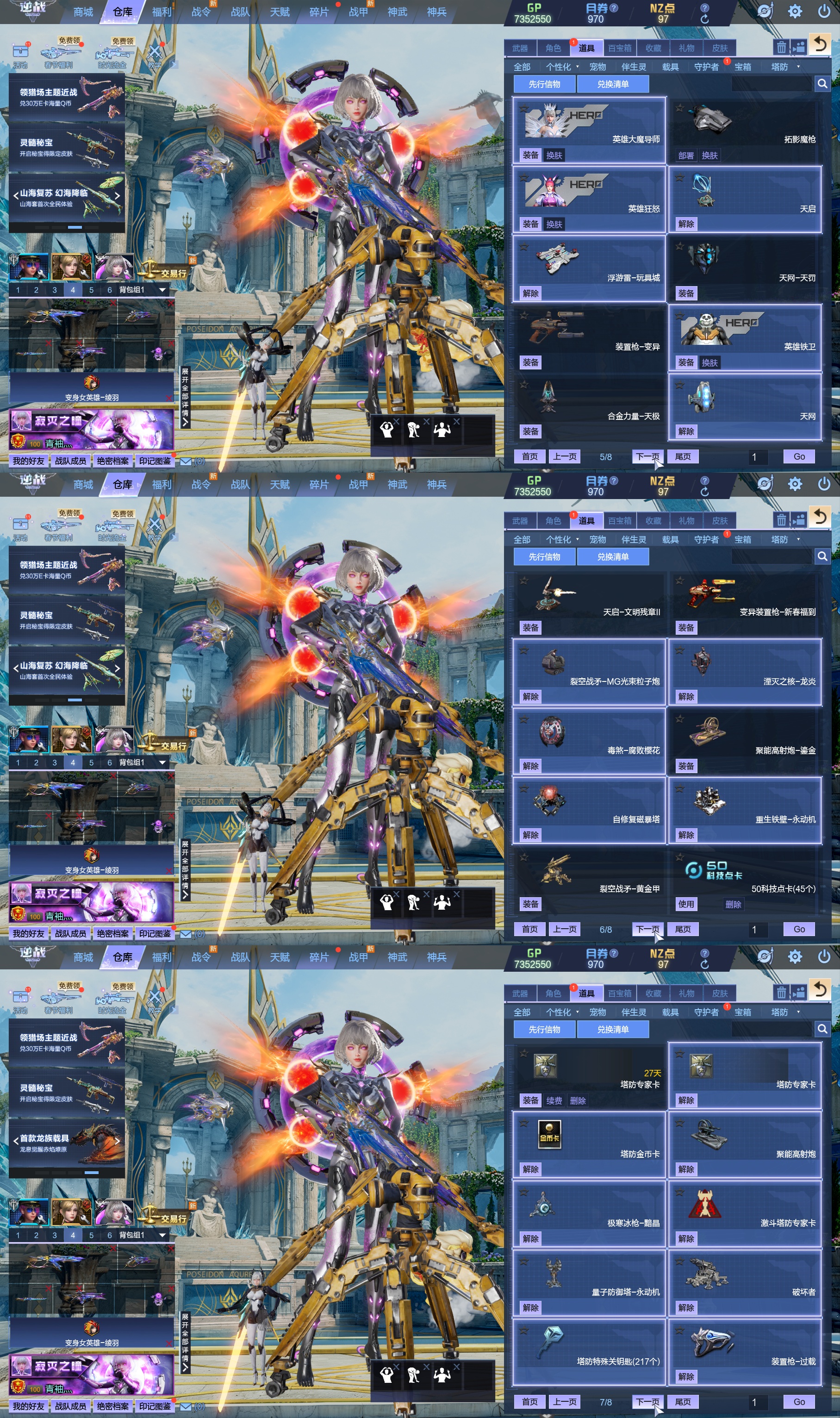 莱娜/天命戒/天耀套/星寰山海9+9/天帝神皇双6核/陨星套/金鍷焚天/影刃臂铠/龙曦绫羽/海龙王10英雄陷阱/左轮/创世主武/鹰王套/哮天犬套/炽鬼/天王白龙吟/青龙/奇变步狙/原子力量/电离对撞/爆炎双充/冰神/双时间审判者/白虎/火狐/玄武/小人枪/重装利刃/战令旗/水刀/橄榄3件套/3把暗星骨刃/手雷包极多/王菲/爱丽丝/海薇幻化/微微安/女巫艾琳娜/EVA明日香/赤龙/凤栖神翼/归墟/雷