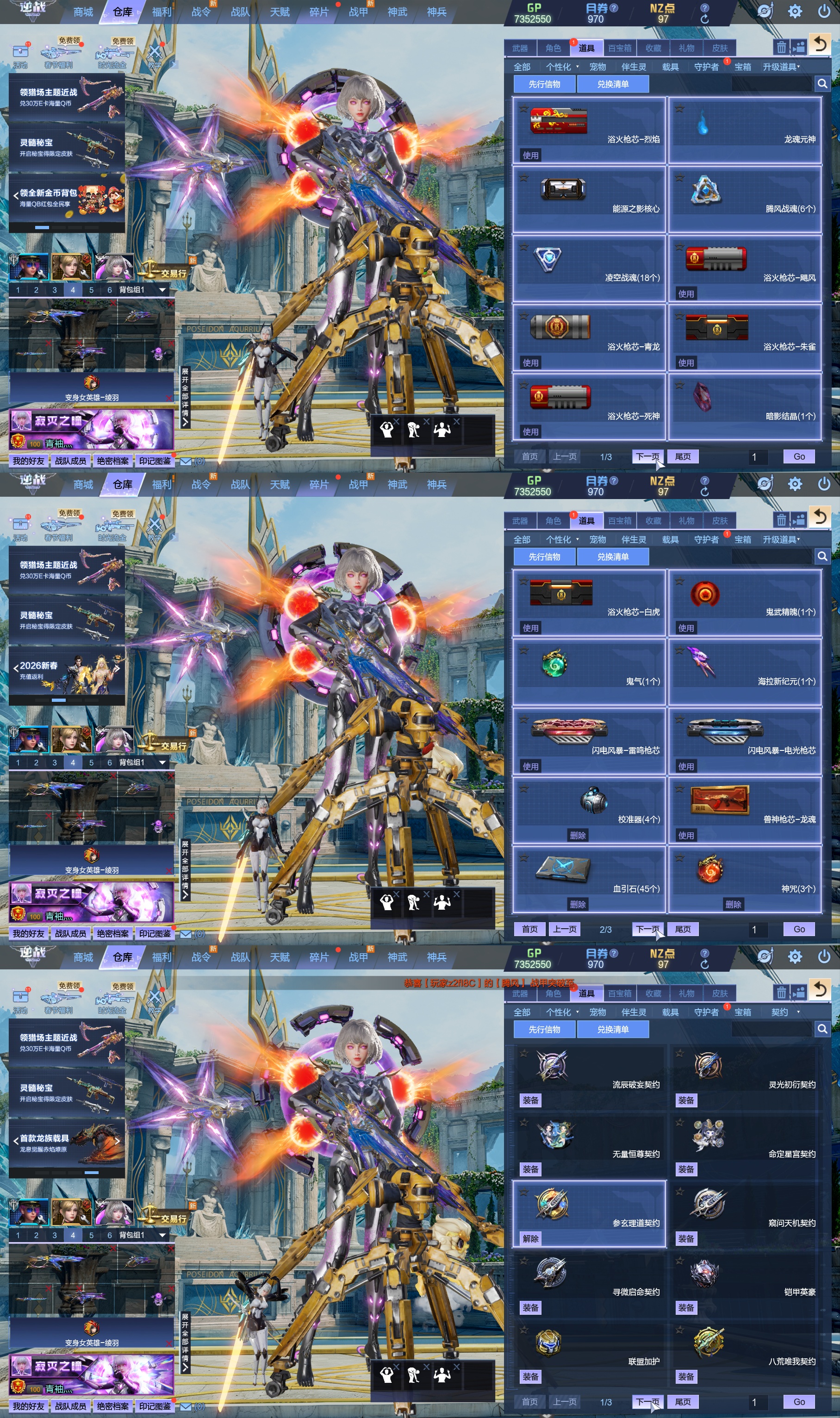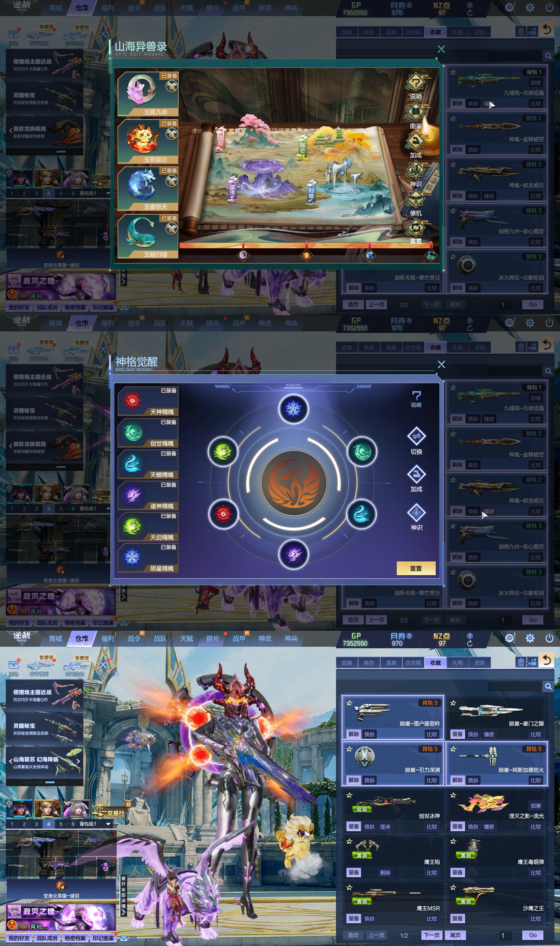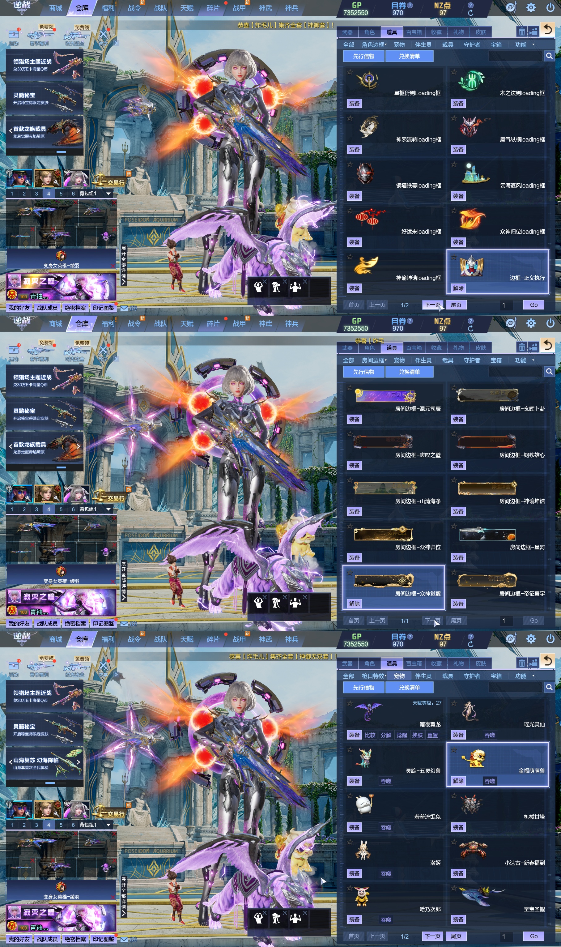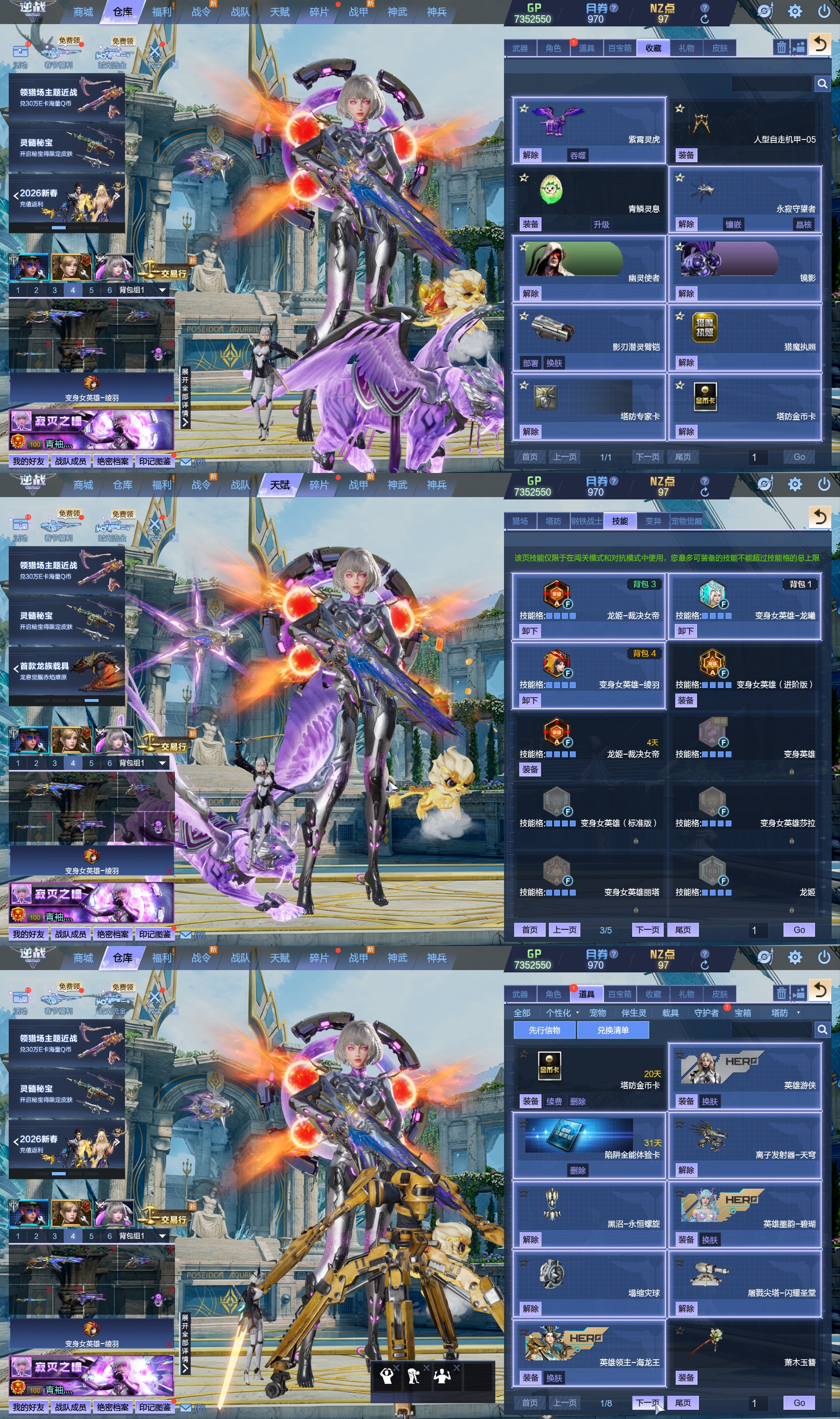 莱娜/天命戒/天耀套/星寰山海9+9/天帝神皇双6核/陨星套/金鍷焚天/影刃臂铠/龙曦绫羽/海龙王10英雄陷阱/左轮/创世主武/鹰王套/哮天犬套/炽鬼/天王白龙吟/青龙/奇变步狙/原子力量/电离对撞/爆炎双充/冰神/双时间审判者/白虎/火狐/玄武/小人枪/重装利刃/战令旗/水刀/橄榄3件套/3把暗星骨刃/手雷包极多/王菲/爱丽丝/海薇幻化/微微安/女巫艾琳娜/EVA明日香/赤龙/凤栖神翼/归墟/雷