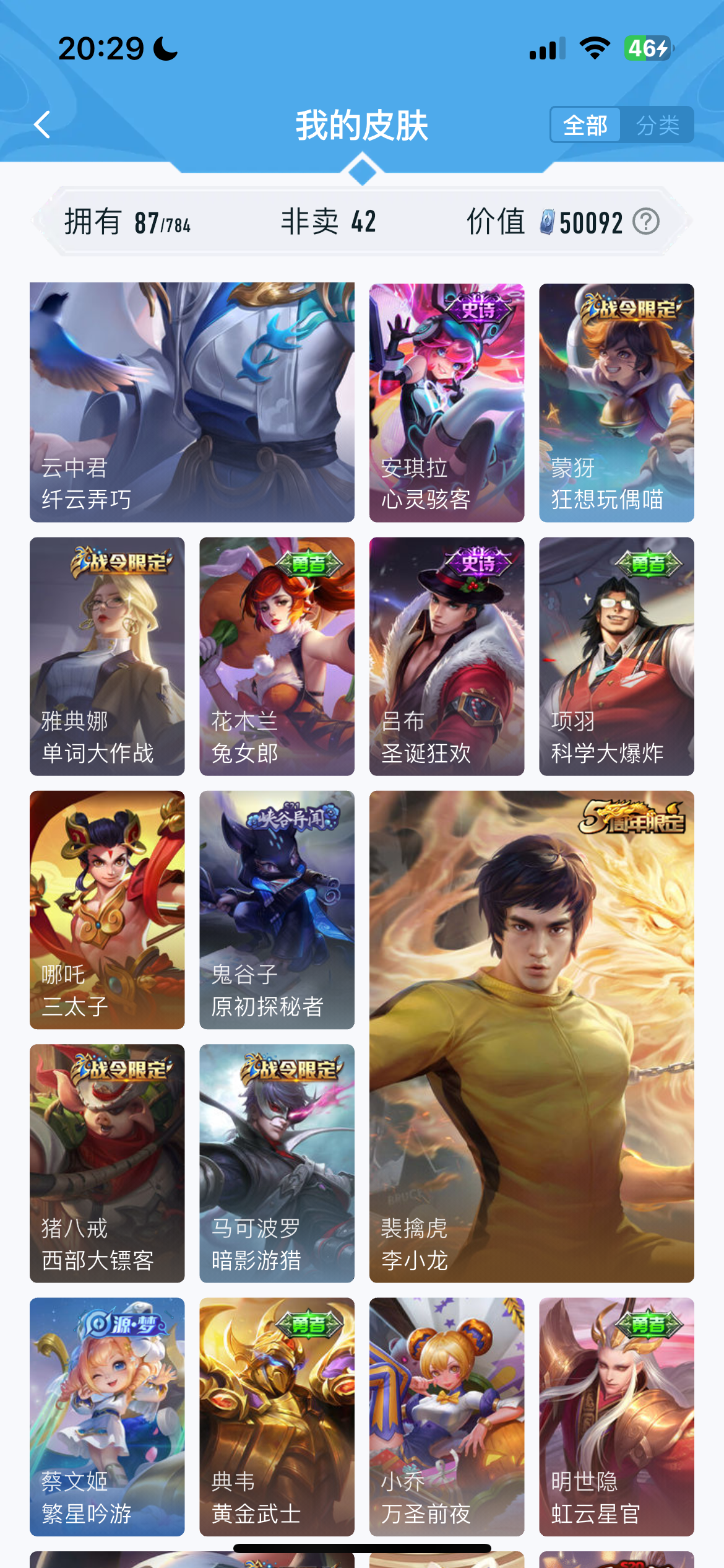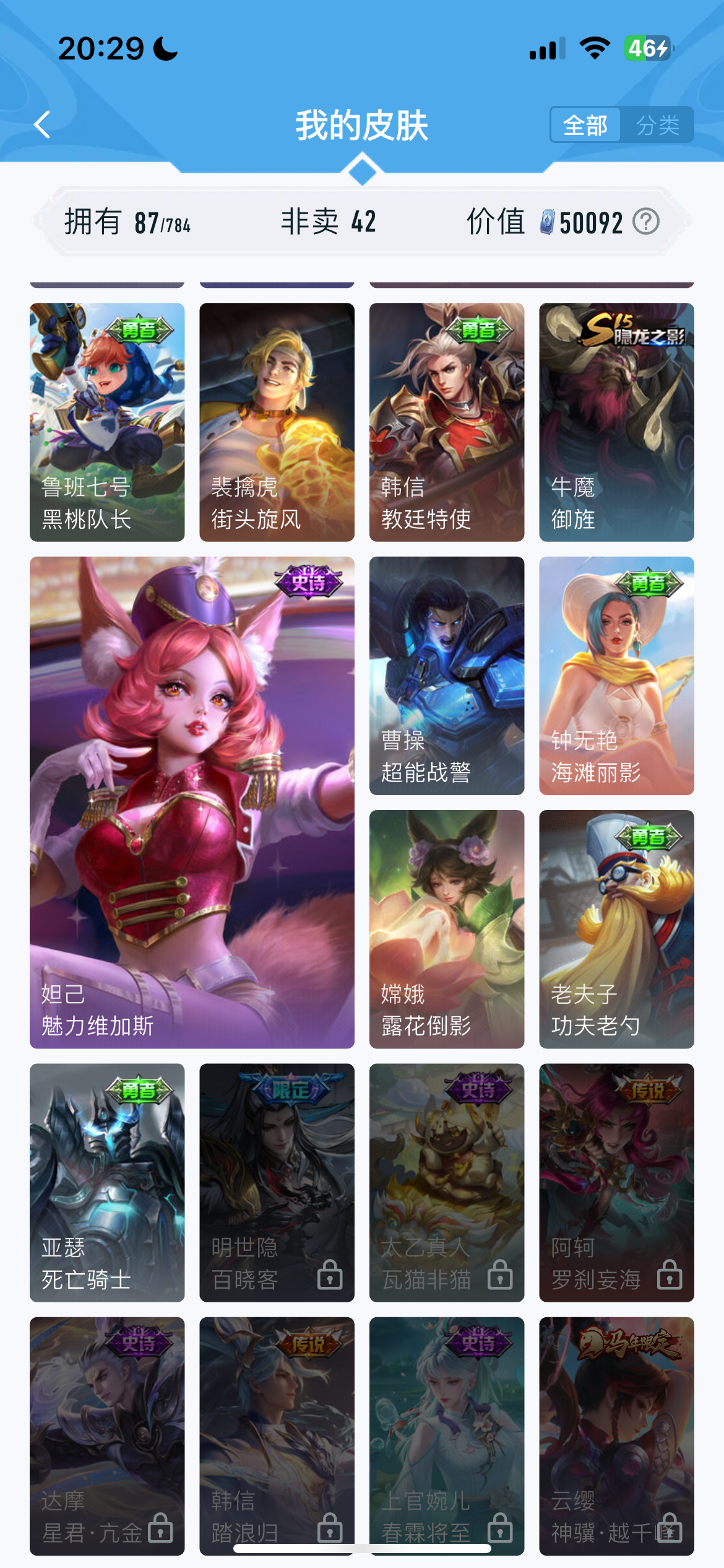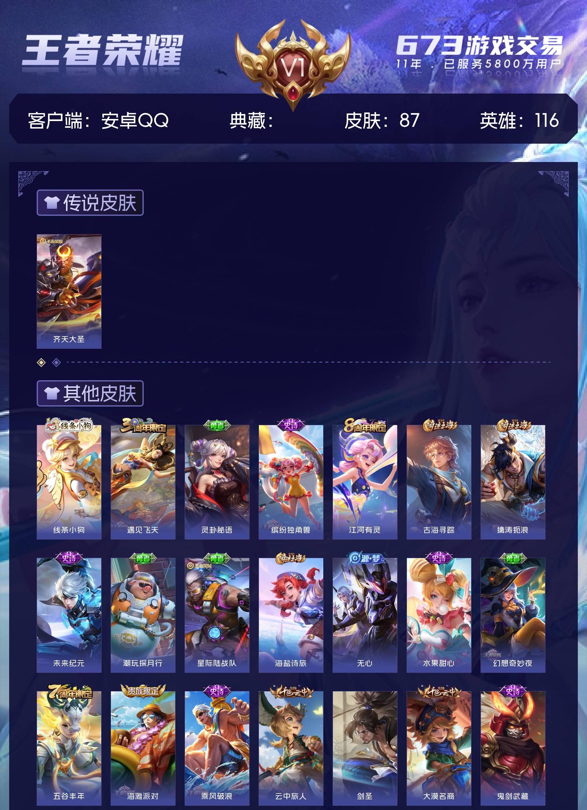 V1 皮肤87 英雄116 秩序白银 传说1 其他皮肤93