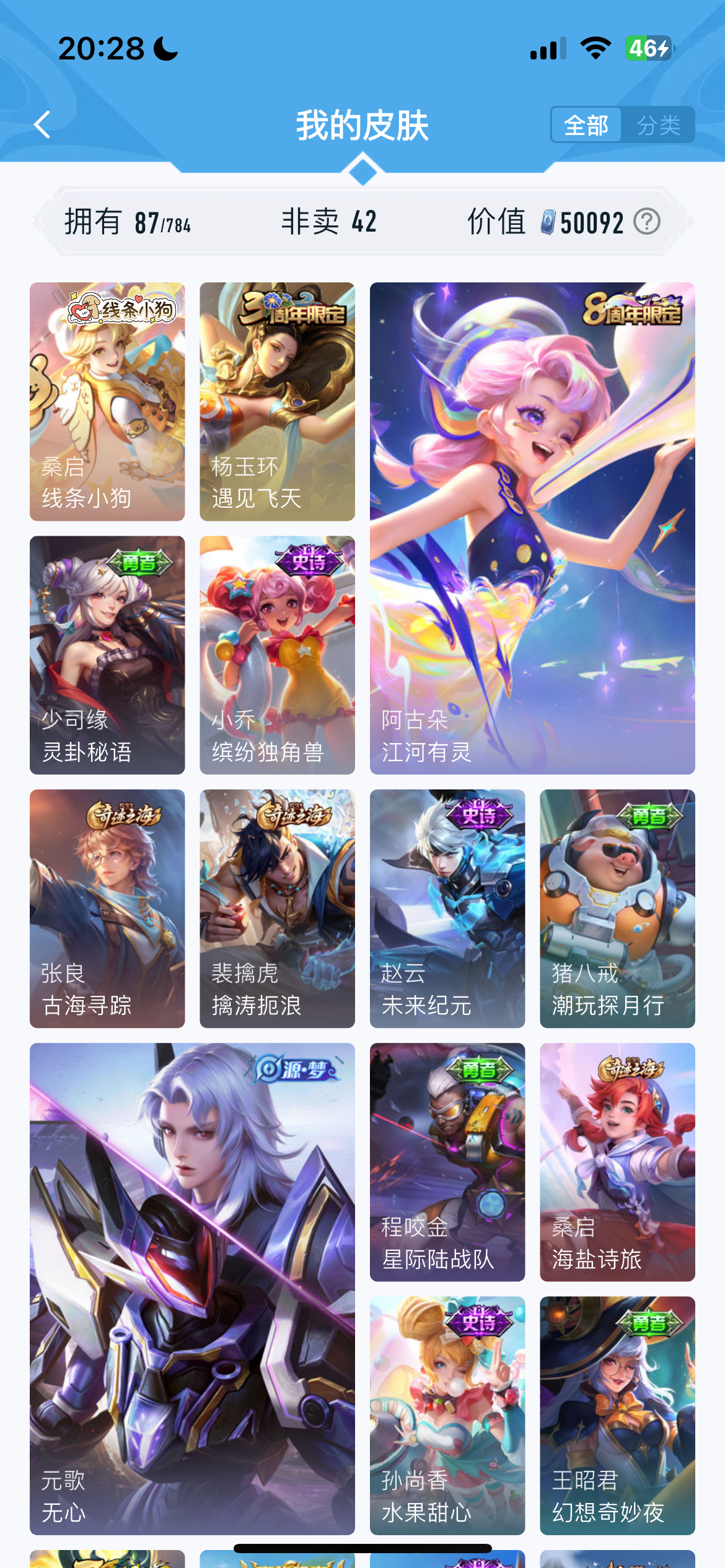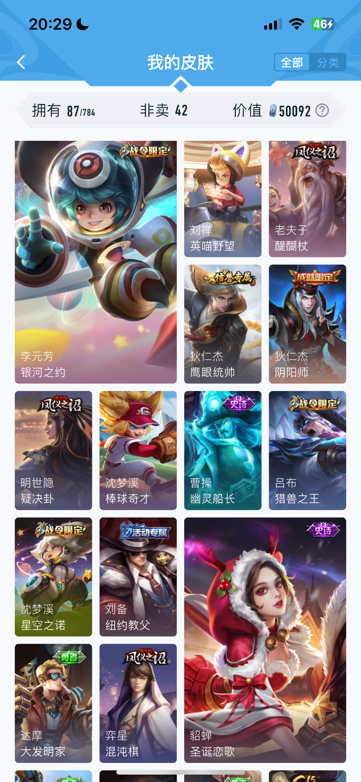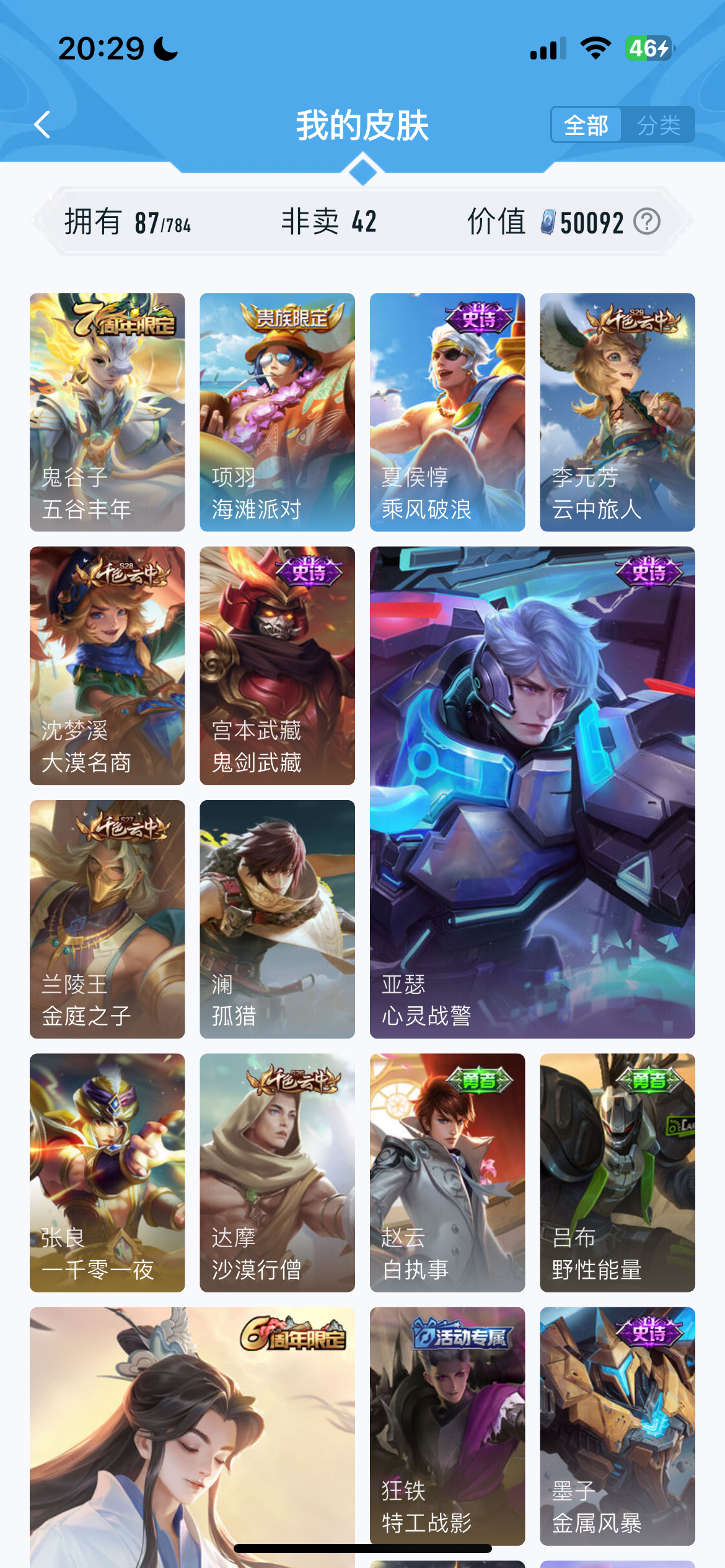 V1 皮肤87 英雄116 秩序白银 传说1 其他皮肤93