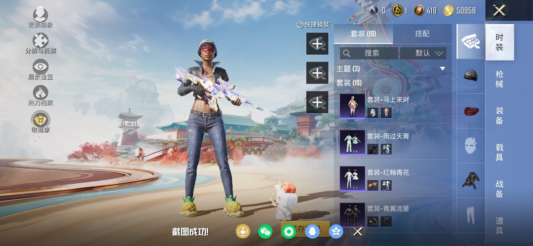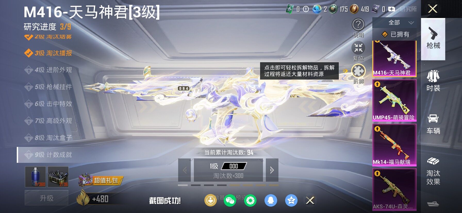 【4特效枪】 M416-天马神君 (3级) AKS-74U-森灵之息 (5级) Mk14-福马献瑞 (5级) UMP45-萌骑冒险 (2级)