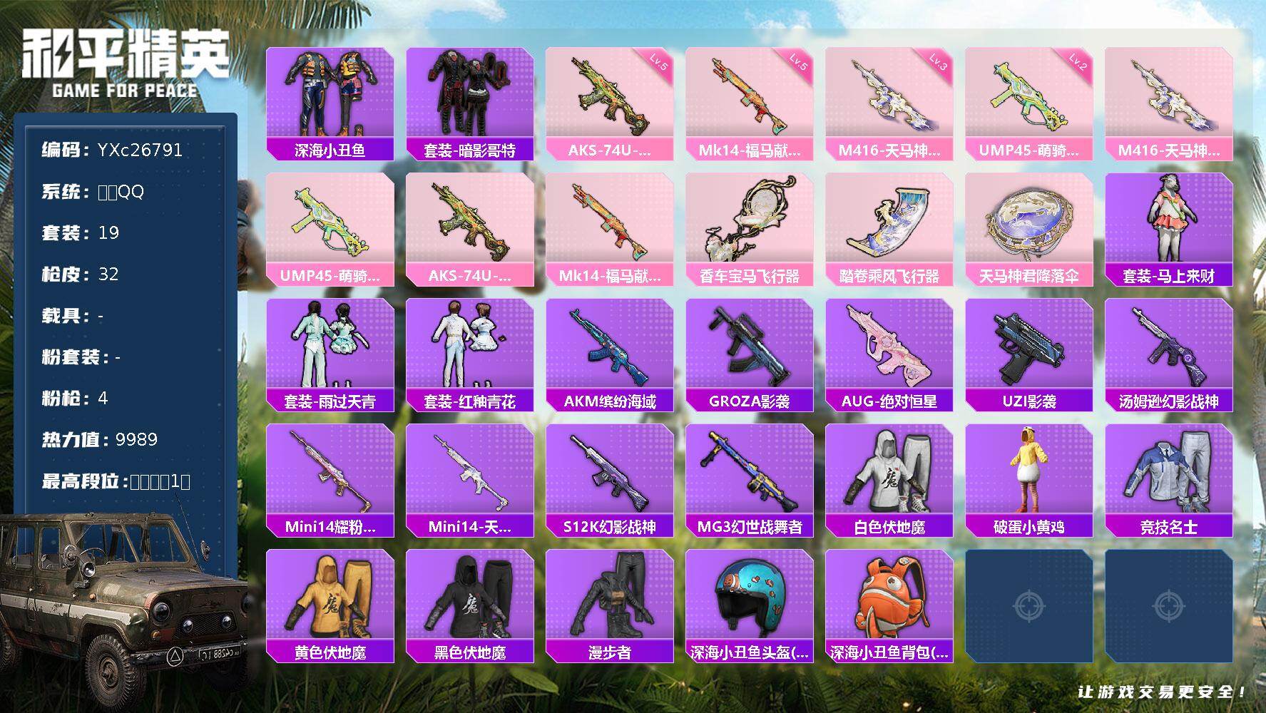 苹果Q-1稀有5特效枪4热门19套装32枪皮 9989热力值 1印记 历史超级王牌4星