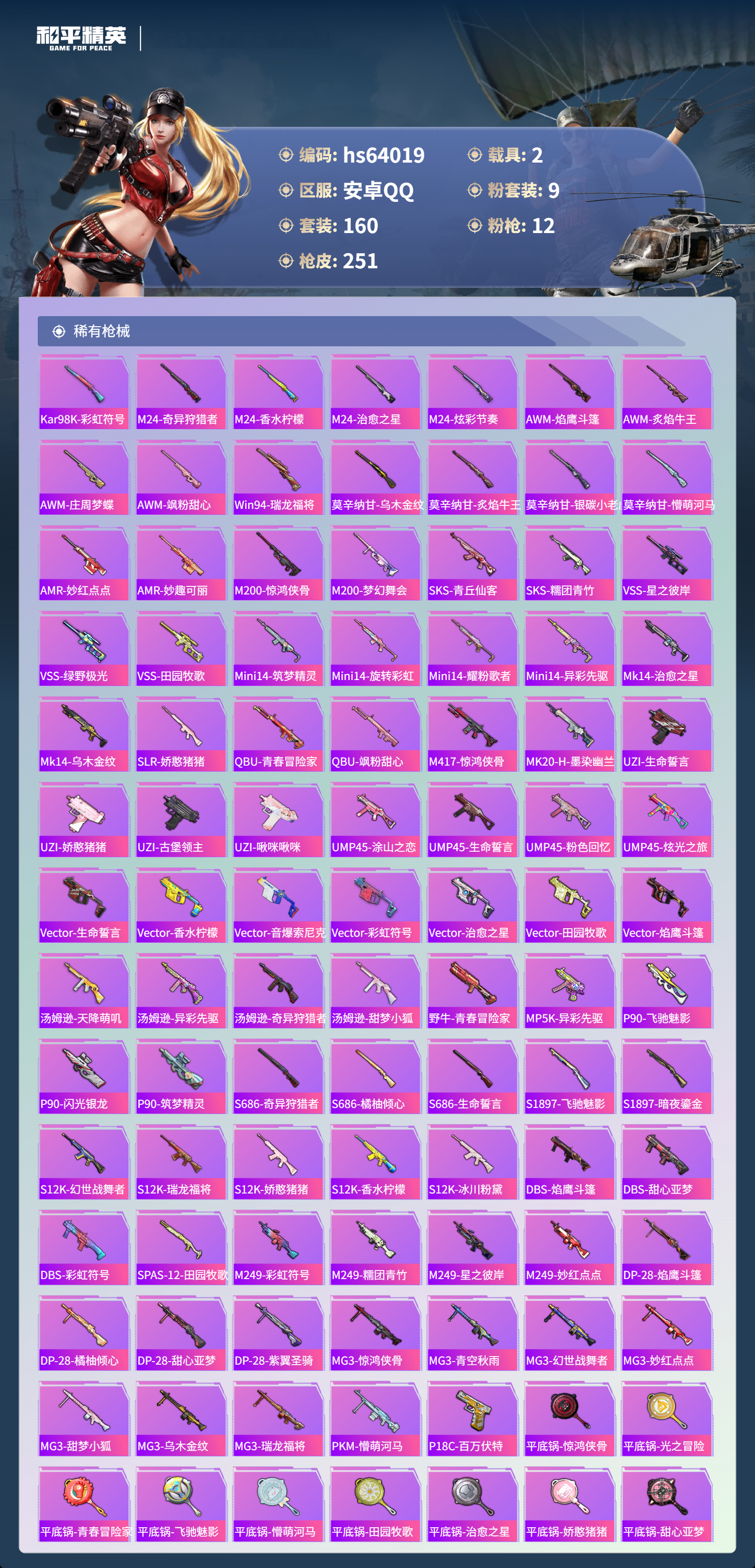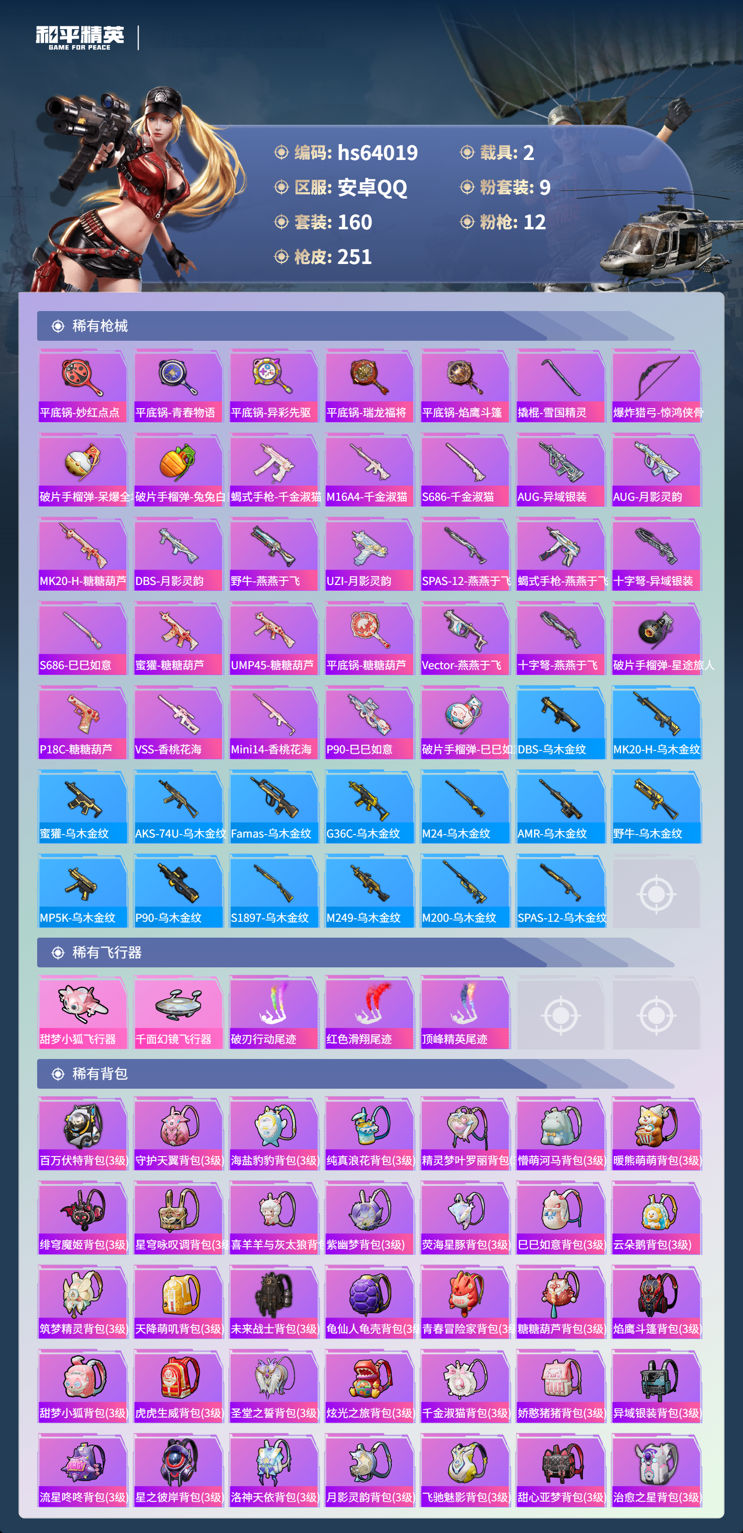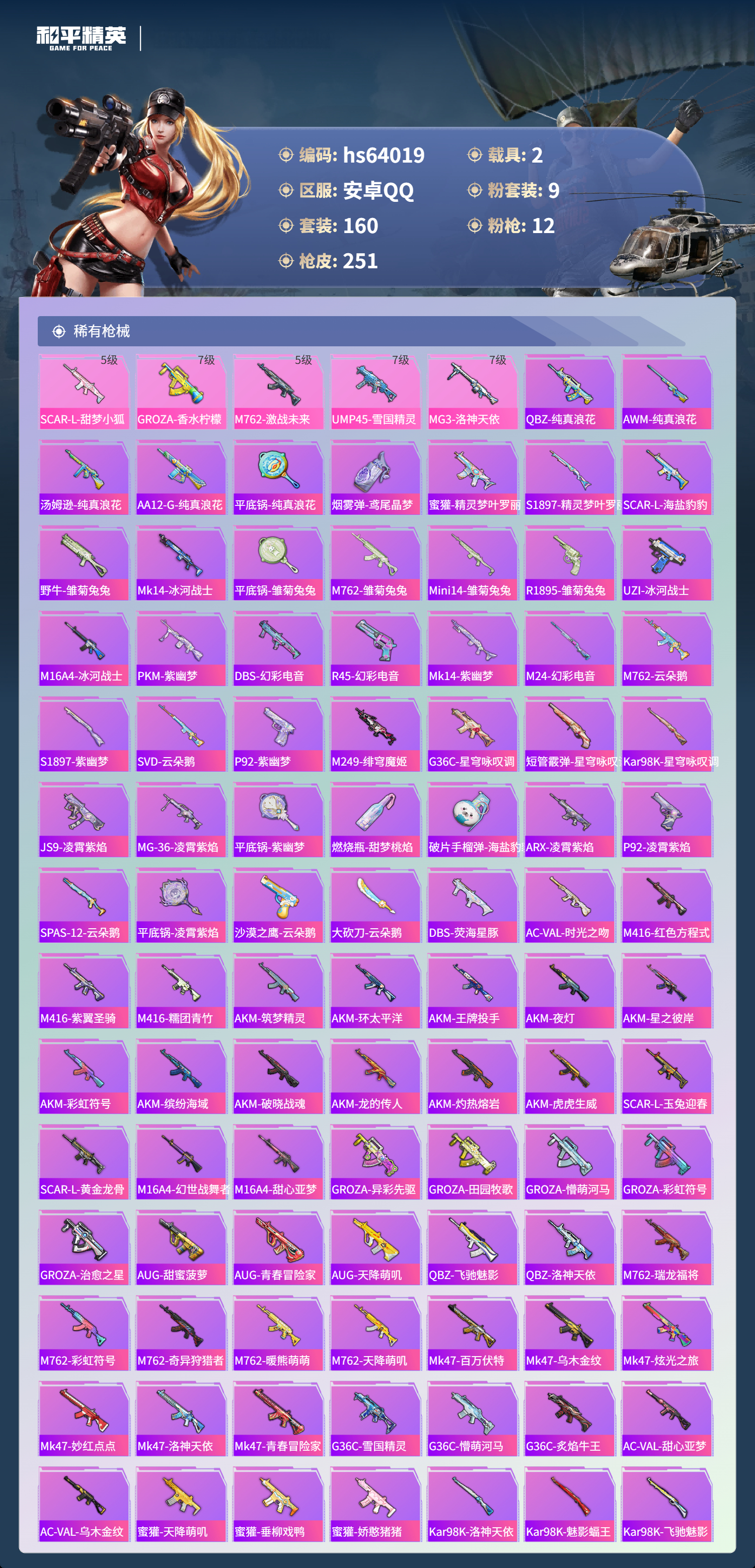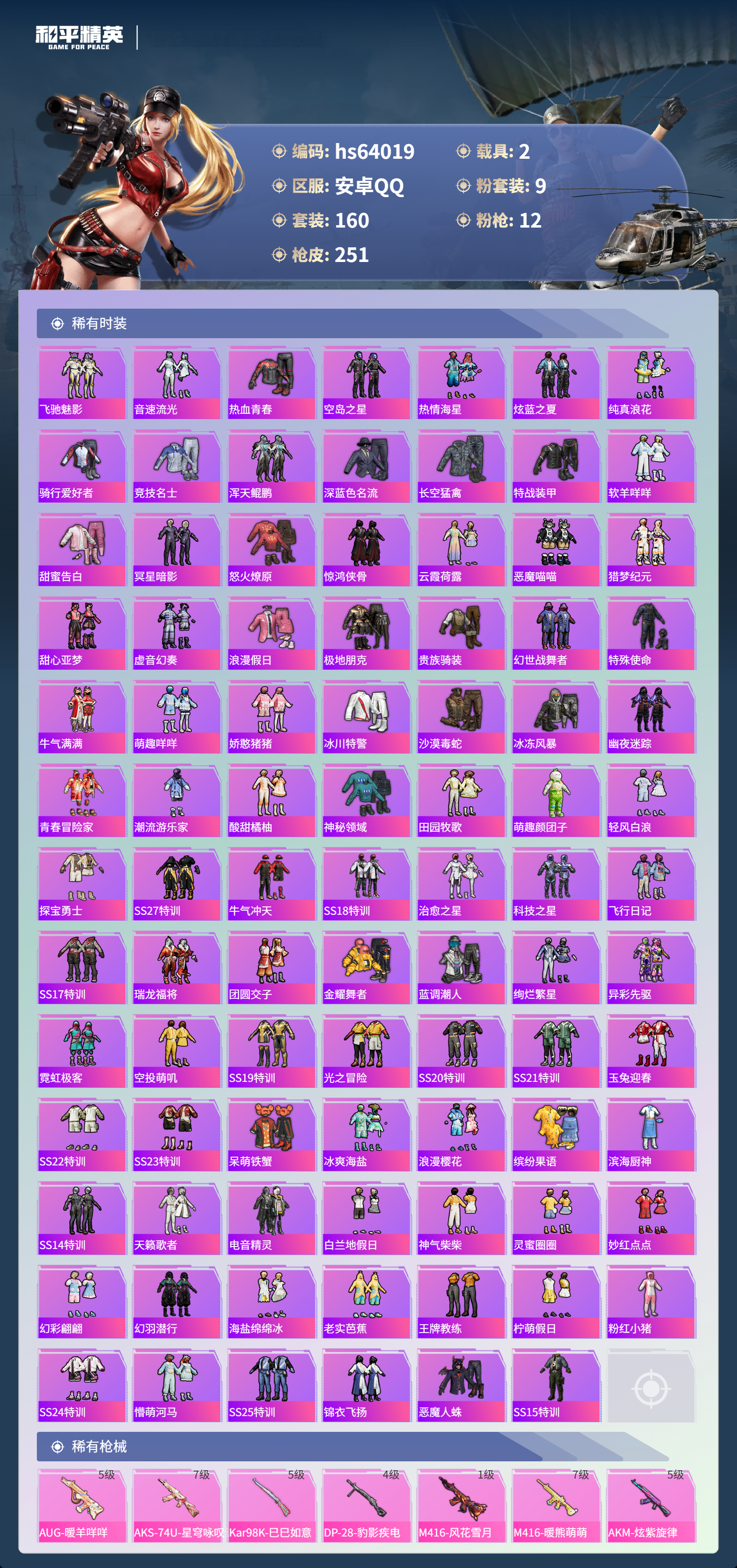 hs64019 安卓手Q-15王牌印记-9粉装-12特效枪-2载具-87950热力值-160套装-251枪皮