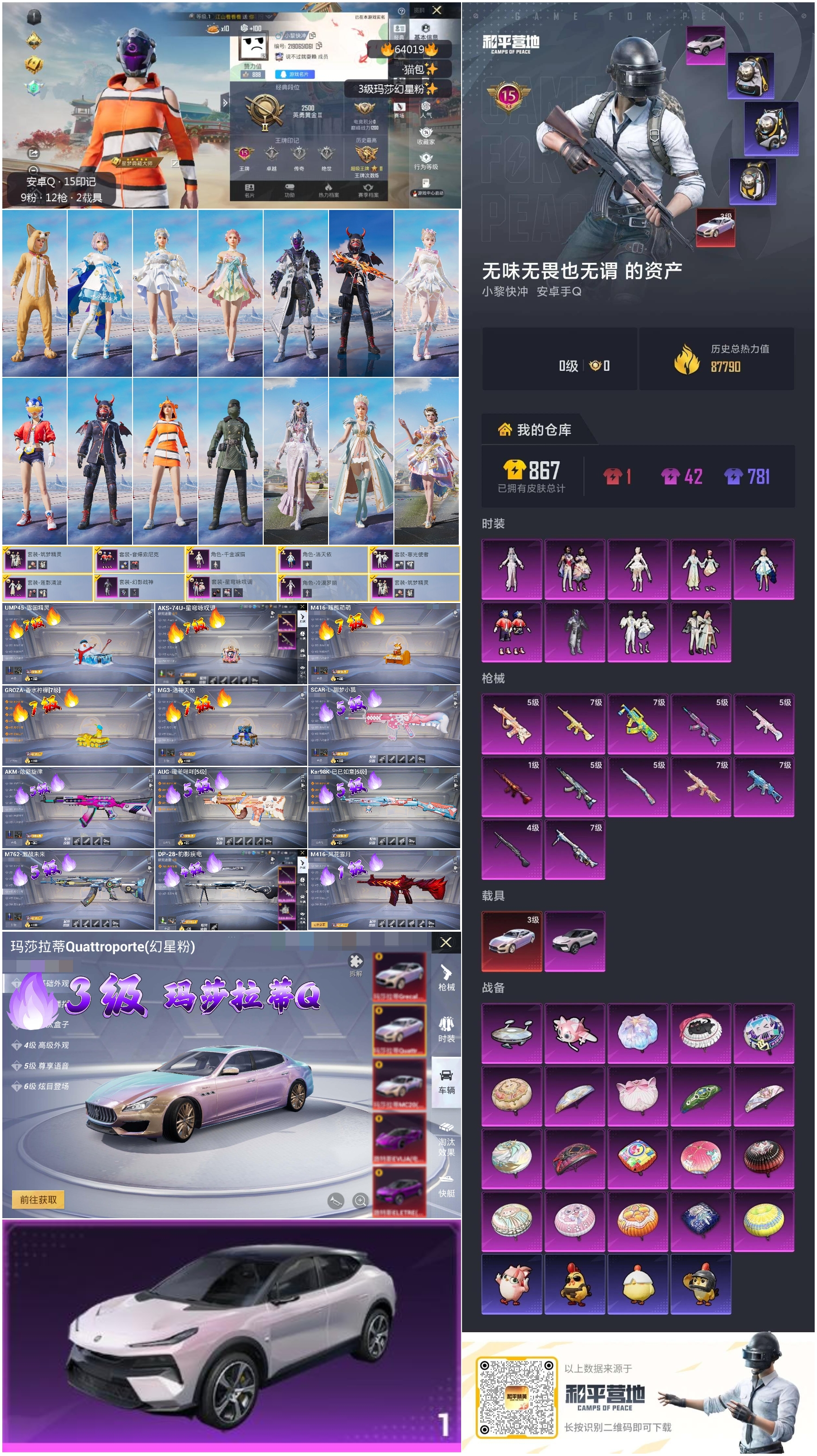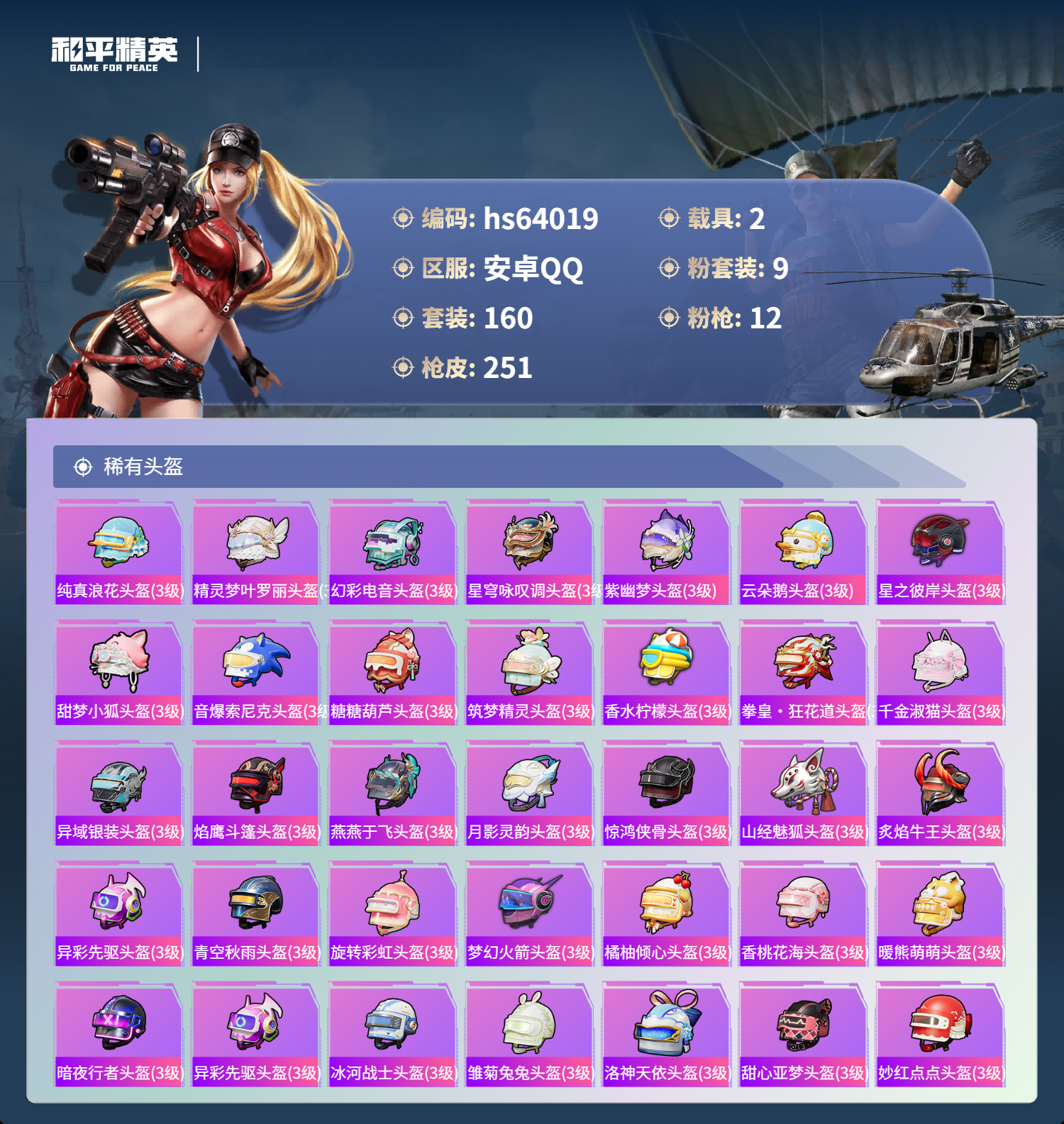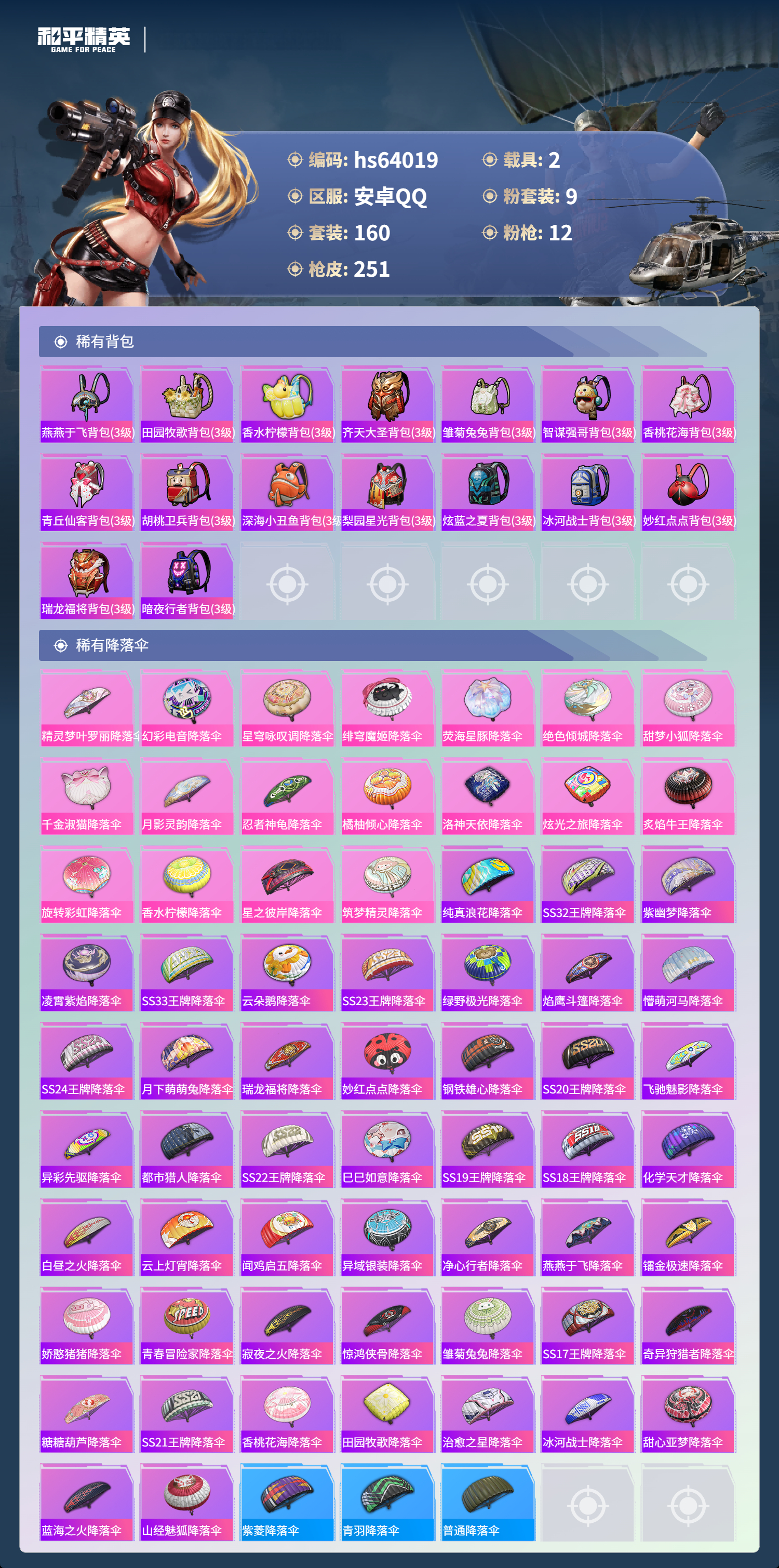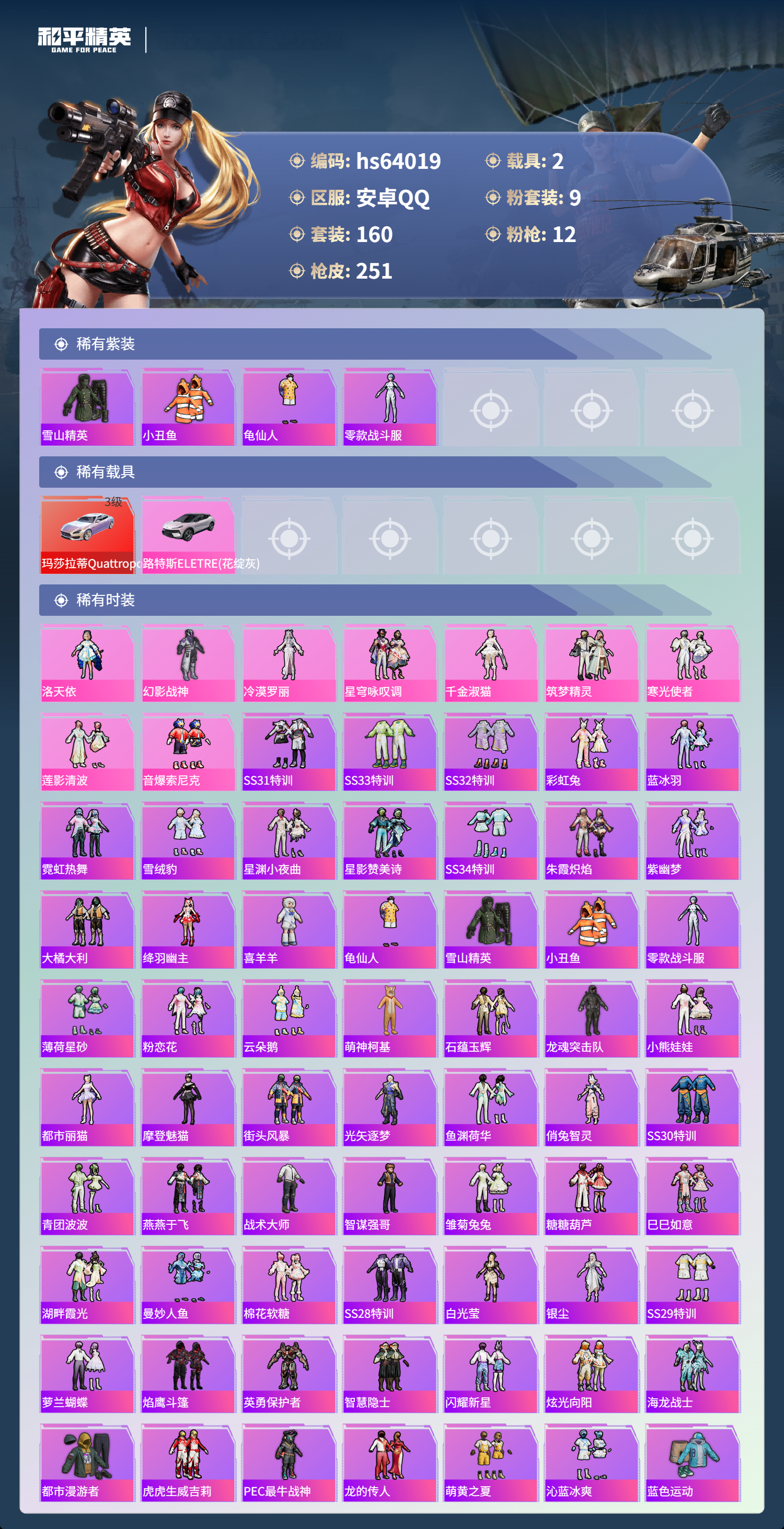 hs64019 安卓手Q-15王牌印记-9粉装-12特效枪-2载具-87950热力值-160套装-251枪皮