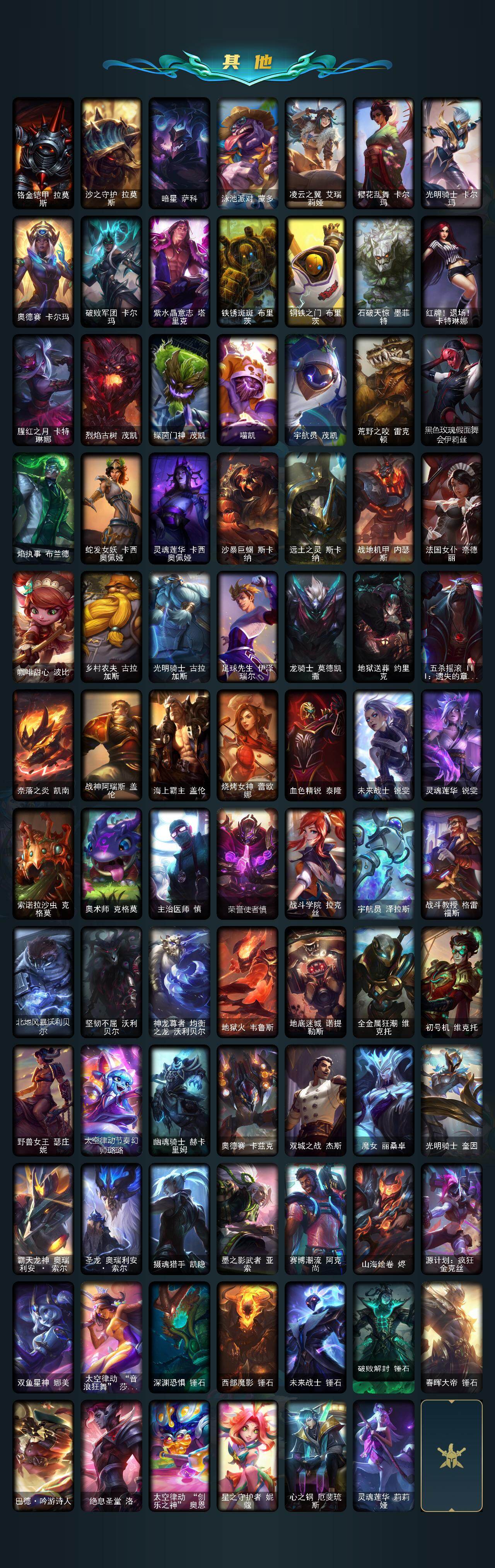 【臻彩皮肤】:无畏骑士瑟庄妮赤子初心,冠军之隐劫凯旋圣装,弹幕天使卡莎炽天使勇敢,幻灵战斗蝠薇恩梦幻强袭,泳池派对奥莉安娜优雅珠光鲸,灵魂莲华卡西奥佩娅流火,可爱可爱粉红红布里茨,魔女阿卡丽虚荣,净雪之月莫甘娜冬虹