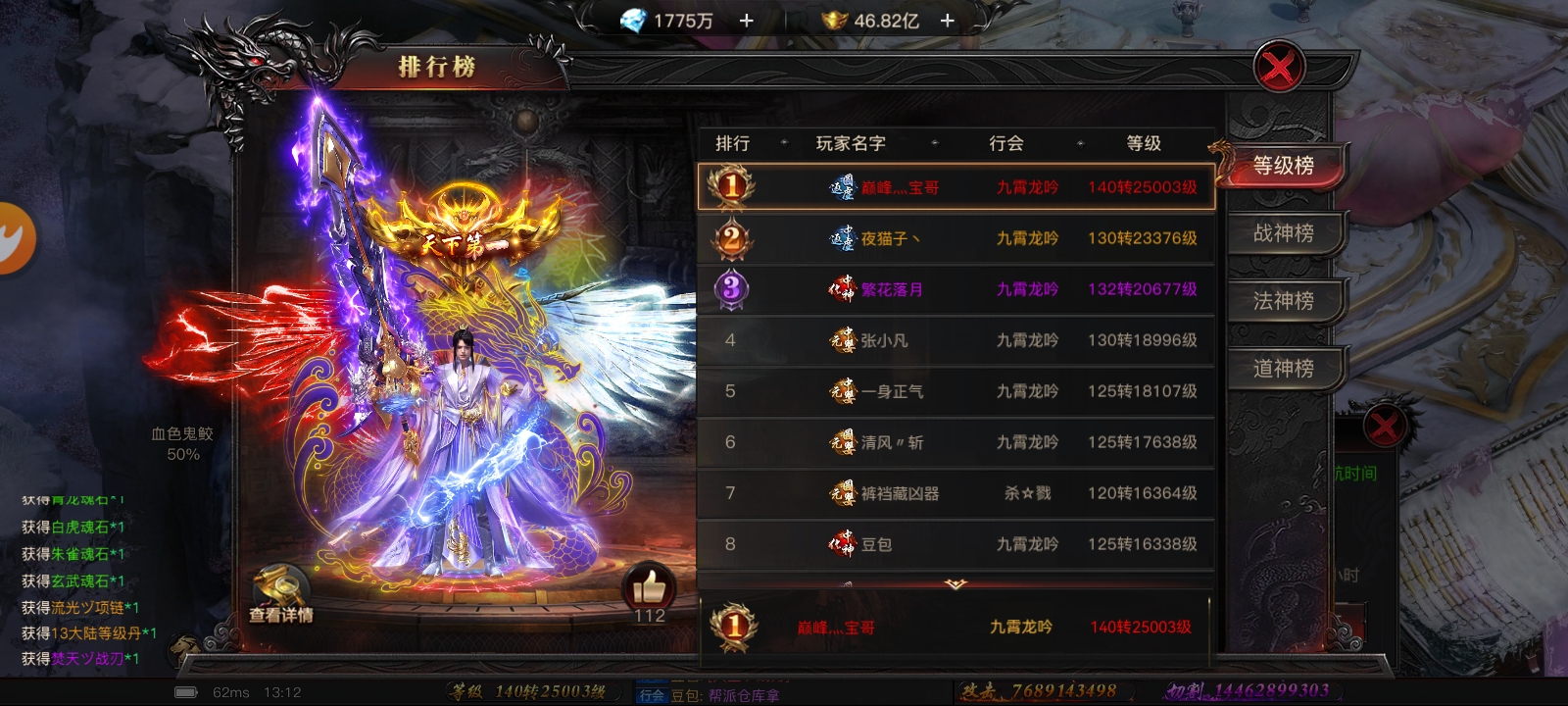 游戏账号烈焰觉醒九游号,140转250003级,战力拉满,排行榜第一,属性高,装备材料齐全,仓库资源