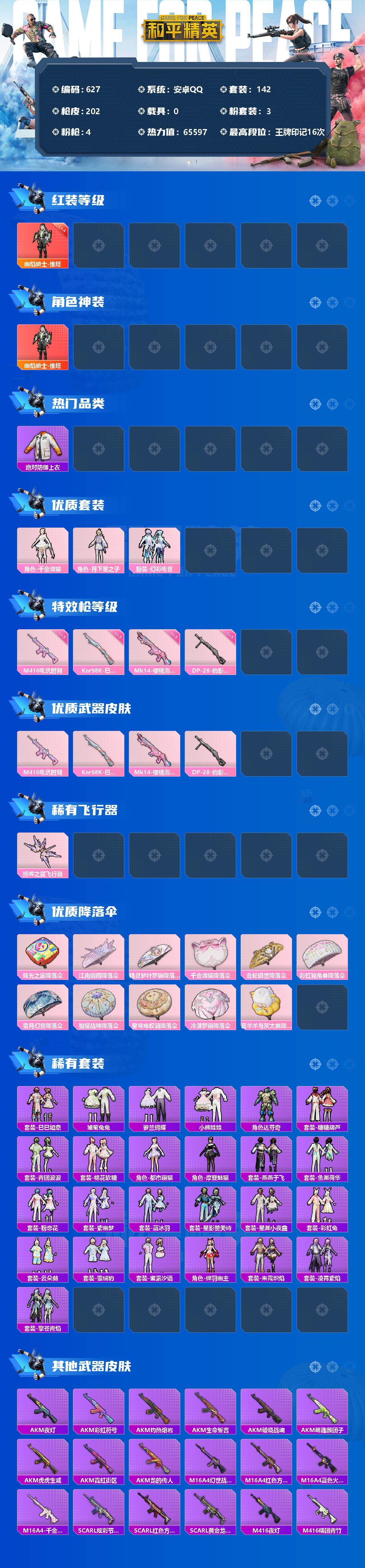【商品标题】:安卓 手Q-1神装-3粉装-4特效枪-0载具-1粉色飞行器-65597热力值-16王牌印记-142套装-202枪皮