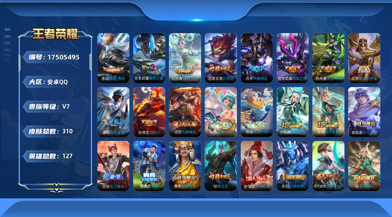 【特价急出/详情看图】安卓Q-V7-最强王者段位-127英雄-310皮肤-1典藏皮肤-1星元-8传说-91史诗【英雄全皮】:孙权全皮,敖隐全皮,影全皮【荣耀典藏】:李白鸣剑曳影【传说皮肤】:公孙离云诺千山,虞姬云霓雀翎,百里玄策白虎志,后羿黄金射手座,孙尚香末日机甲,宫本武藏地狱之眼,孙悟空地狱火,吕布天魔缭乱【限定皮肤】:姜子牙天穹之誓,狄仁杰阴阳师,赵云皇家上将,赵云百木心枪,墨子神迹守卫,嬴政优雅恋人,嬴政白昼王子,鲁班七号狮舞东方,高渐离死亡摇滚,芈月重明,芈月幻夜卜梦,吕布天魔缭乱,吕