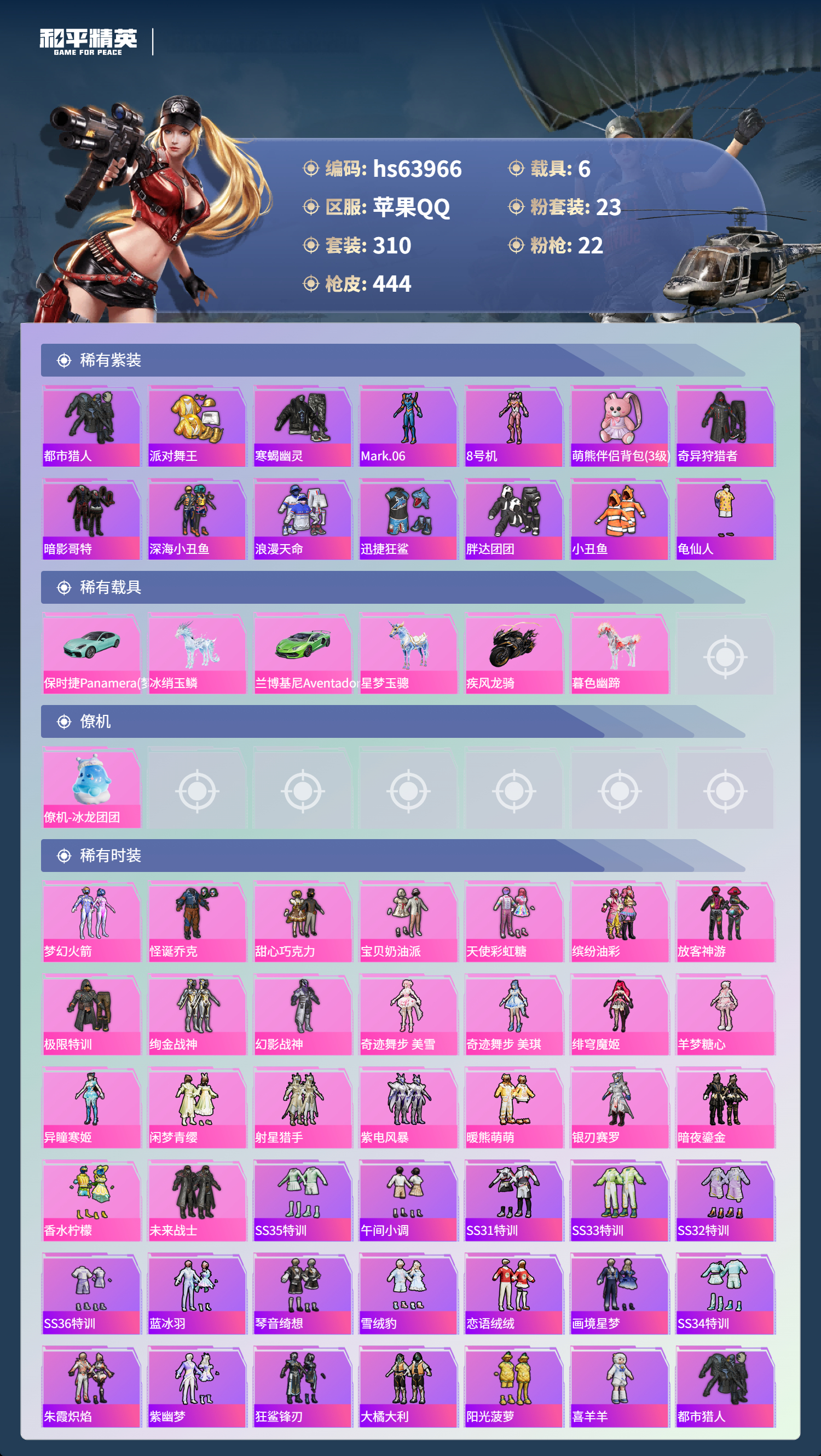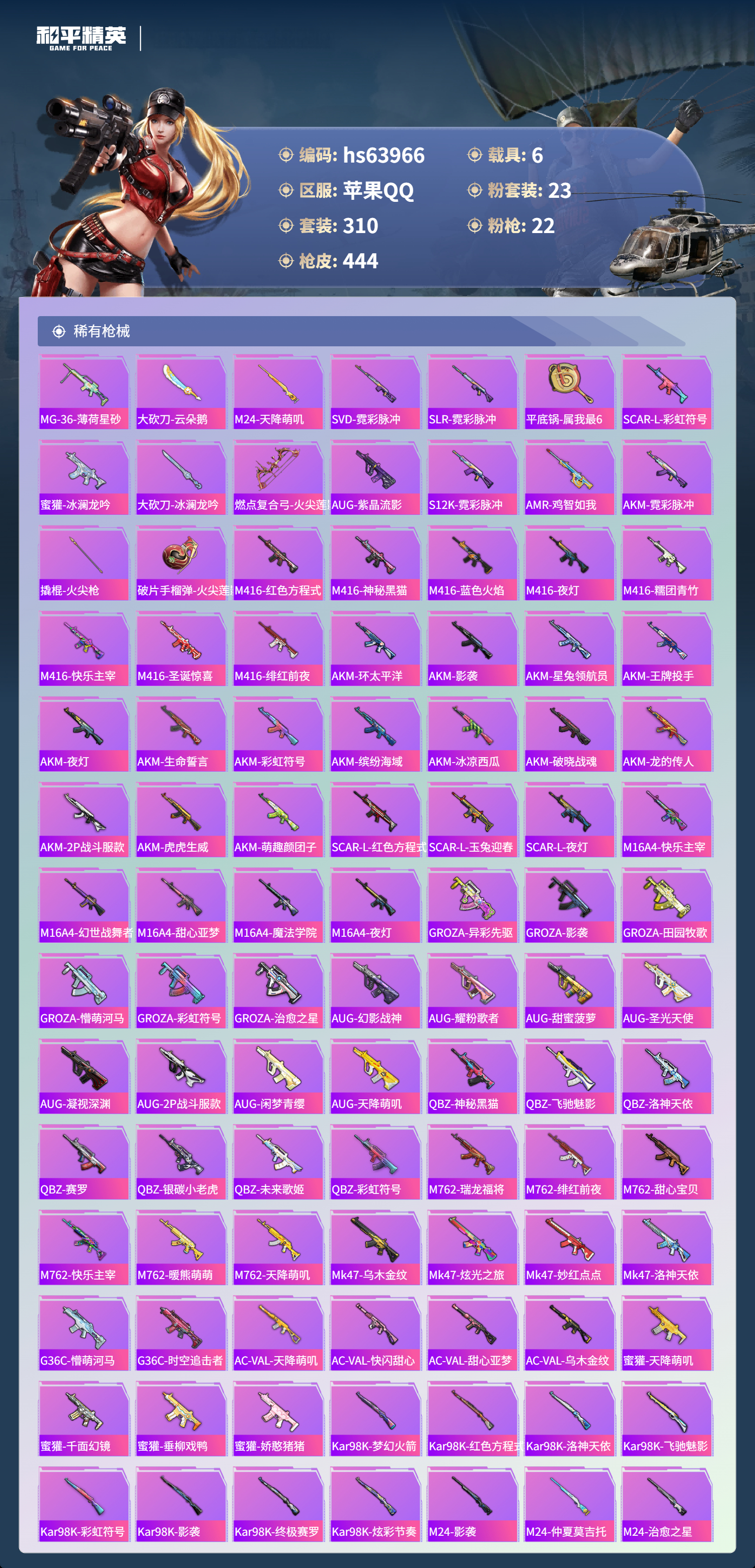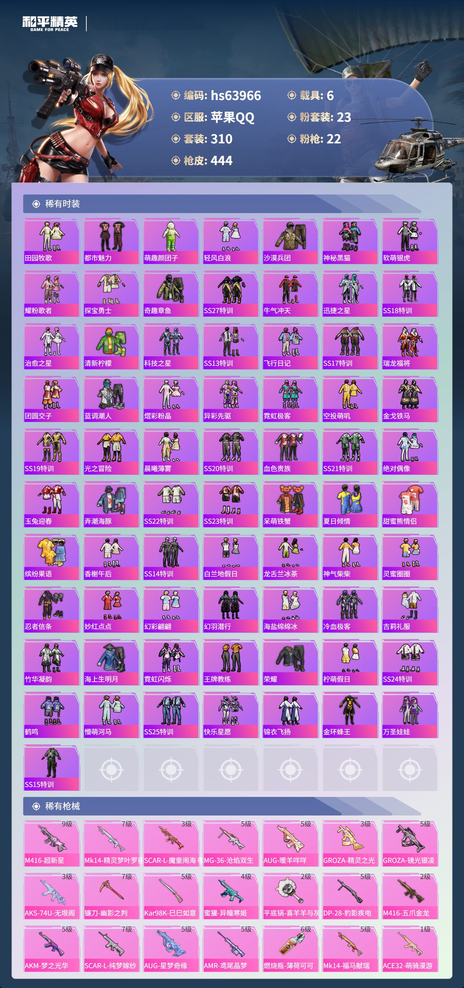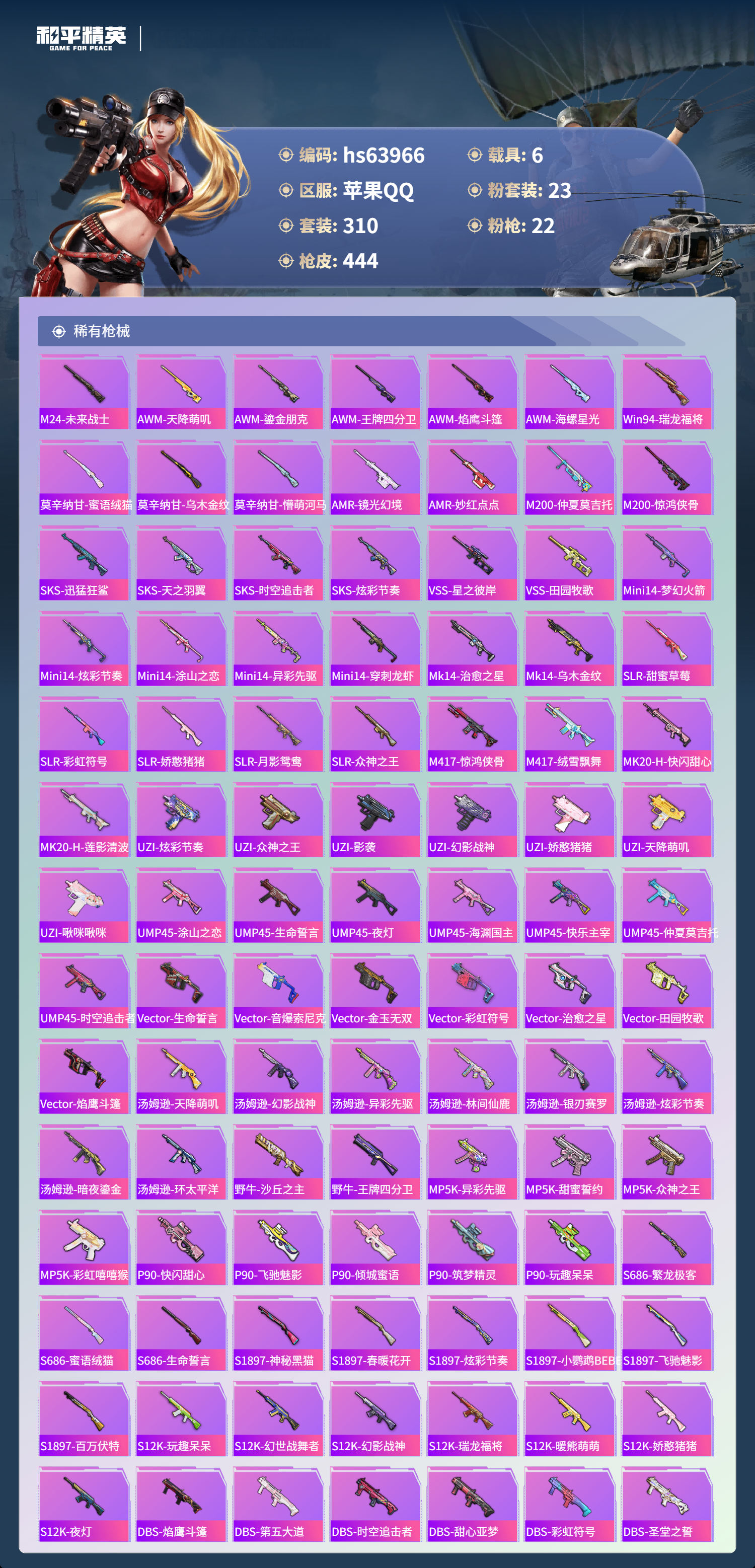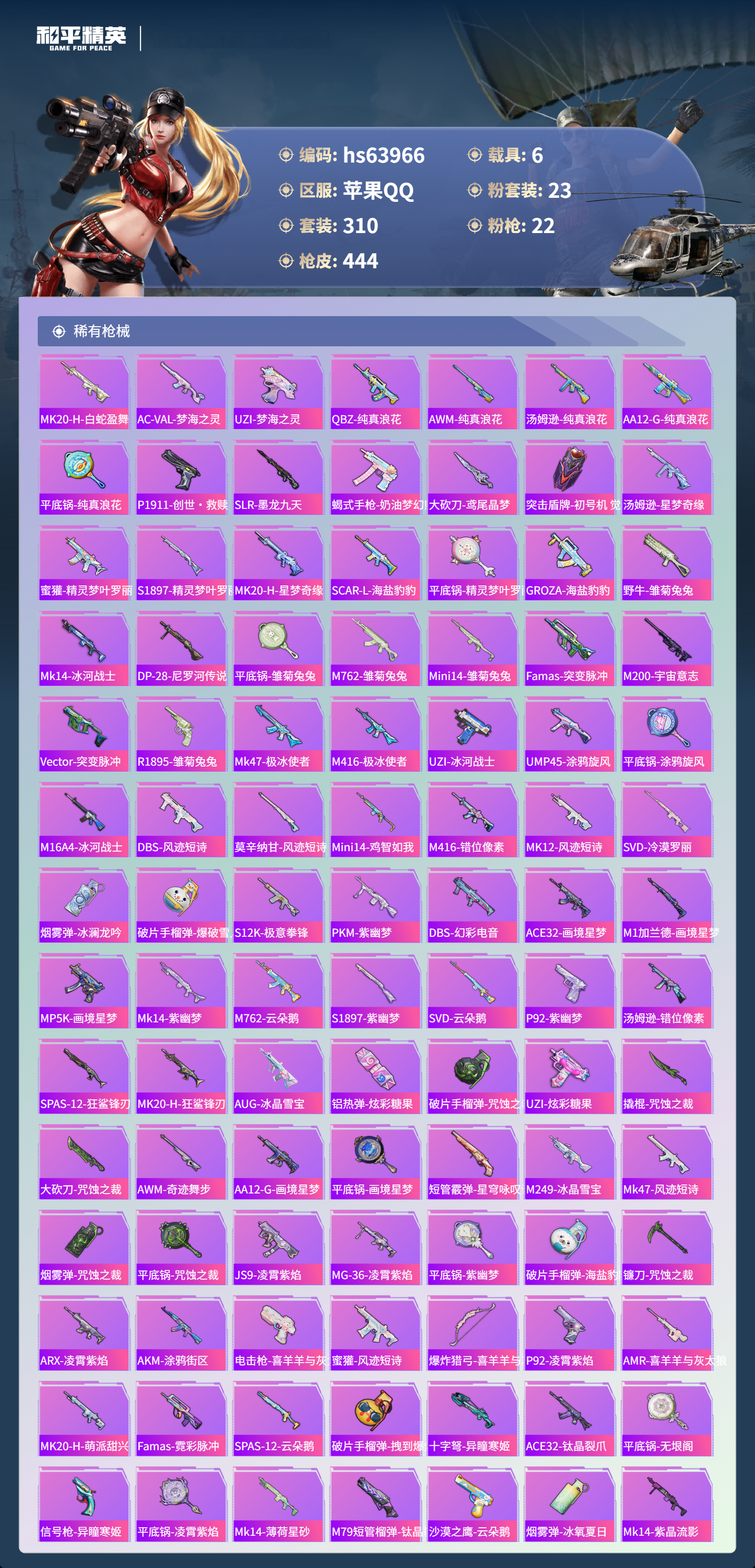 hs63966 苹果手Q-20王牌印记-23粉装-22特效枪-6载具-热力值-310套装-444枪皮-5卓越印记-2传奇印记