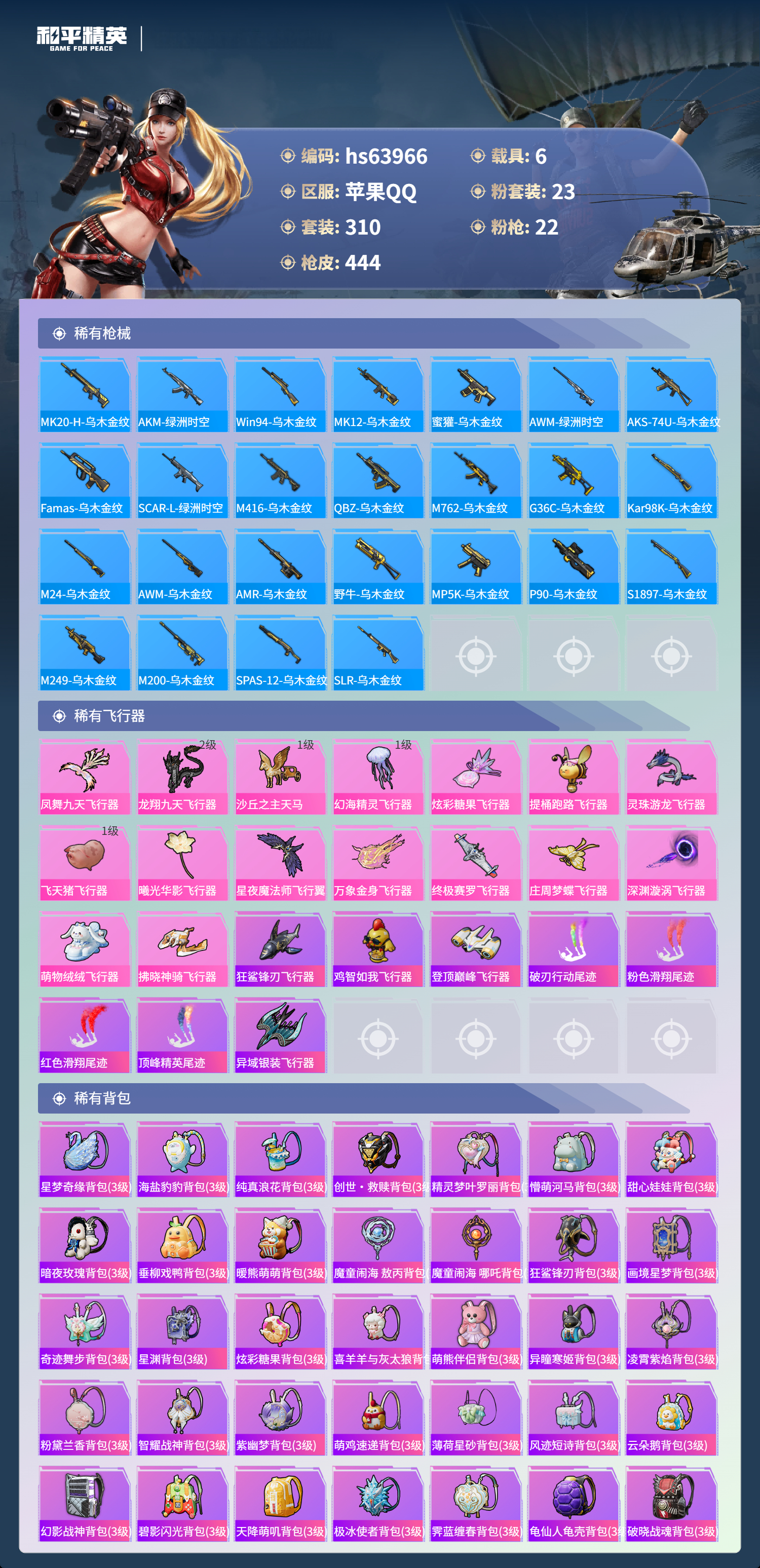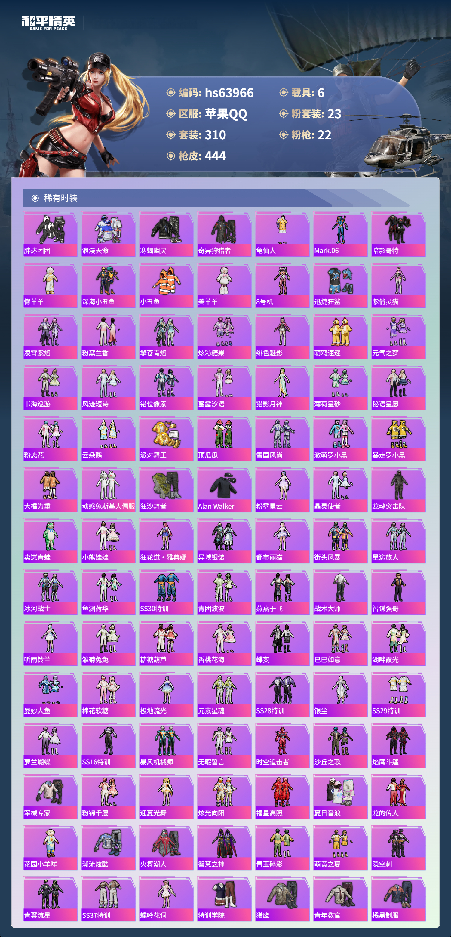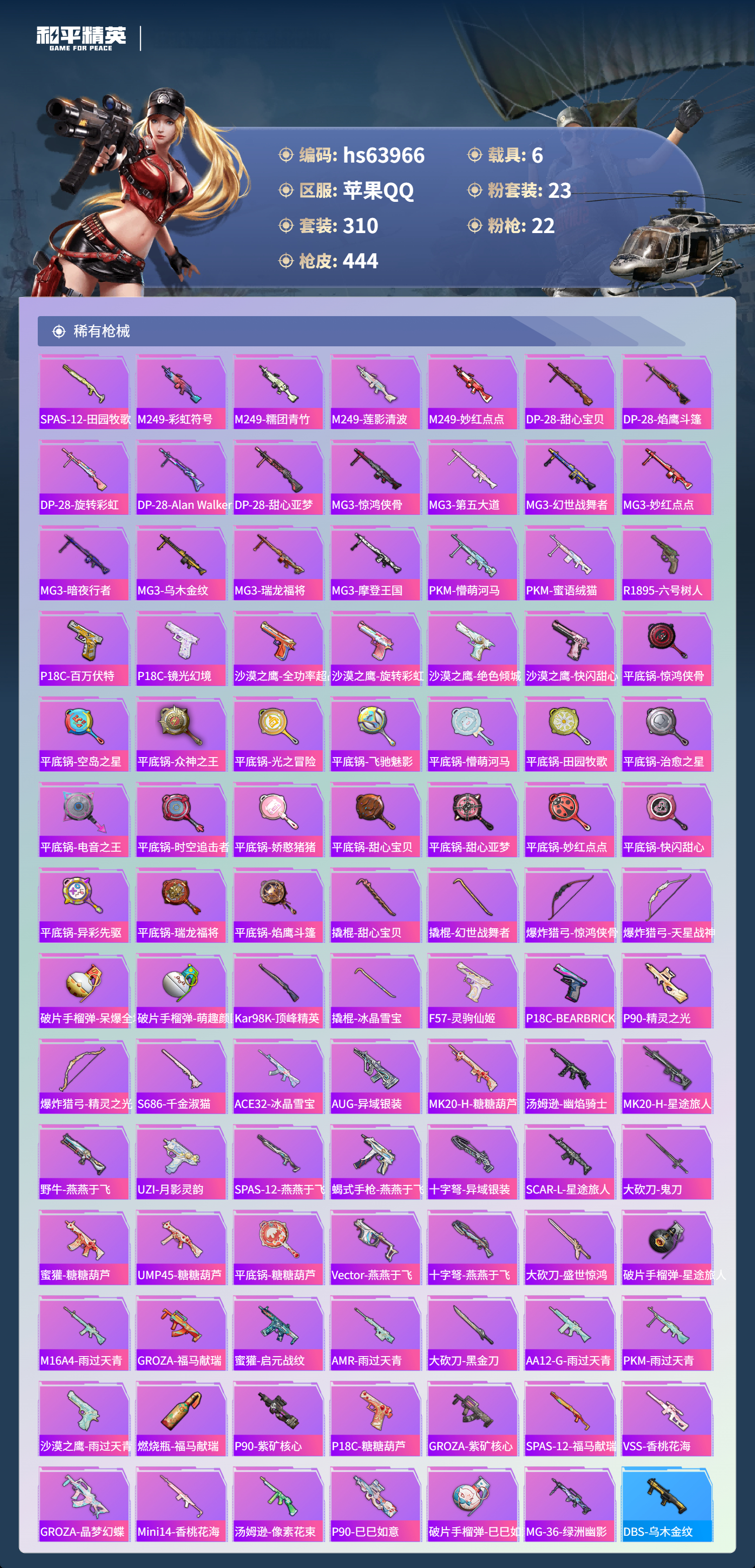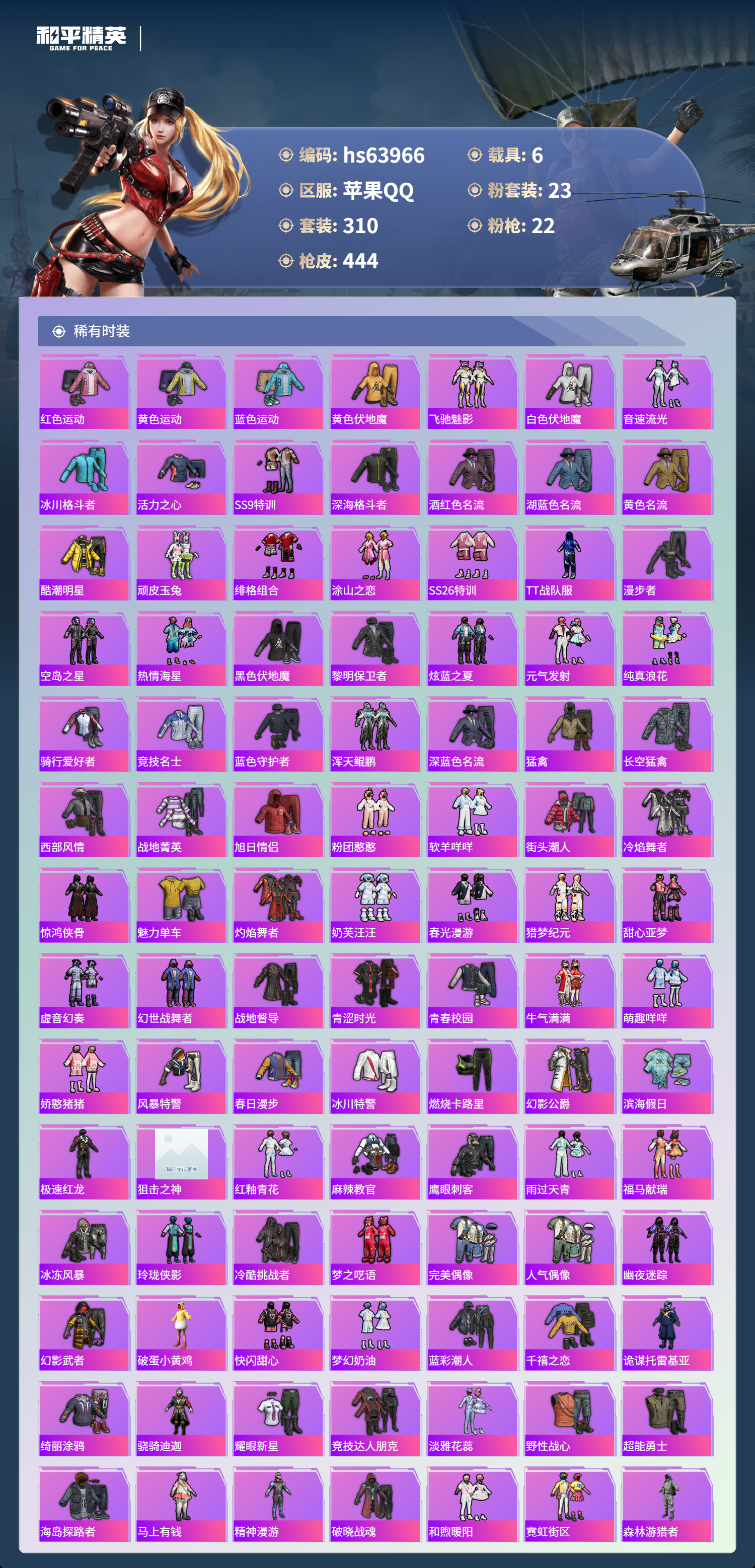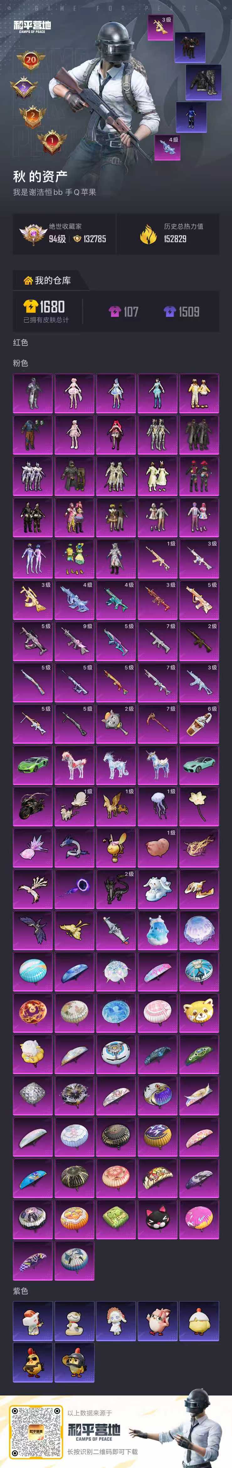 hs63966 苹果手Q-20王牌印记-23粉装-22特效枪-6载具-热力值-310套装-444枪皮-5卓越印记-2传奇印记