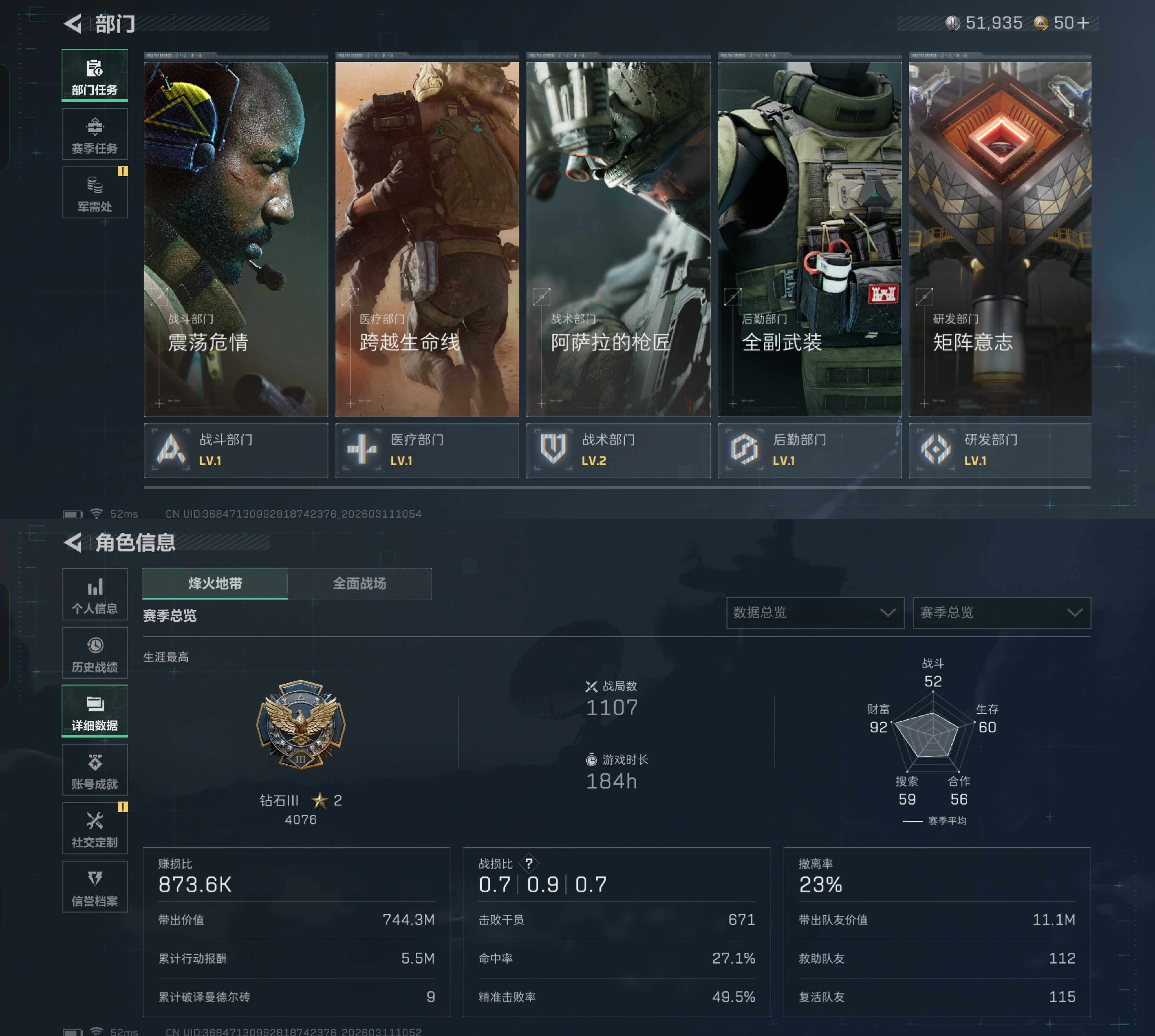 ab67,5把刀北极星暗星龙牙处刑者,无题金牌射手皮肤,总资产25.5M,6格,20橙枪,6金挂饰,蚀金玫瑰差4抽,凌霄戍卫差4抽,特勤快满,仓库7级训练中心4级靶场3级