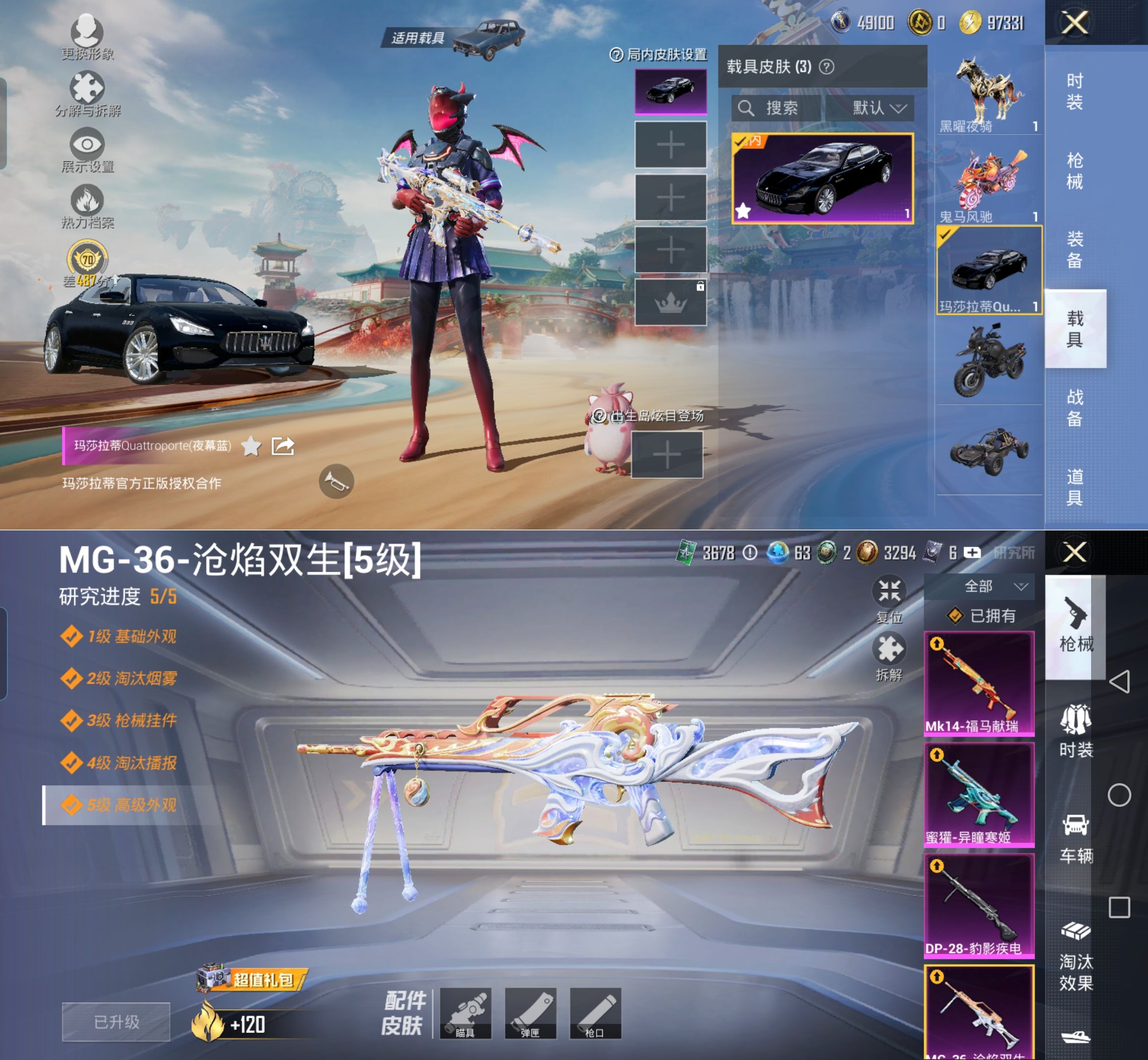 【可二次 女号3载具-6粉装-10特效枪 傲傲奶龙 洛天依 幻彩电音 ,M416-灵猫魔法师[3级],SCAR-L-梦幻火箭[7级],MG3-洛神天依[7级]】安卓手Q-3载具-6粉装-10特效枪-139套装-232枪皮-15王牌印记-超级王牌2星-75624热力值【3载具】鬼马风驰,黑曜夜骑,玛莎拉蒂Quattroporte(夜幕蓝)【6粉装】幻彩电音,旋转彩虹,星之彼岸,傲傲奶龙,角色-洛天依