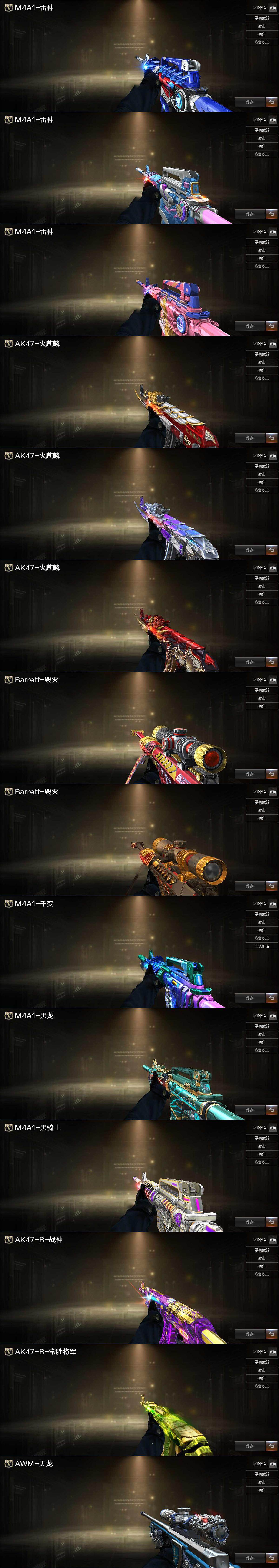 【皮肤】:雷神-机甲刑天皮肤,雷神-宇航兔皮肤,雷神-维纳斯皮肤,火麒麟-华夏之心,AK47-火麒麟-传奇EVEN,火麒麟-平天大圣,毁灭-AG-CFPLS15冠军,毁灭-英雄计划 皮肤,