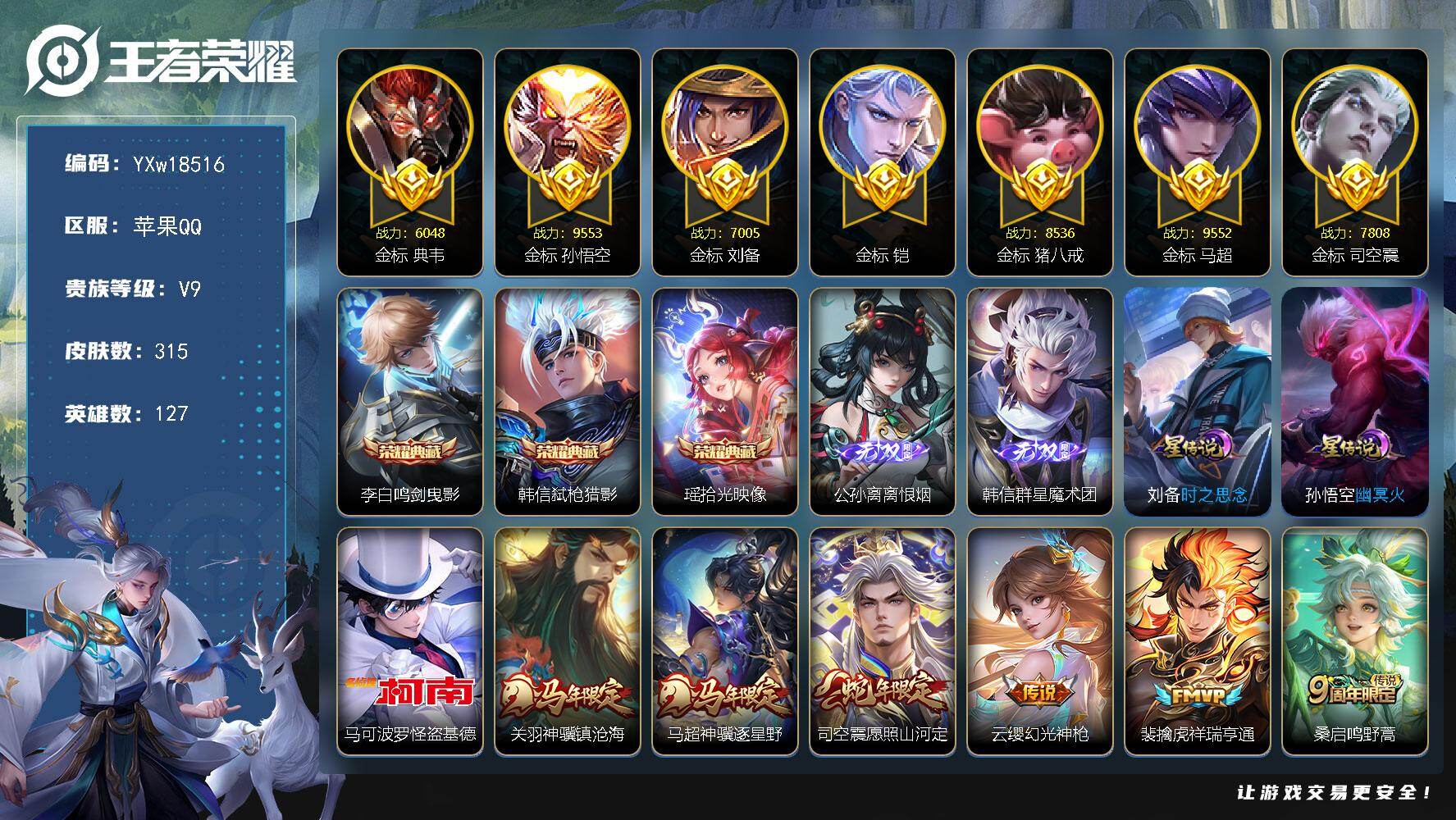 【精品推荐·鸣剑曳影·弑枪猎影·拾光映像·离恨烟·韩信群星魔术团·怪盗基德·全皮马超·夜礼服假面·神骥镇沧海·神骥逐星野·愿照山河定·李逍遥·马超琥珀纪元·乘龙铭钟鼎·怪盗基德天幕·可二次】YXw18516-苹果Q-127英雄-315皮肤-13王者印记-260铭文-贵族积分11w【贵族9】【3典藏·2无双·1珍品·2星传说·34传说·1天幕·46按键】【因赛季更新游