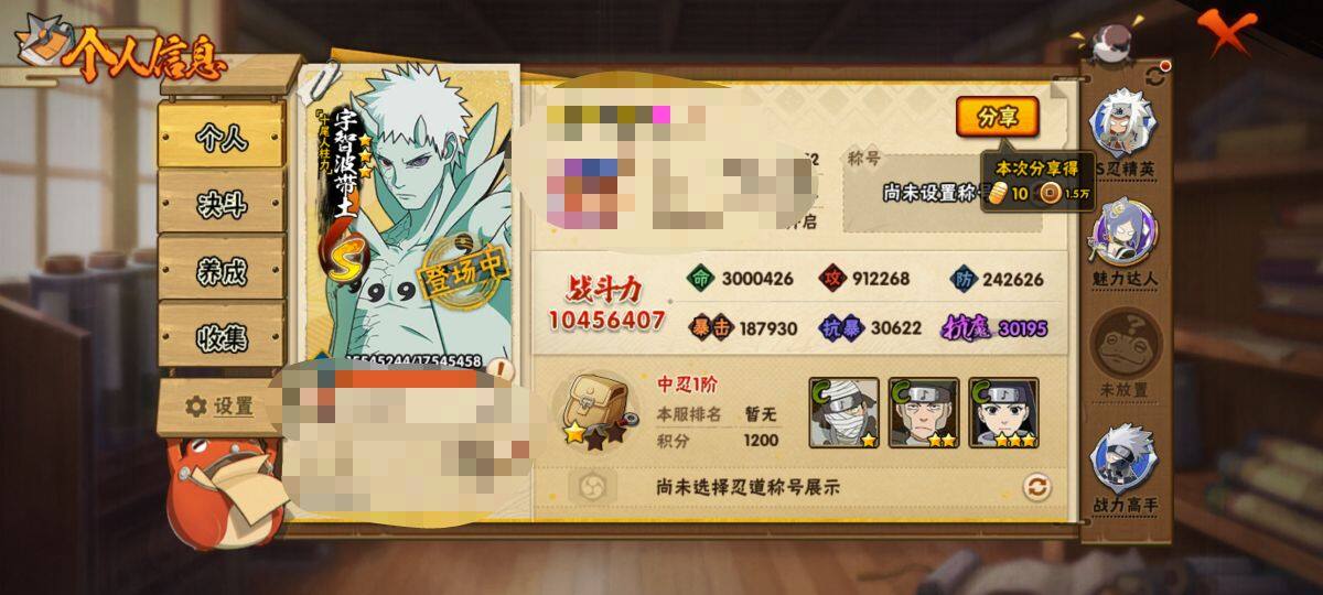 V9/战力1045W/S忍18/A忍43/2星大野木「侠隐江湖