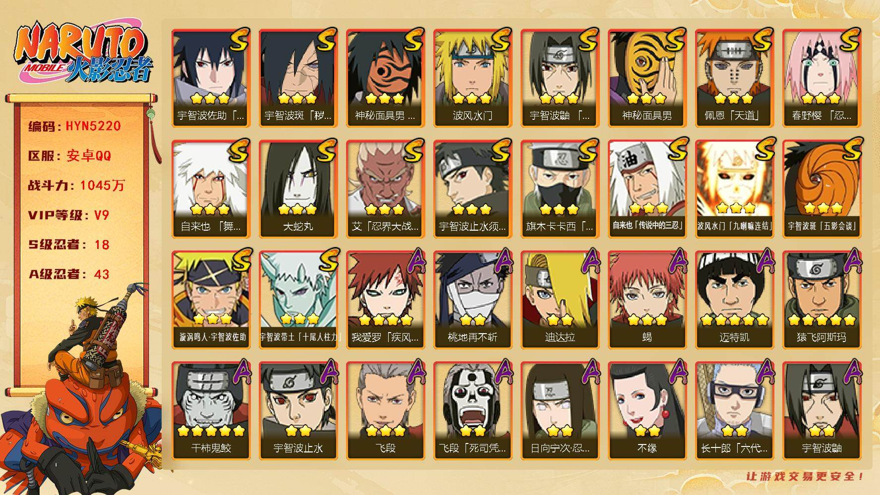 【HYN5220】V9/战力1045W/S忍18/A忍43/2星大野木「侠隐江湖」/3星波风水门「九喇嘛连结」/3星宇智波带土「十尾人柱力」/死司凭血-飞段/宇智波止水/5星猿飞阿斯玛/须佐能乎-旗木卡卡西/火影继承人-猿飞日斩/五代目水影-照美冥/3星蝎/5星迈特凯/六代目水影-长十郎/2星蝎「绯流琥」/2星桃地再不斩「秽土转生」/3星自来也「传说中的三忍」/恶灵之影-飞段/四代目土影-黑土/忍界大战-勘九郎/晓创生-角都/半蛇斗篷-药师兜/忍界大战-春野樱/迪达拉/4星我爱罗「疾风传」/不缘