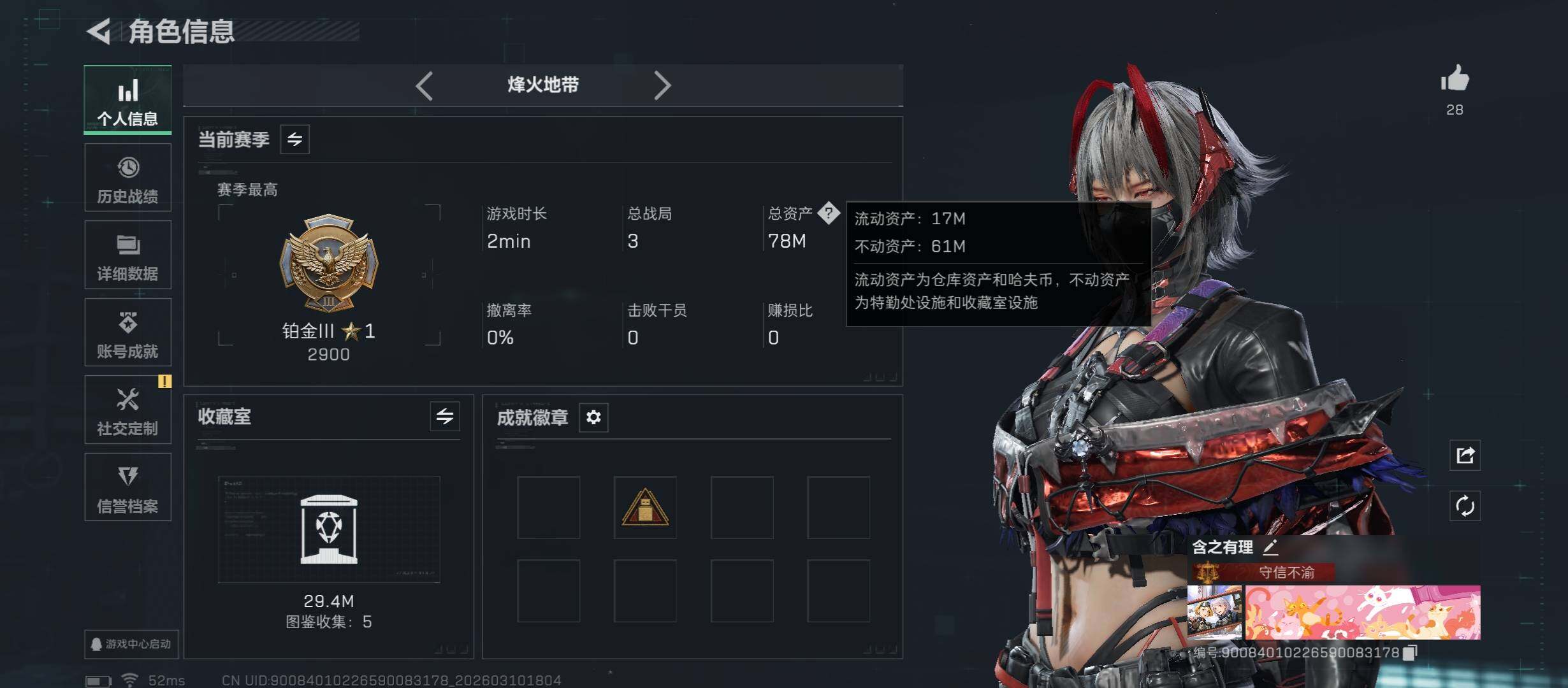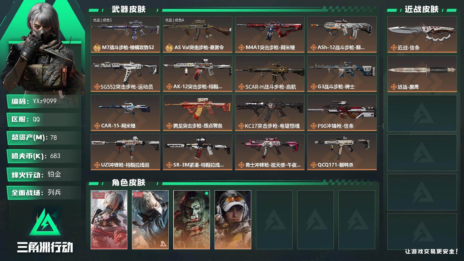 【追缴68M】【热门组合搭配:单红+信条+二典藏-维什戴尔】【无二次协助处理】YXz9099-特勤处:仓库8级/靶场6级/训练中心7级-78m总资产-68w哈伏币-60烽火等级-铂金-17战场等级-列兵