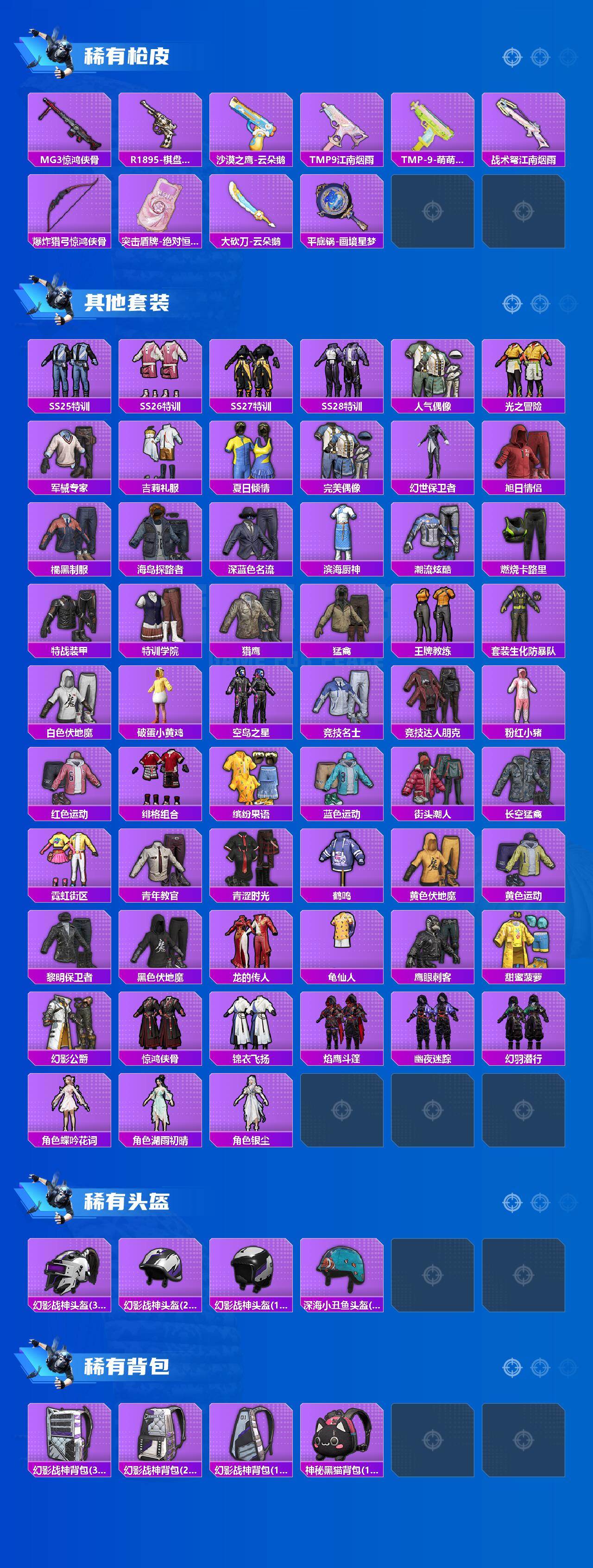 【粉色枪皮等级】:AKS-74U-森灵之息(五级),Kar98K-巳巳如意(五级),Mk14-甜梦熊击(五级),Mk14-福马献瑞(五级),DP-28-豹影疾电(五级),PKM-江南烟雨(七级)