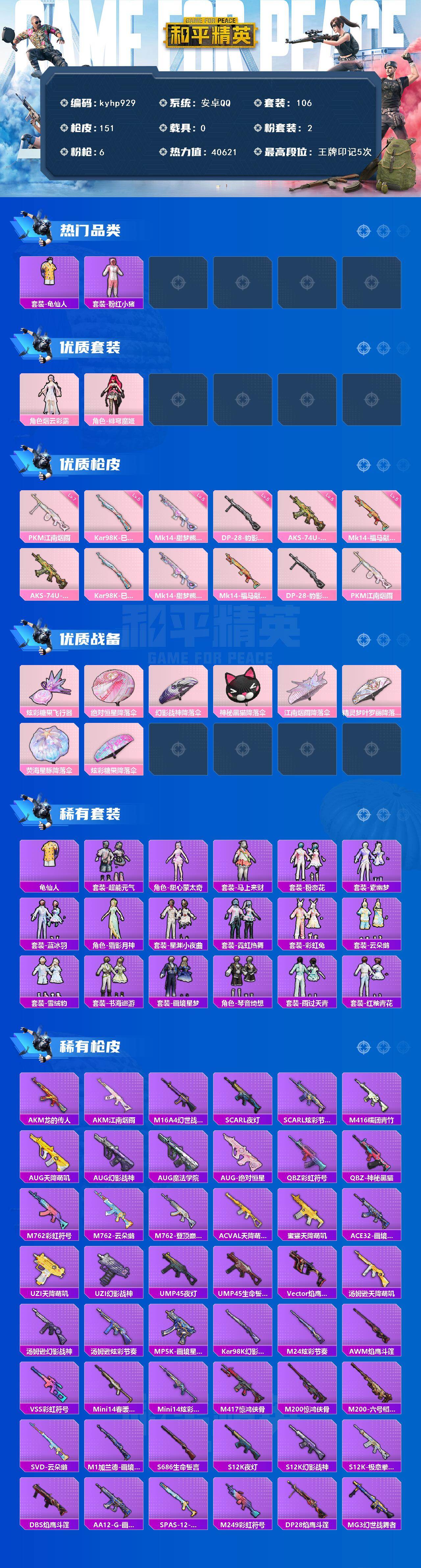 安卓 手Q-2粉装-6特效枪-0载具-1粉色飞行器-40621热力值-5王牌印记-106套装-151枪皮