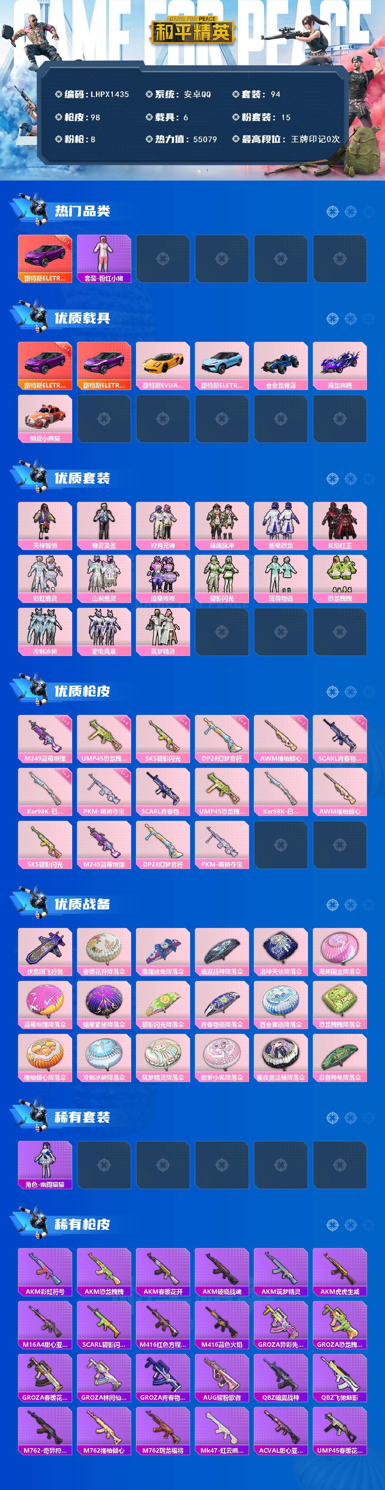 可二次【特价出售/店主推荐】 安卓 手Q-15粉装-8特效枪-6载具-1粉色飞行器-55079热力值-1王牌印记-94套装-98枪皮【红色载具】:路特斯ELETRE(电光紫)(一级)【热门品类】:套装-粉红小猪【粉色套装】:粉装-天禅智恒,粉装-彗云及圣,粉装-狩月元帅,粉装-琉璃脉冲,粉装-新星烈龙,粉装-炙焰红王,粉装-彩虹鹿灵,粉装-山涧鹿灵,粉装-流星咚咚,粉装-碧影闪光,粉装-薄荷物语