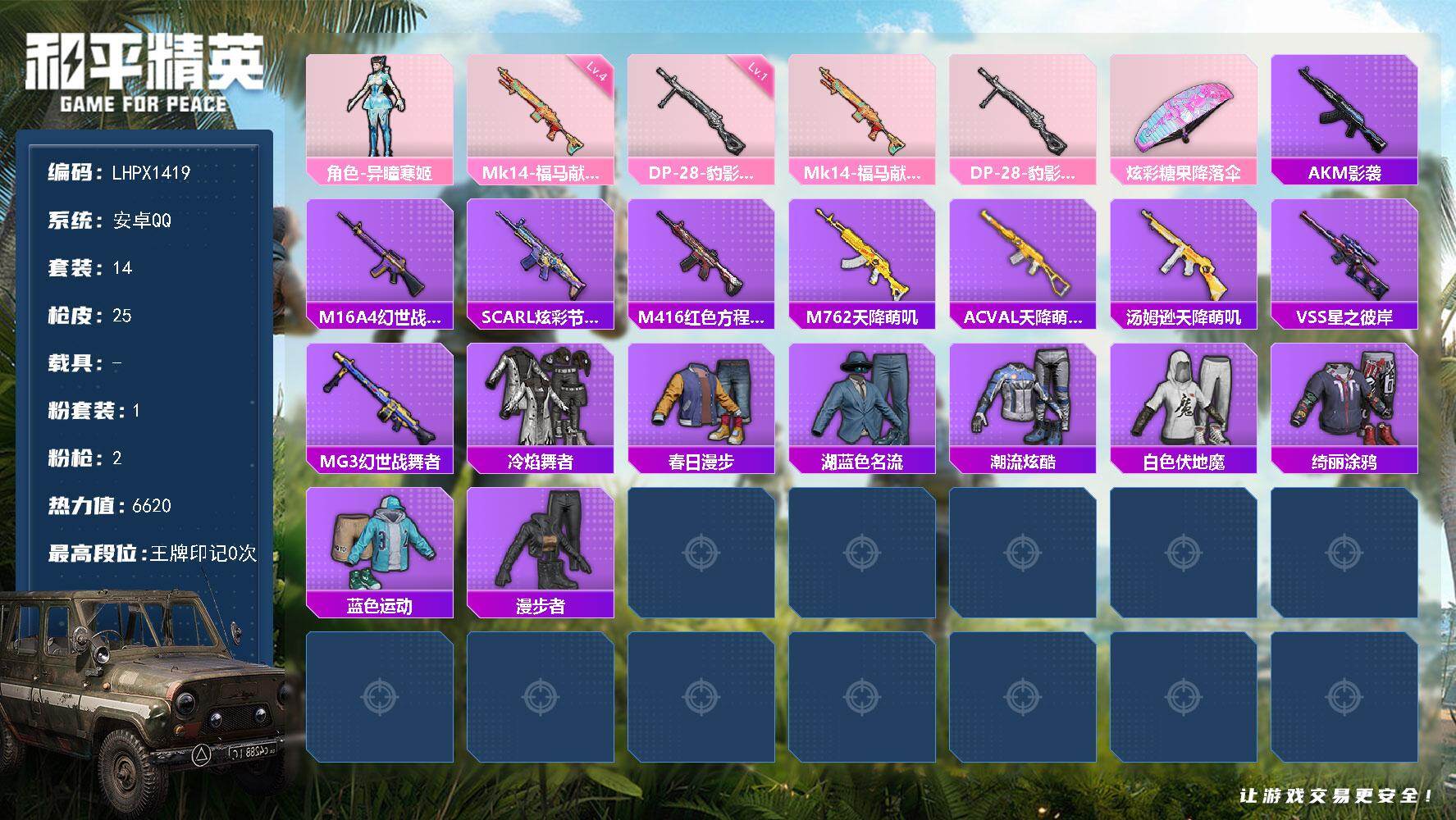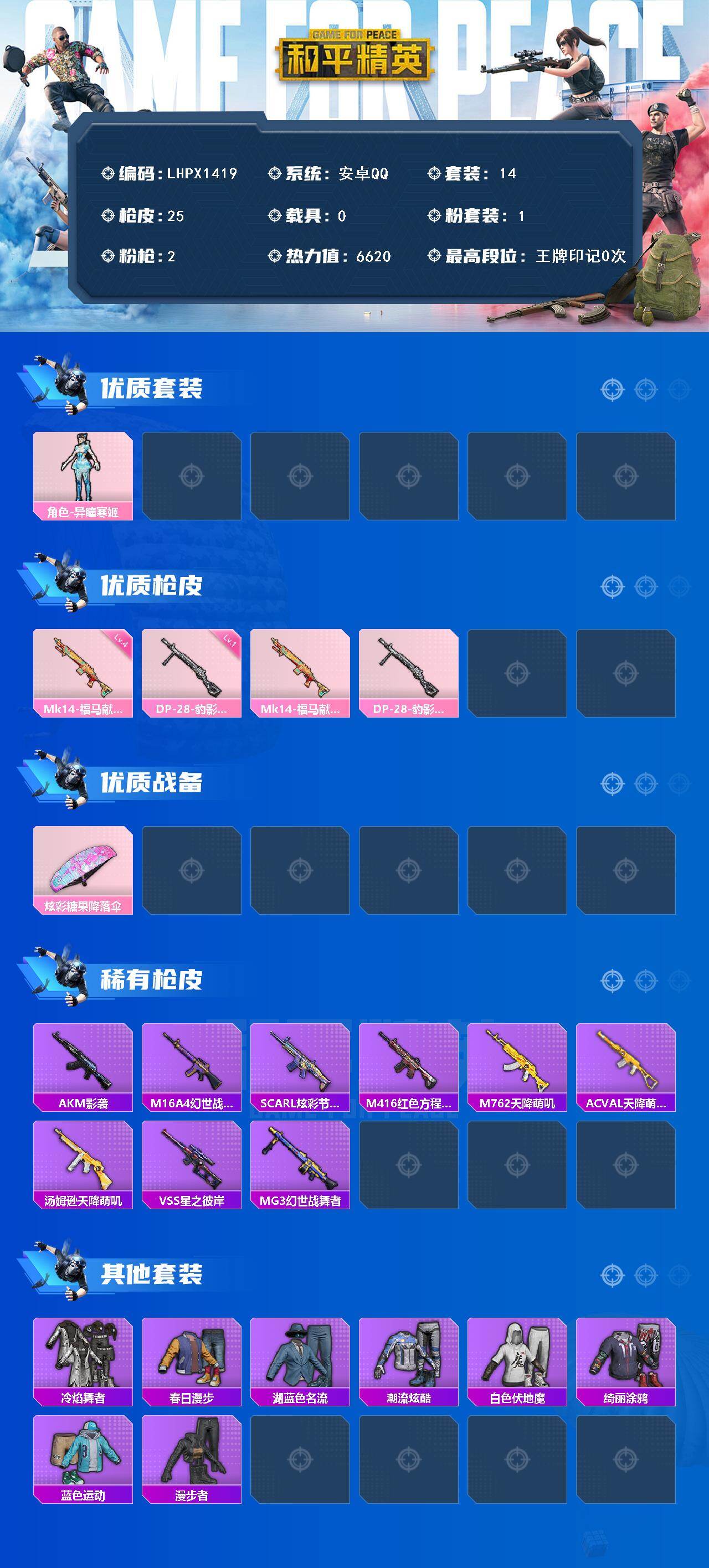 可二次【特价出售/店主推荐】安卓 手Q-1粉装-2特效枪-6620热力值-14套装-25枪皮【粉色套装】:角色-异瞳寒姬【粉色枪皮等级】:Mk14-福马献瑞(四级),DP-28-豹影疾电(一级)【粉色枪皮】:Mk14-福马献瑞,DP-28-豹影疾电