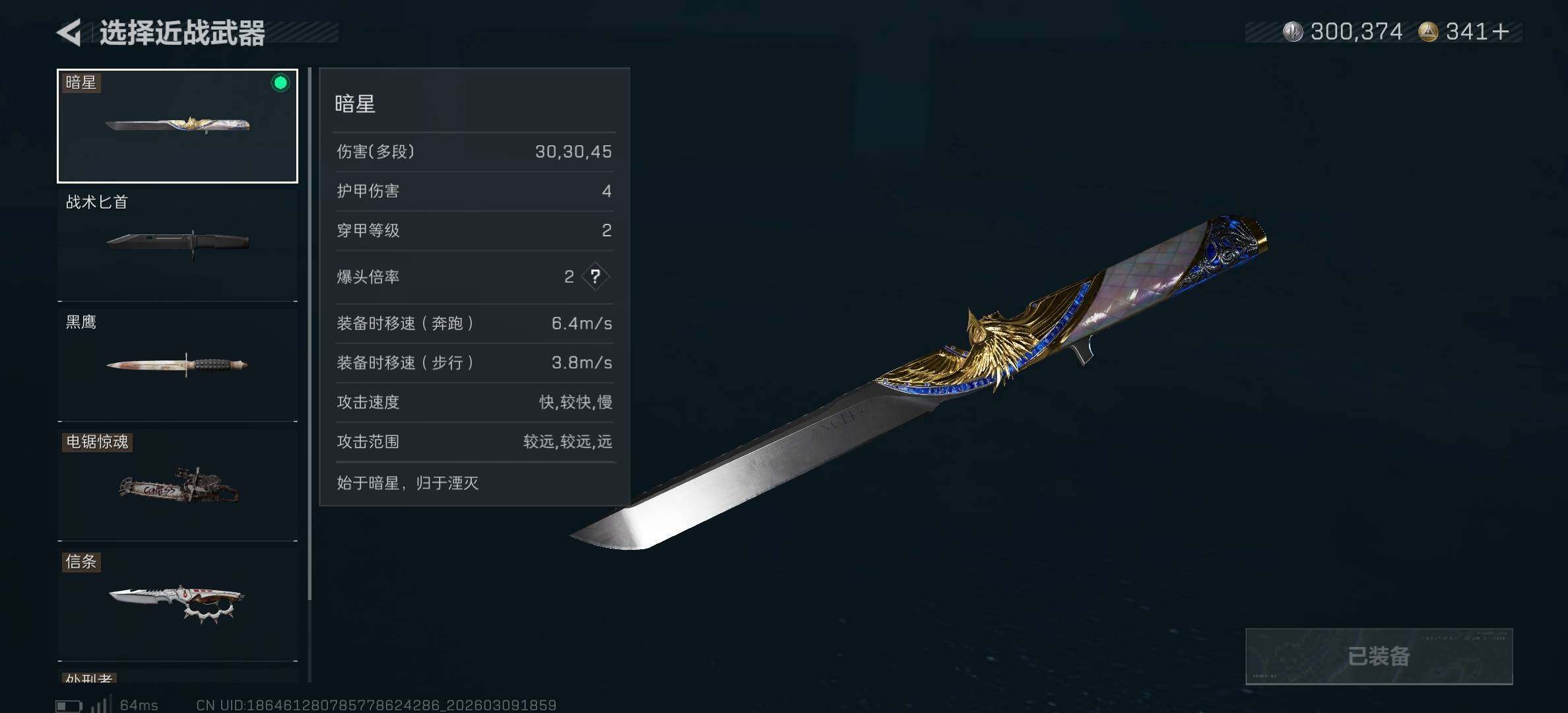 【近战皮肤】:近战-暗星,近战-信条,近战-电锯惊魂,近战-处刑者2级,近战-黑鹰