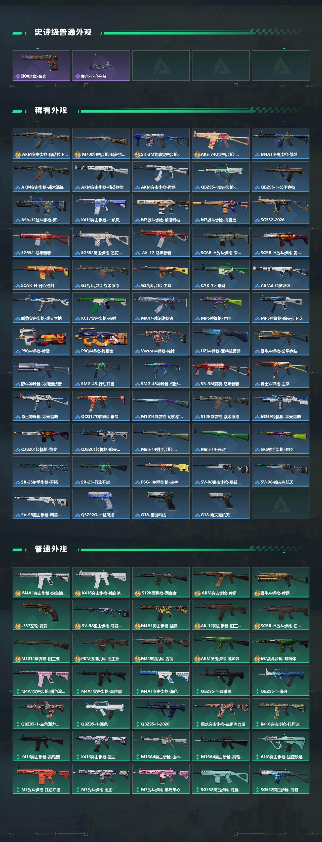 【传说外观】:M4A1突击步枪-阿米娅,AKM突击步枪-锦绣,QBZ95-1突击步枪-凌霄戍卫,ASh-12战斗步枪-鹅鸭杀,AUG