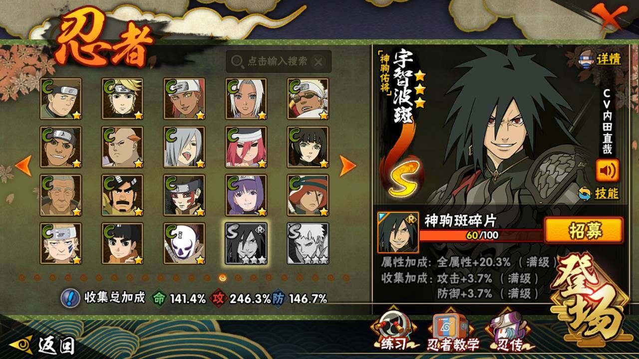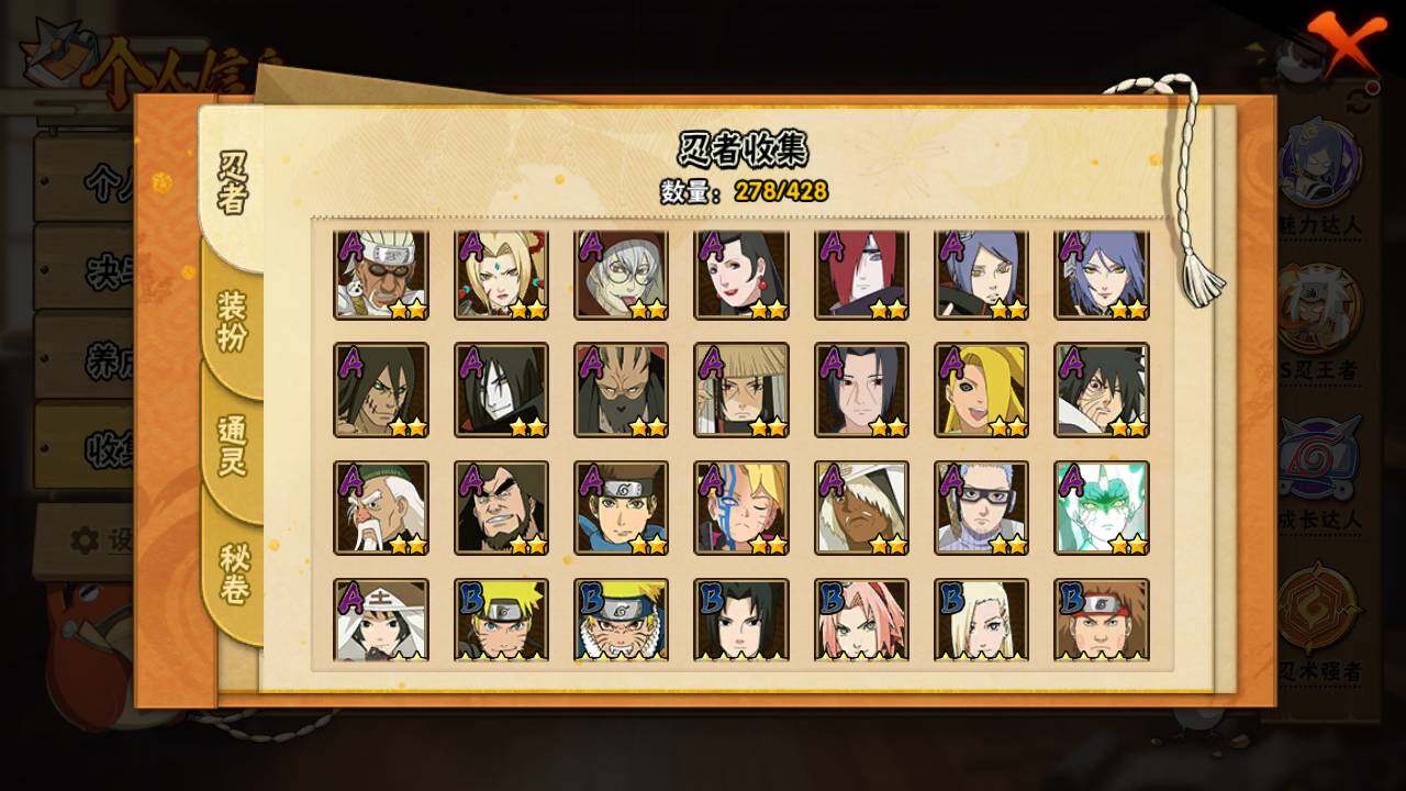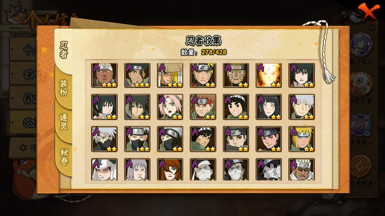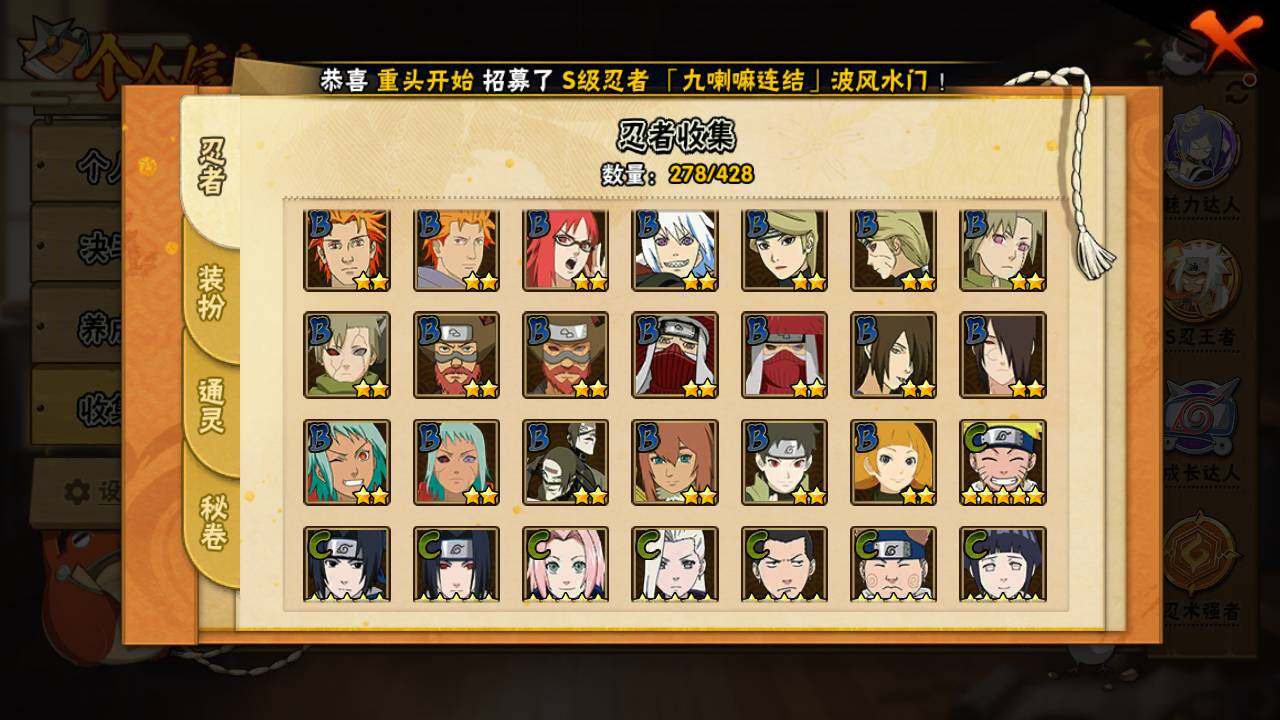 【S级忍者】:长门「秽土转生」(3星),猿飞日斩「秽土转生」(3星),波风水门「秽土转生」(3星),千手扉间「秽土转生」(3星),千手柱间「秽土转生」(3星),宇智波鼬「秽土转生」(3星),宇智波斑「秽土转生」(3星),宇