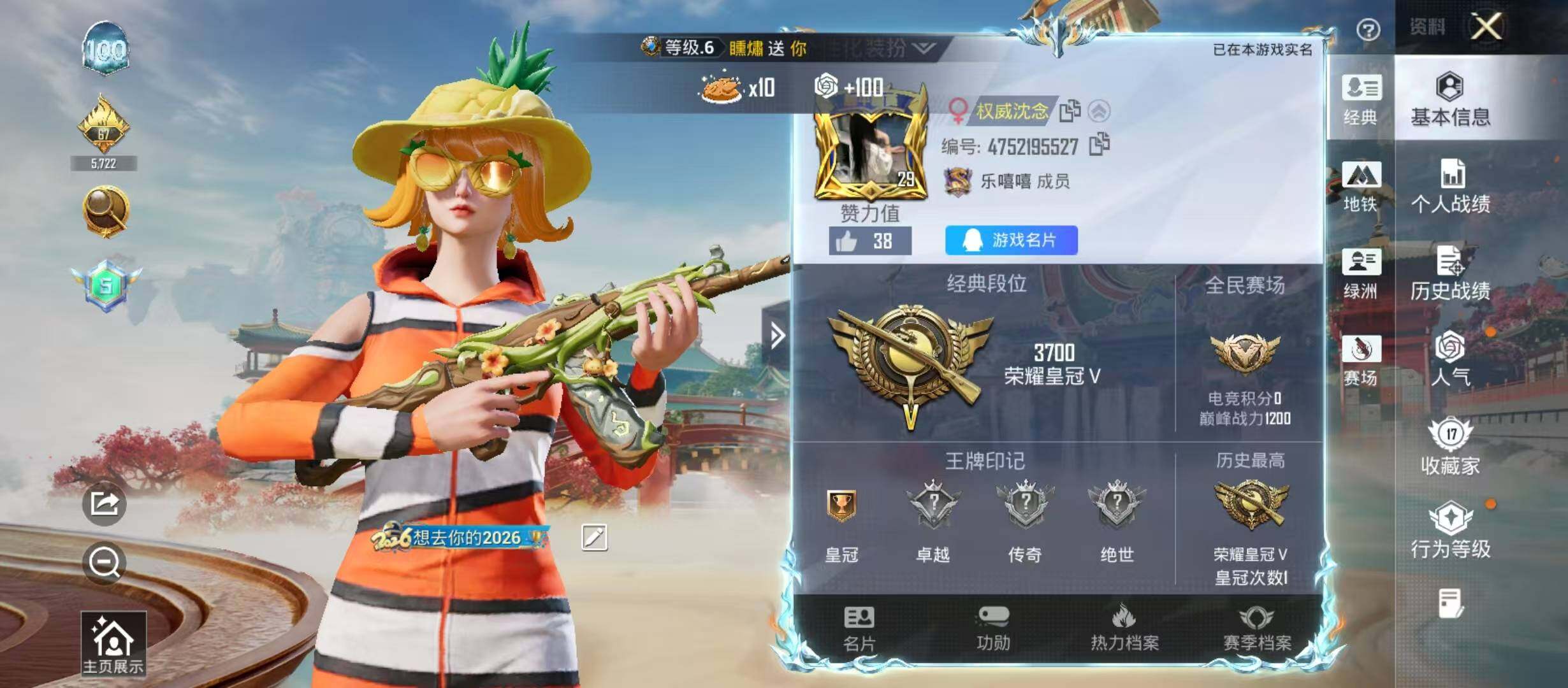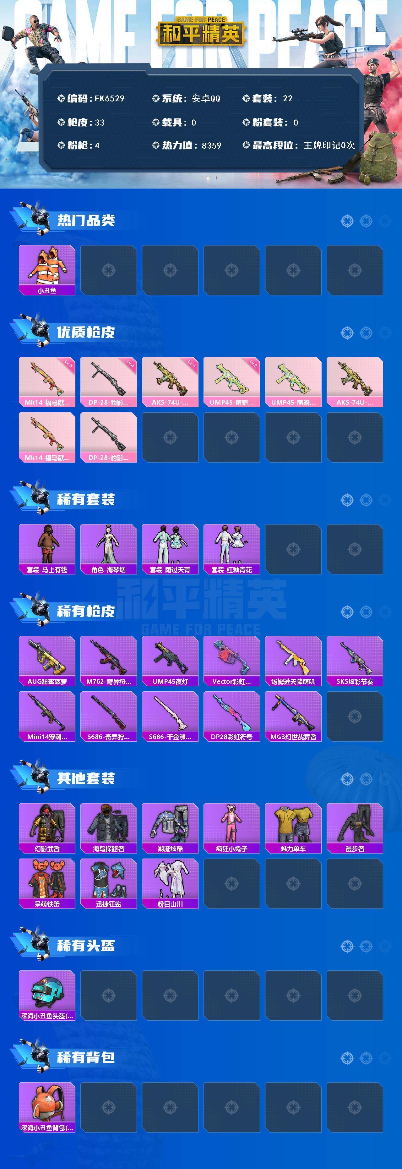 【FK6529】22套装/枪械4/装备37/战备30/热力值8359/二级UMP45-萌骑冒险/四级AKS-74U-森灵之息/五级Mk14-福马献瑞/四级DP-28-豹影疾电/小丑鱼/UMP45-萌骑冒险/AKS-74U-森灵之息/Mk14-福马献瑞/DP-28-豹影疾电/套装-马上有钱/角色-海琴烟/套装-雨过天青/套装-红釉青花/AUG-甜蜜菠萝/M762-奇异狩猎者/UMP45-夜灯/Ve