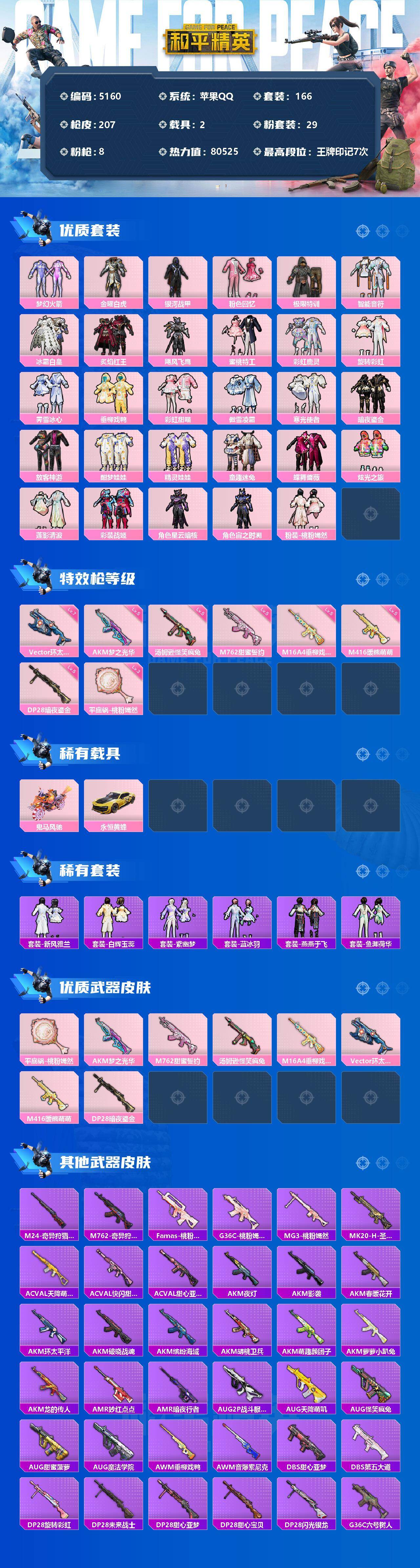 【5160】29粉装-8特效枪-2载具-80525热力值-7印记-166套装-207枪皮【稀有载具】:鬼马风驰,永恒黄蜂【优质套装】:梦幻火箭【热门品类】:赤蝎幽灵,派对舞王,都市猎人