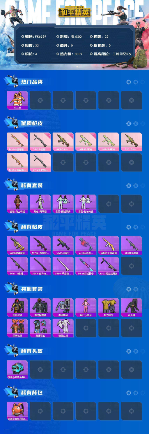 -小丑鱼-4特效枪-迅捷狂鲨-五级Mk14-福马献瑞-四级AKS-74U-森灵之息-地铁天赋已开】安卓 手Q-0粉装-4特效枪-0载具-0粉色飞行器-8359热力值-1王牌印记-22套装-33枪皮 【热门品类】:套装-小丑鱼 【粉色枪皮等级】:UMP45-萌骑冒险(二级),AKS-74U-森灵之息(四级),Mk14-福马献瑞(五级),DP-28-豹影疾电(四级) 【粉色枪皮】: