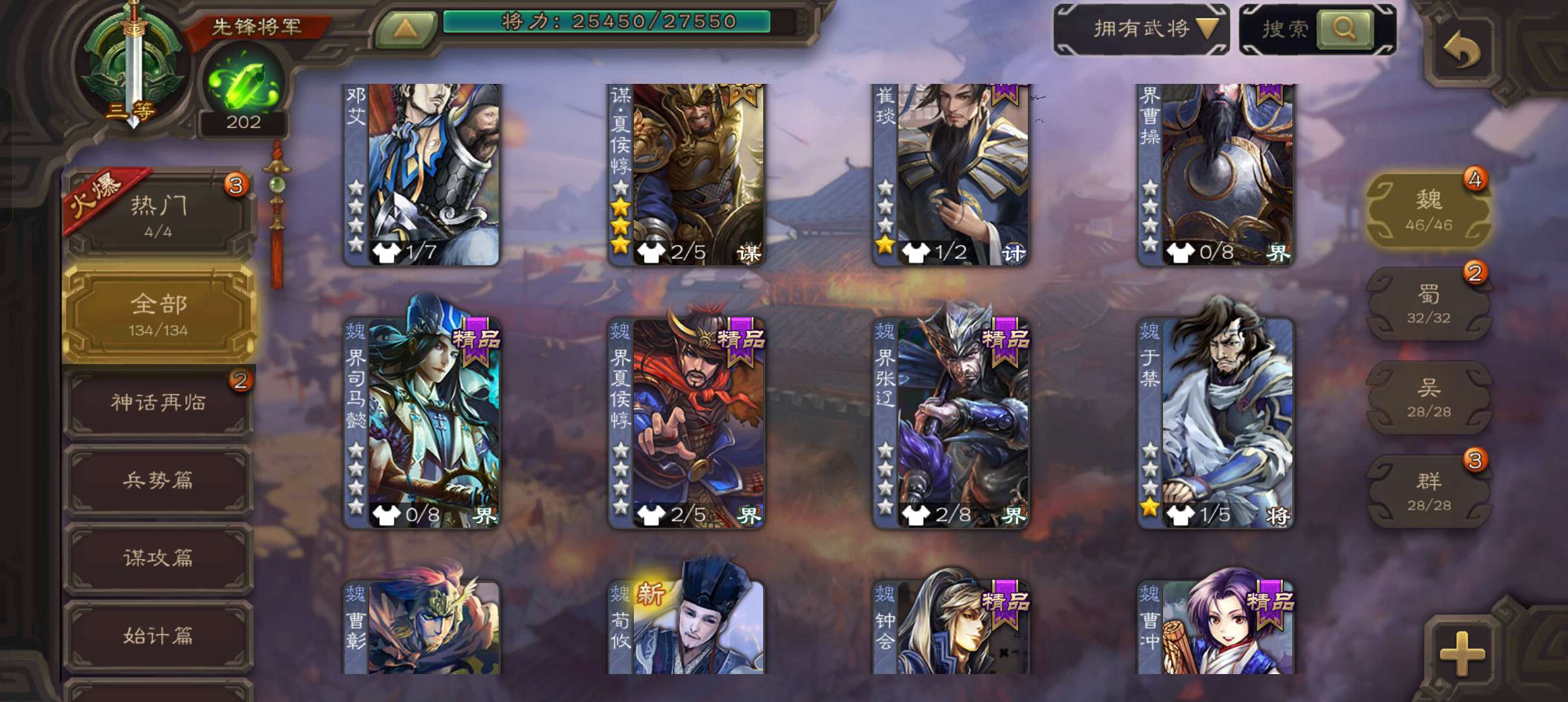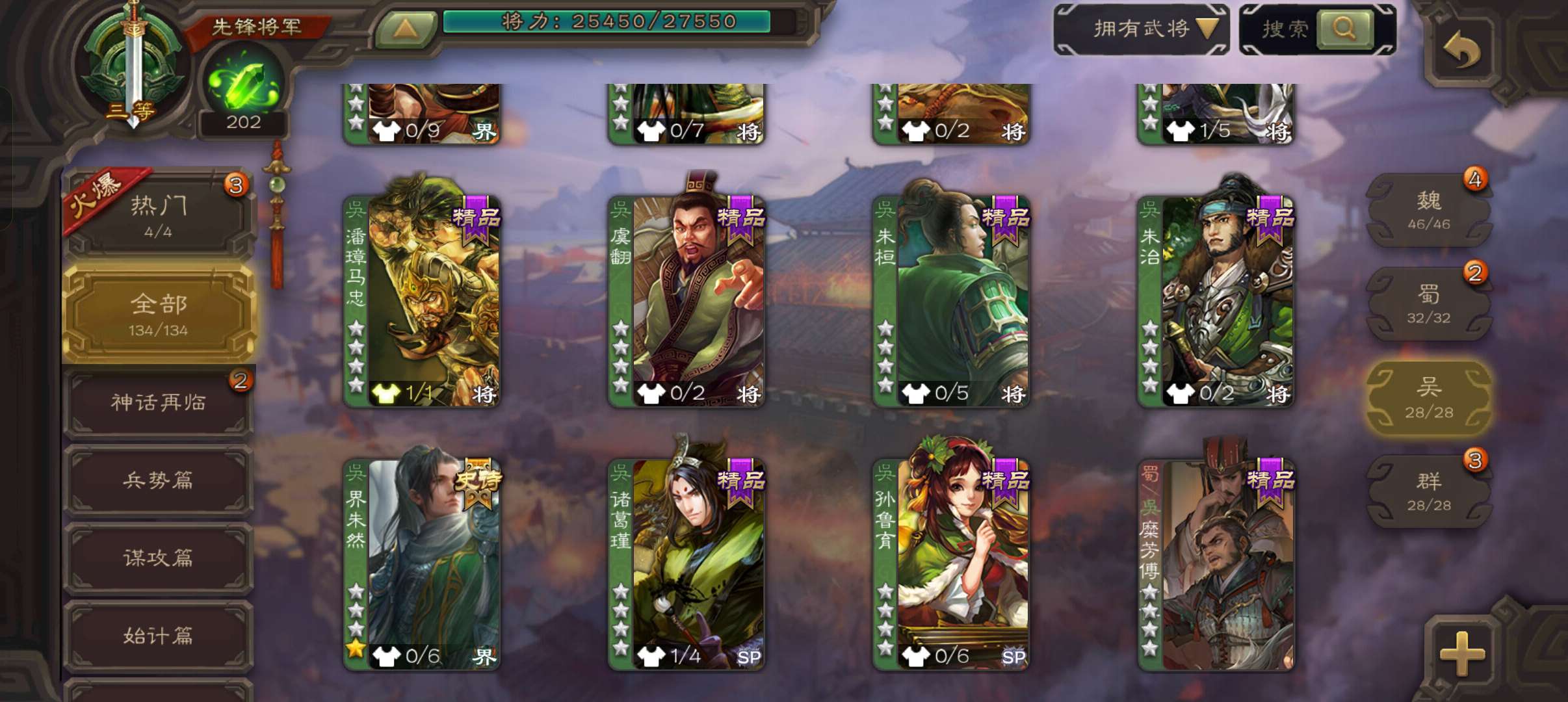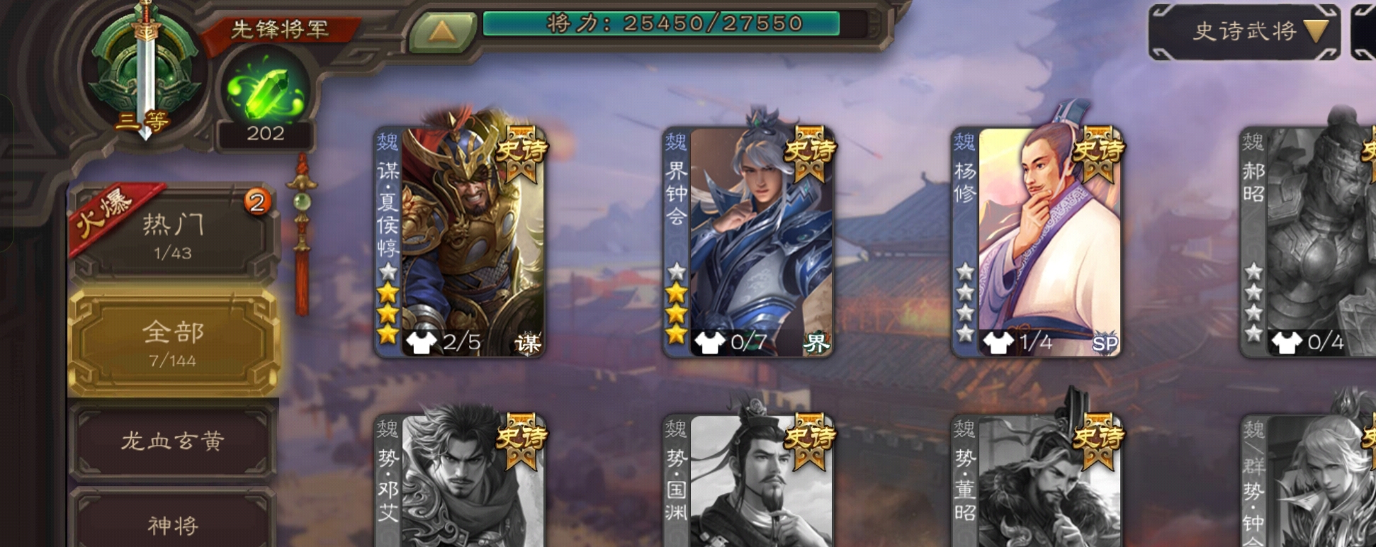 7史诗先锋,4.8万羽毛,谋夏侯惇界钟会沙摩柯神吕布界朱然杨修左慈,桥公崔琰界张嶷界曹休134将