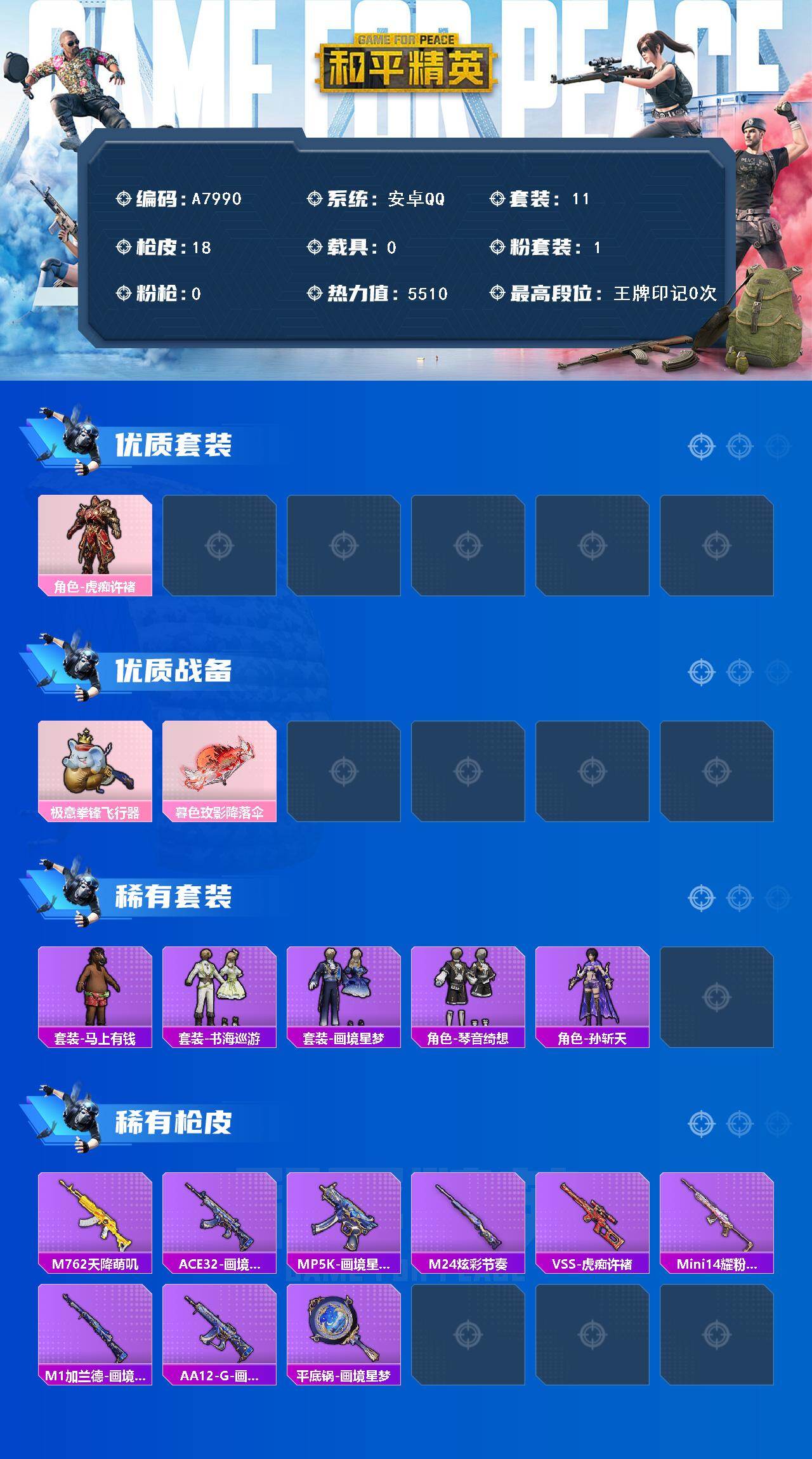 【A7990】安卓【小号】 手Q-1粉装-0特效枪-0载具-1粉色飞行器-5510热力值-2王牌印记-11套装-18枪皮