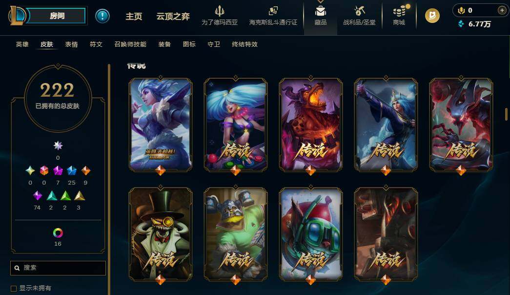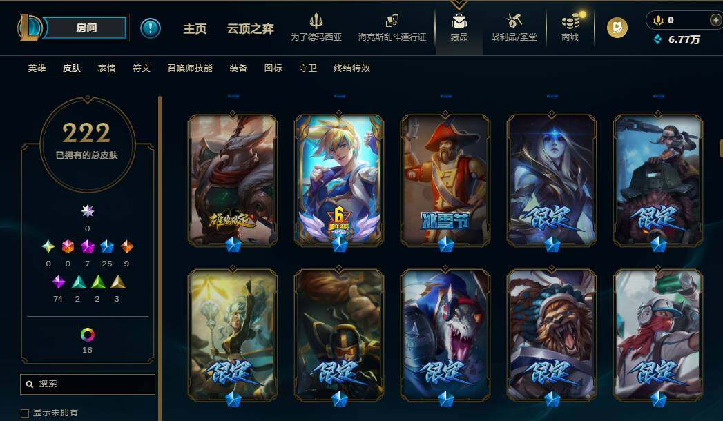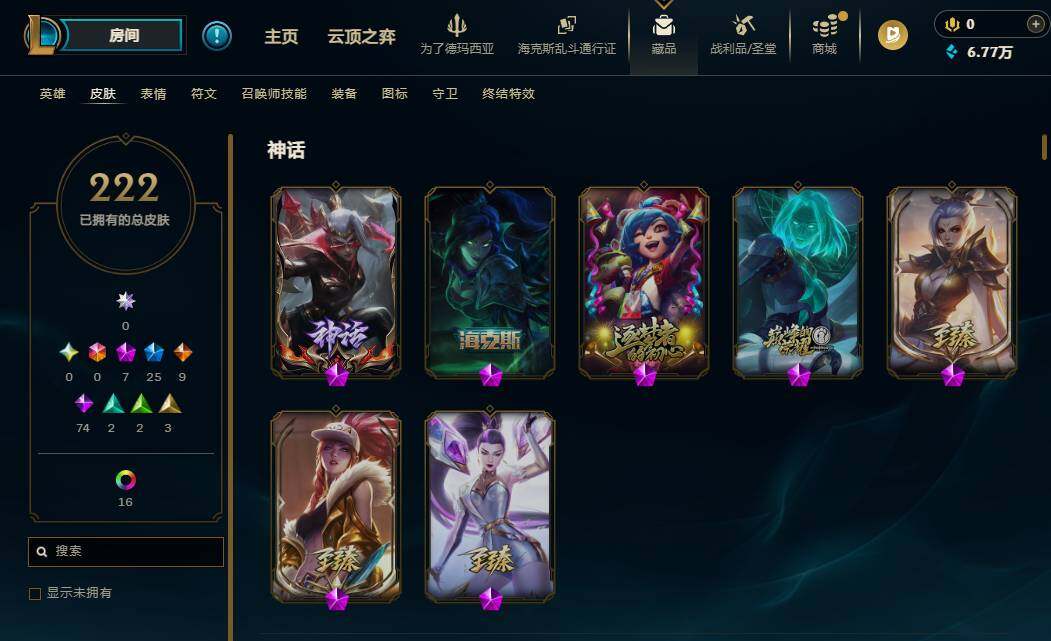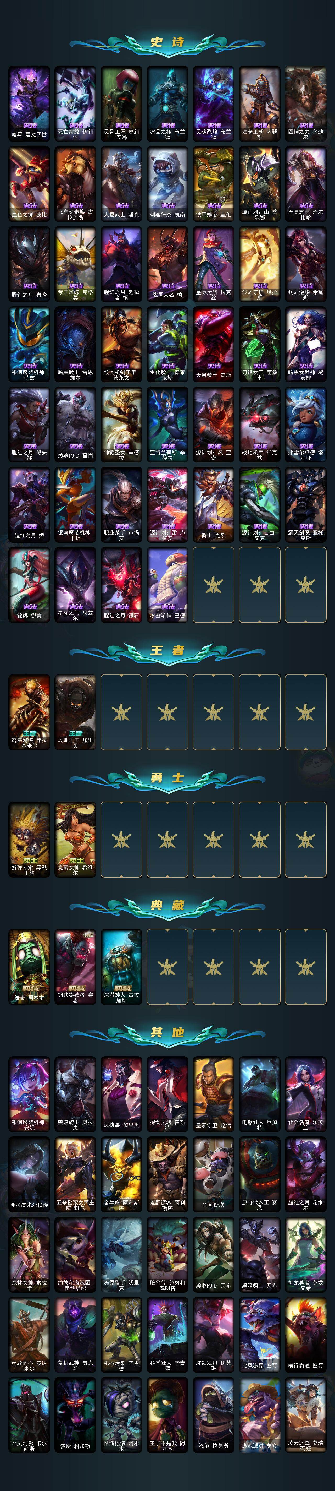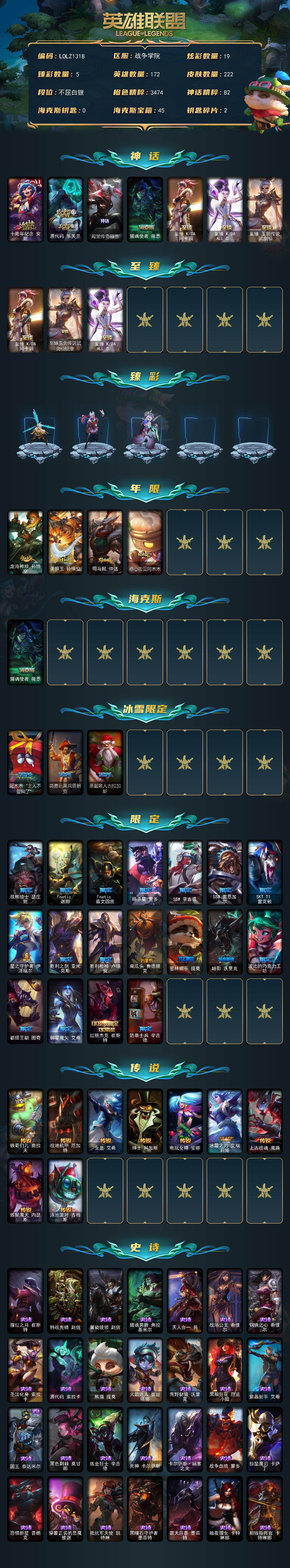 172英雄/222皮肤/7神话/25限定/5臻彩/19炫彩