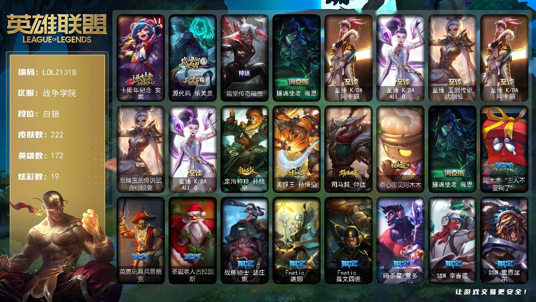 【LOLZ1318】172英雄/222皮肤/7神话/25限定/5臻彩/19炫彩/9传说/74史诗/白银/十周年纪念安妮/源代码乐芙兰/殿堂传奇薇恩/摄魂使者薇恩/至臻KDA阿卡丽/至臻KDAALLOUT卡莎/至臻玉剑传说武剑仙/至臻玉剑传说武剑仙锐雯/冰霜之刃艾瑞莉娅炫金/星之守护者卡莎热情之光/魔女阿卡丽虚荣/净雪之月莫甘娜冬虹/定海神珍孙悟空/美猴王孙悟空/司马懿仲达/点心宝贝阿木木/阿木木“主人不要我了”/英勇玩具兵普朗克/圣诞老人古拉加斯/战熊骑士瑟庄妮/Fnatic迦娜/Fnatic嘉