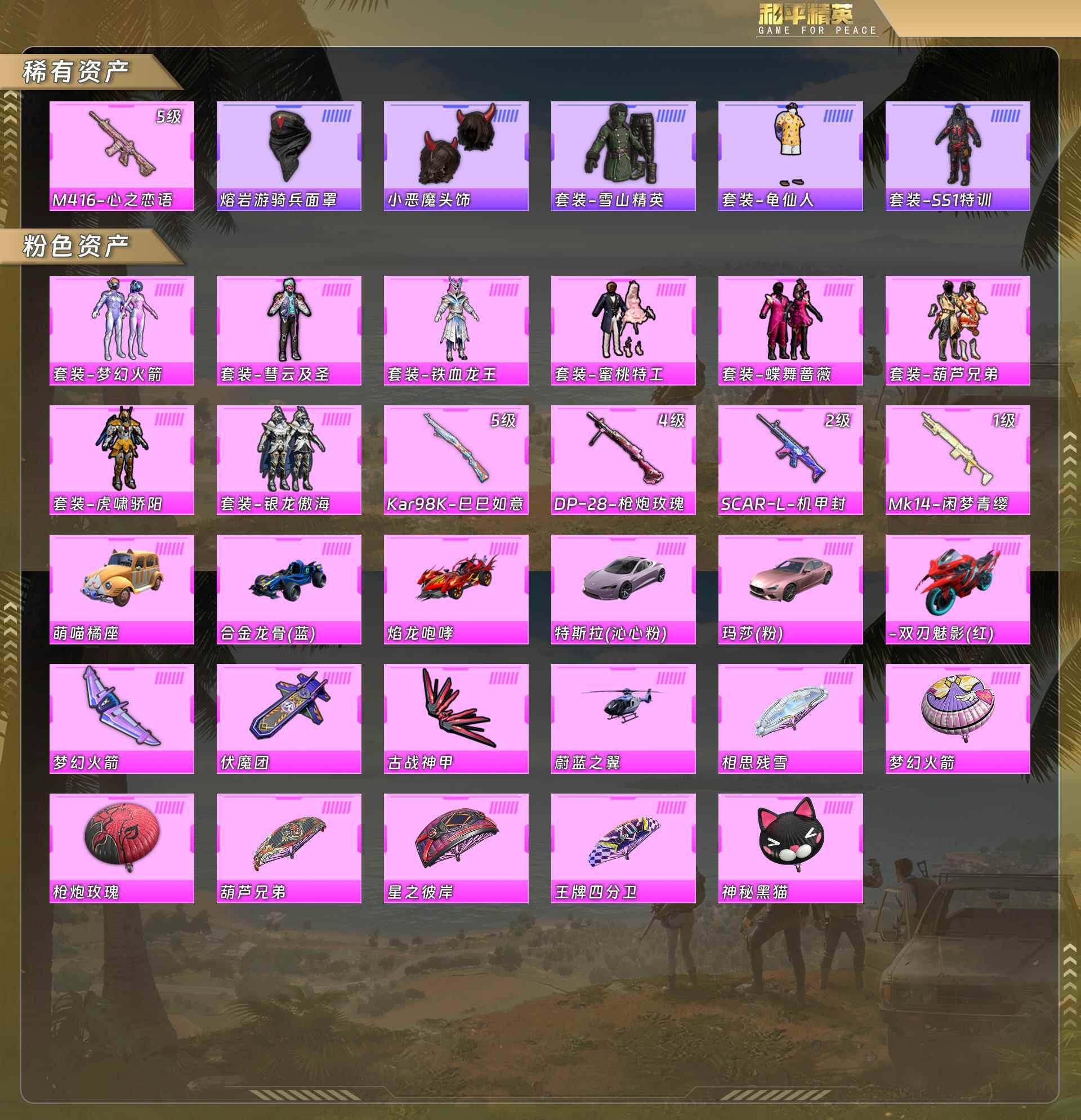 (8粉装-5粉枪-6载具)M4心之恋语5级/熔岩游骑兵面罩/小恶魔头饰/老六服/SS1特训/梦幻火箭/彗云及圣/铁血龙王/蜜桃特工/蝶舞蔷薇/葫芦兄弟/虎啸骄阳/银龙傲海/DP28枪炮玫瑰4级/SCAR机甲封神2级/Mk14闲梦青缨1级/萌喵橘座/合金龙骨(蓝)/焰龙咆哮/特斯拉(粉)/玛莎拉蒂(粉)/双人摩托双刃魅影(红) 没战神框 HP6565-3粉色飞行器-62127热力值-7王牌印记-1