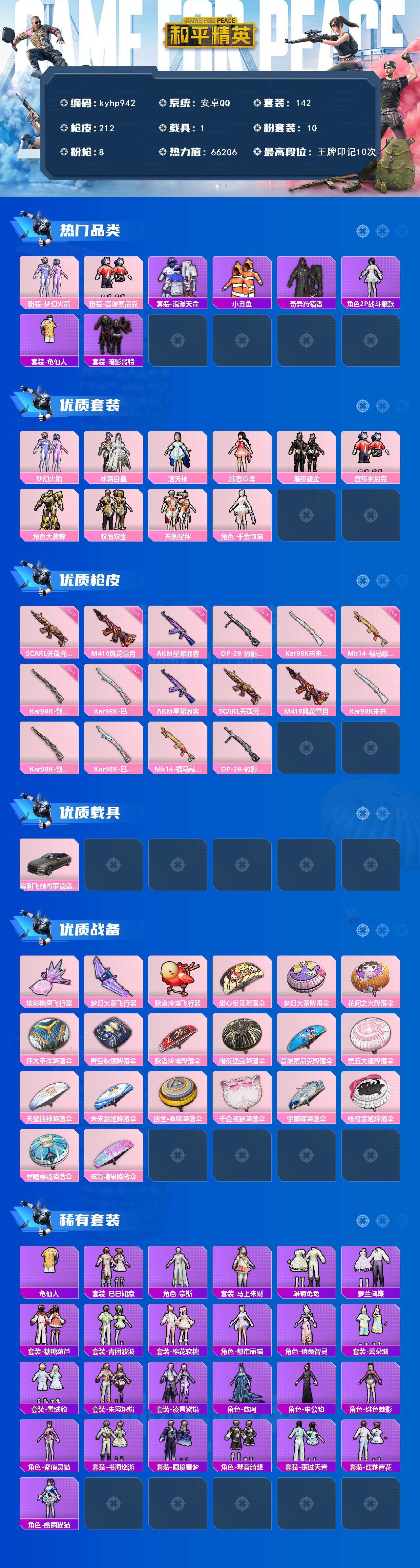 安卓 手Q-10粉装-8特效枪-1载具-3粉色飞行器-66206热力值-10王牌印记-142套装-212枪皮