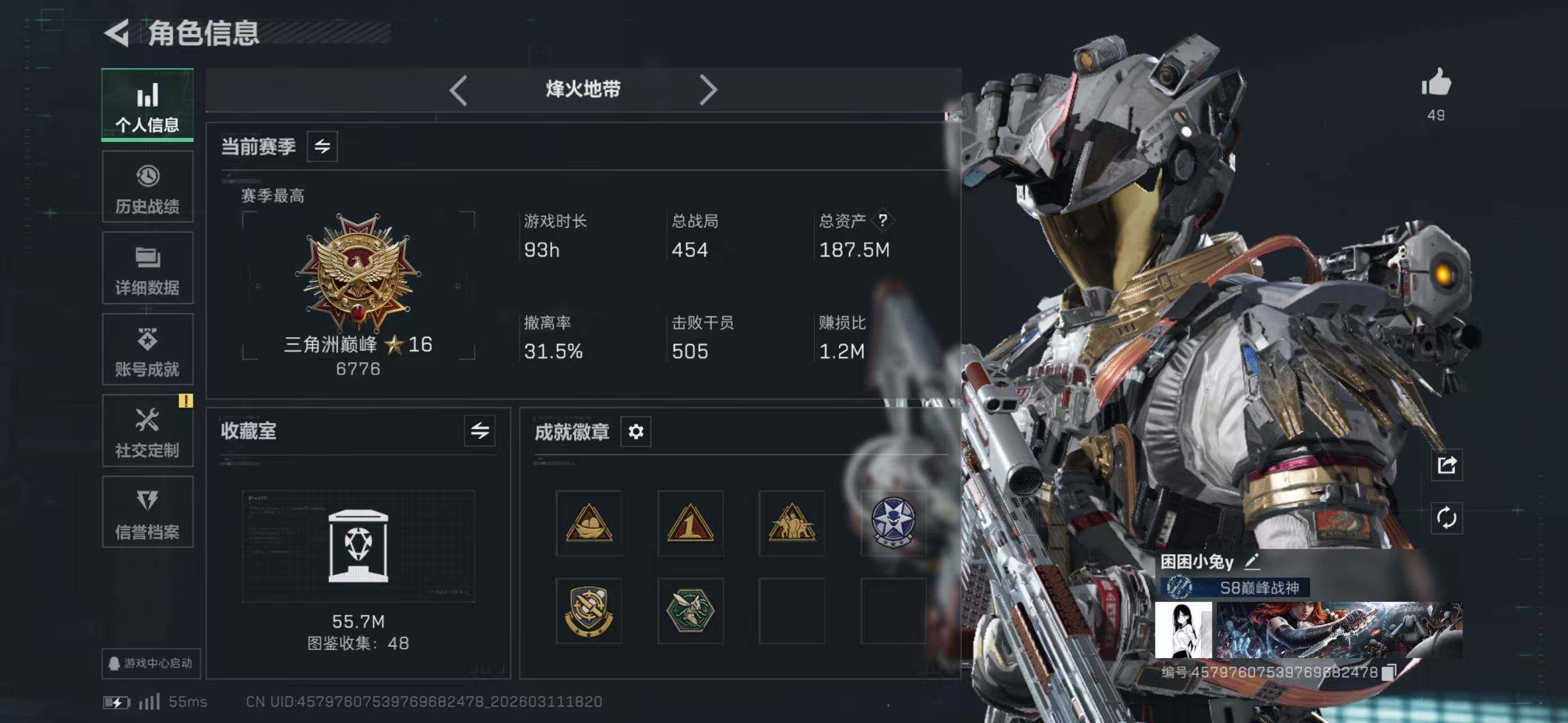 等级60总资产187.5m 纯币232065人物皮 凌霄戍卫 水墨 枪皮 优品b m7 刀皮 信条 特勤仓库8级 体力6级负重6级